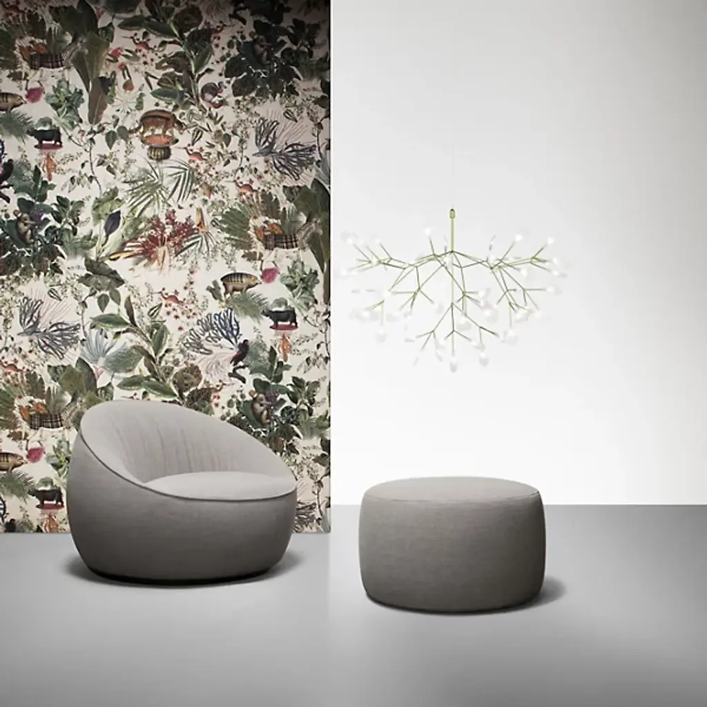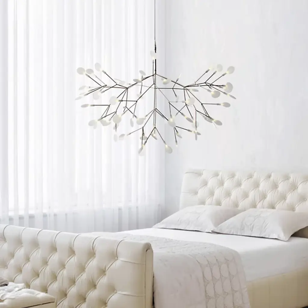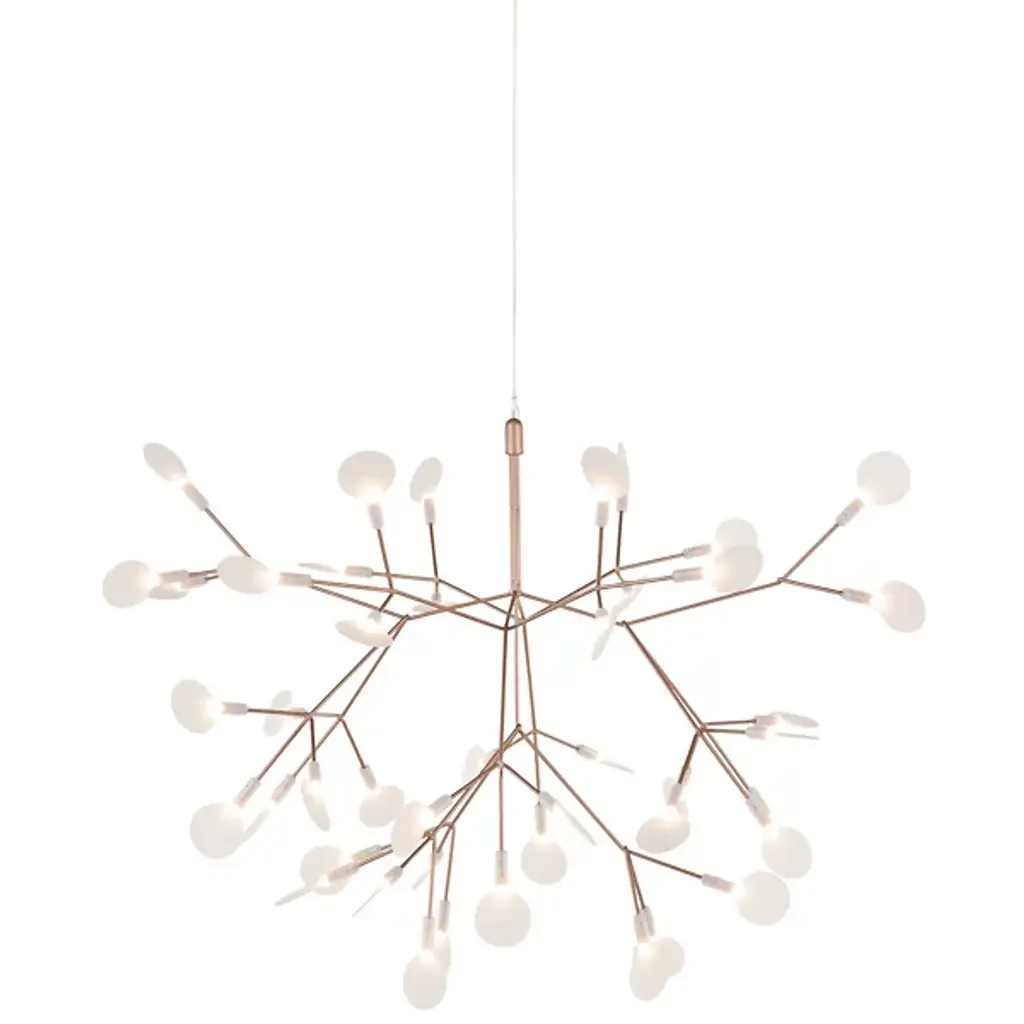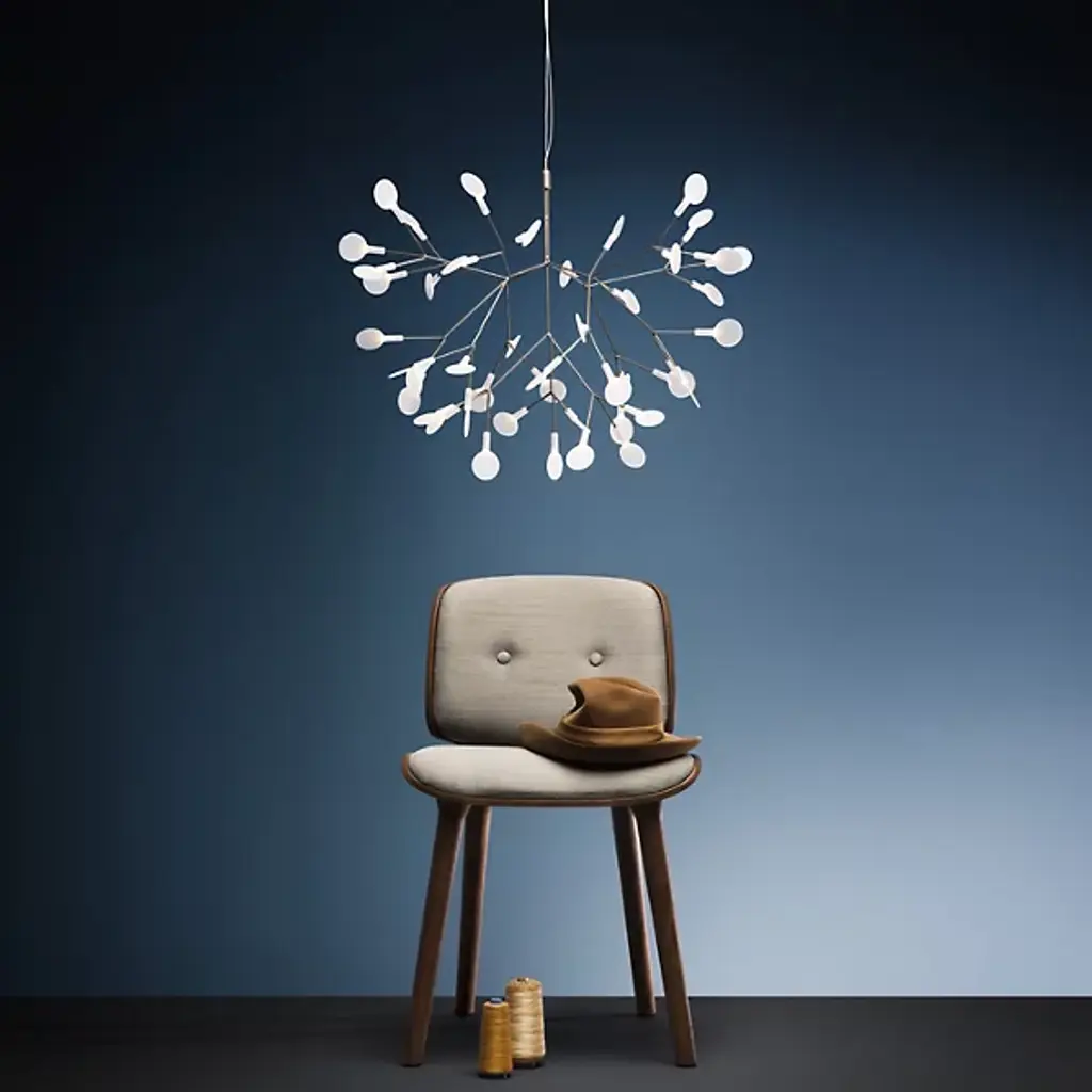 Designed by Bertjan Pot in 2013 for Moooi, the Heracleum III LED Chandelier is a decorative LED fixture with 45 rotatable polycarbonate lenses inspired by the Heracleum Plant. The white lenses ramify from one branch creating a technical, natural structure. By using the technique of conductive layers, the fixture remains delicate and thin. The Heracleum III LED Chandelier's leaves are not frozen in one position, they can be freely re-positioned by rotating them around their stem.
