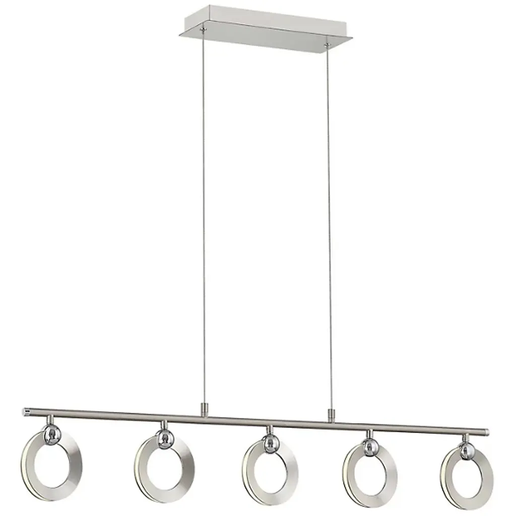 Cool glamour and precise geometry for the contemporary home. From the top of the rectangular canopy to the bottom of the ring-shaped shades, the design of the Hermosa LED Linear Chandelier by Justice Design Group is clean and elegant. In-between, a slender metal bar and spherical accents complete the overall sense of refinement. Over a kitchen island or long dining table, the shades work together to diffuse a broad and glare-free wash of ambient LED light.