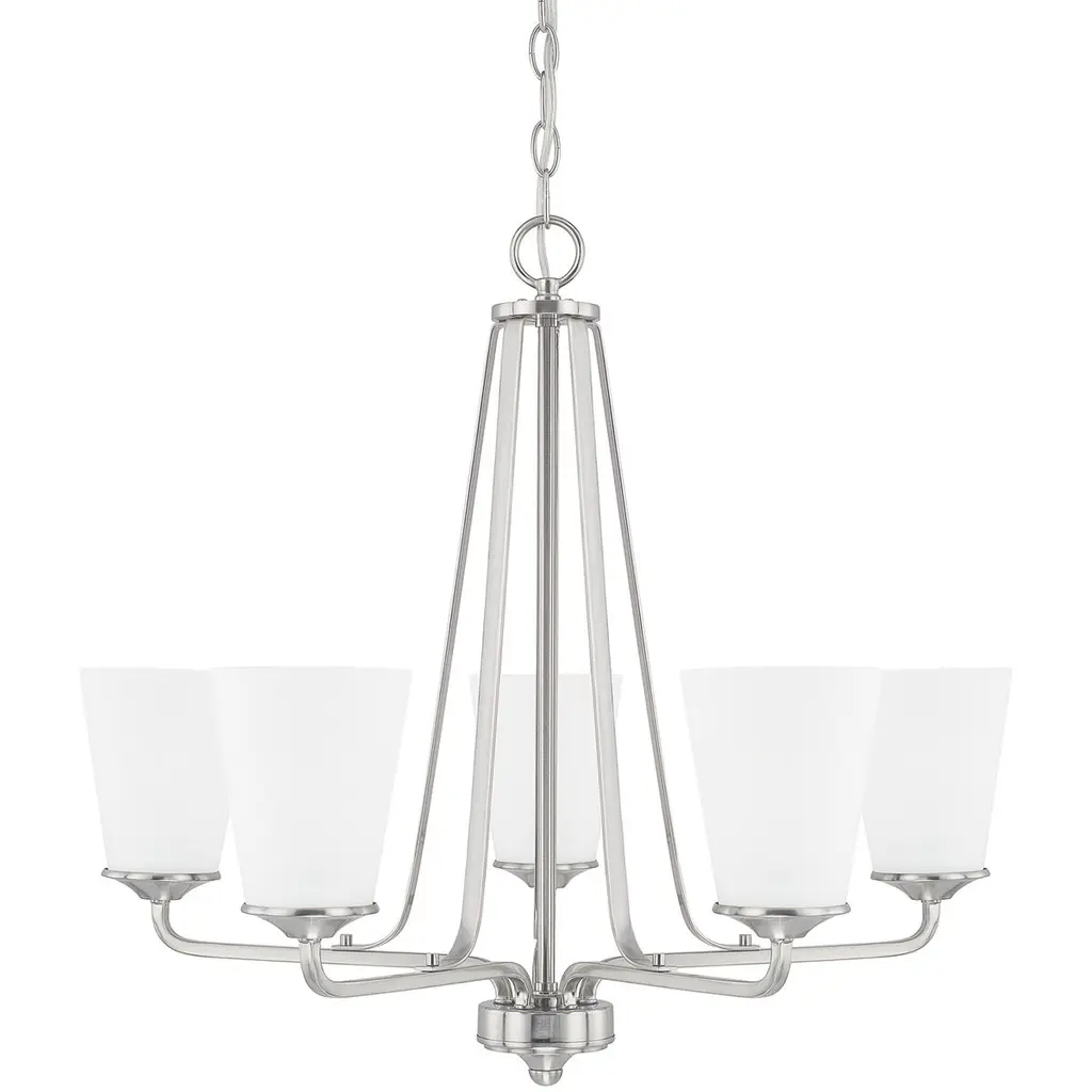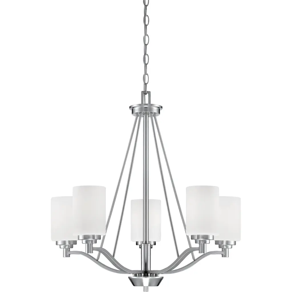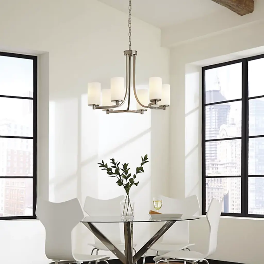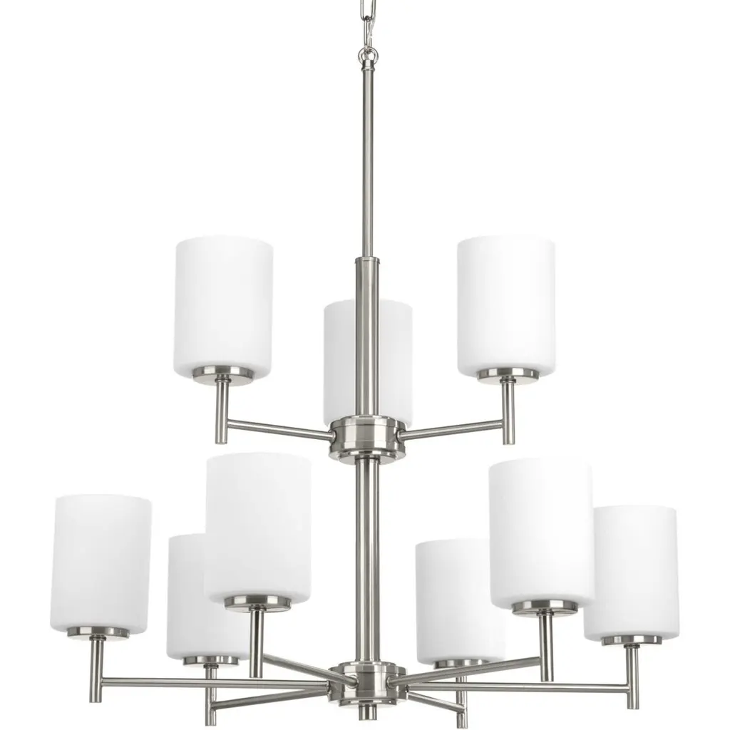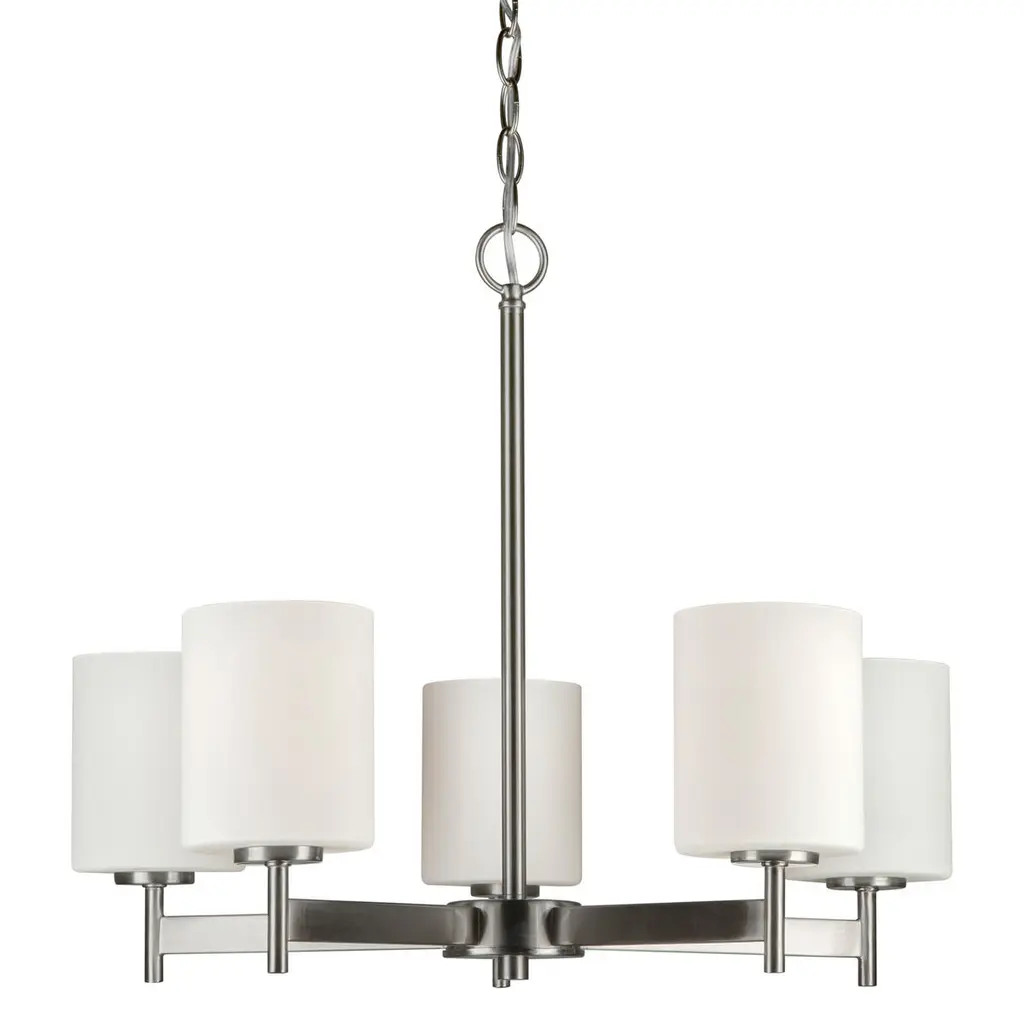 The Generation Lighting, formerly known as Sea Gull Lighting, Hettinger Chandelier features cylinders of Etched / White Inside glass as shades that evenly distribute ambient light to one's chosen space. The smooth, clean lines of the frame keep this fixture design minded, while allowing other focal points in the room to stand out. Height adjustable at installation.
