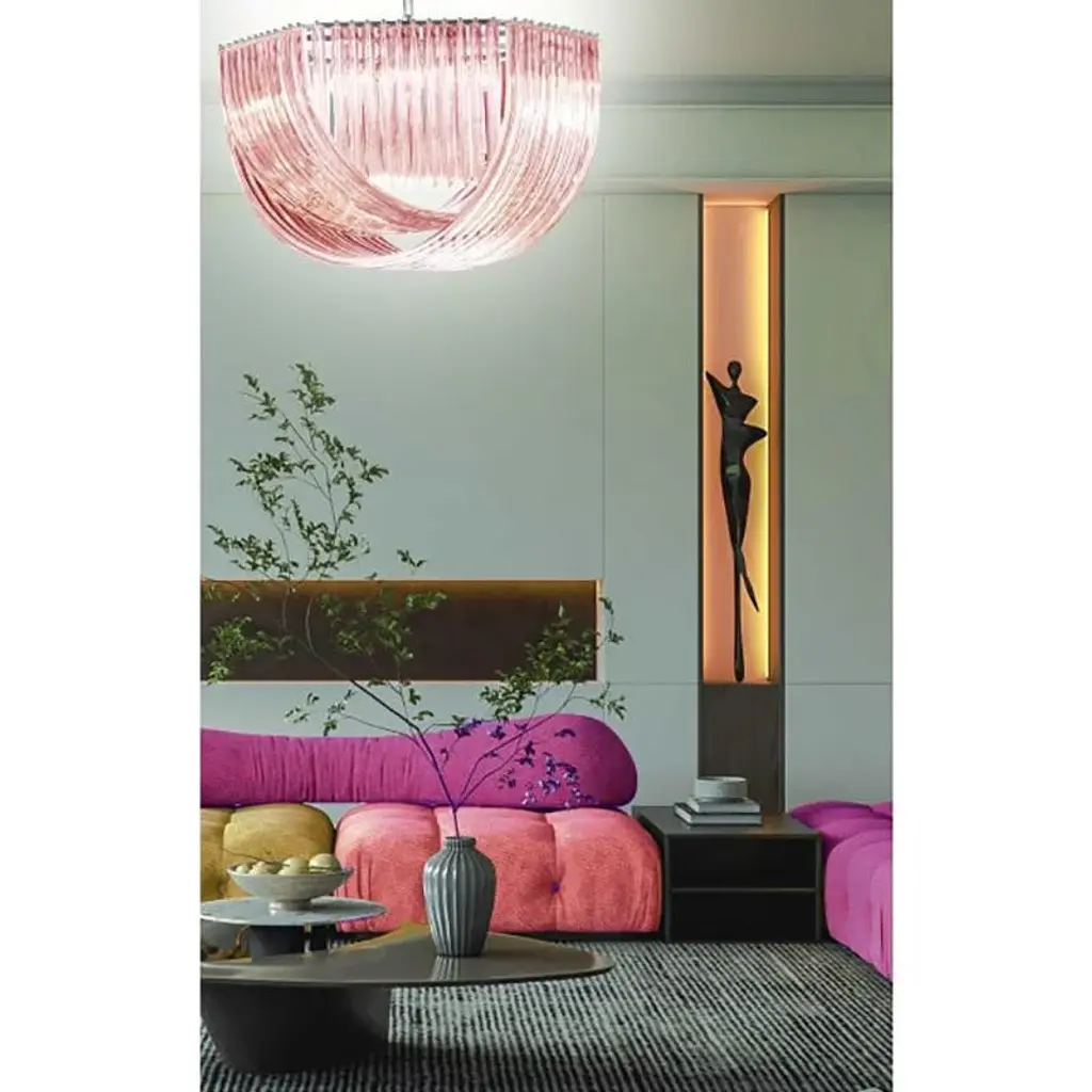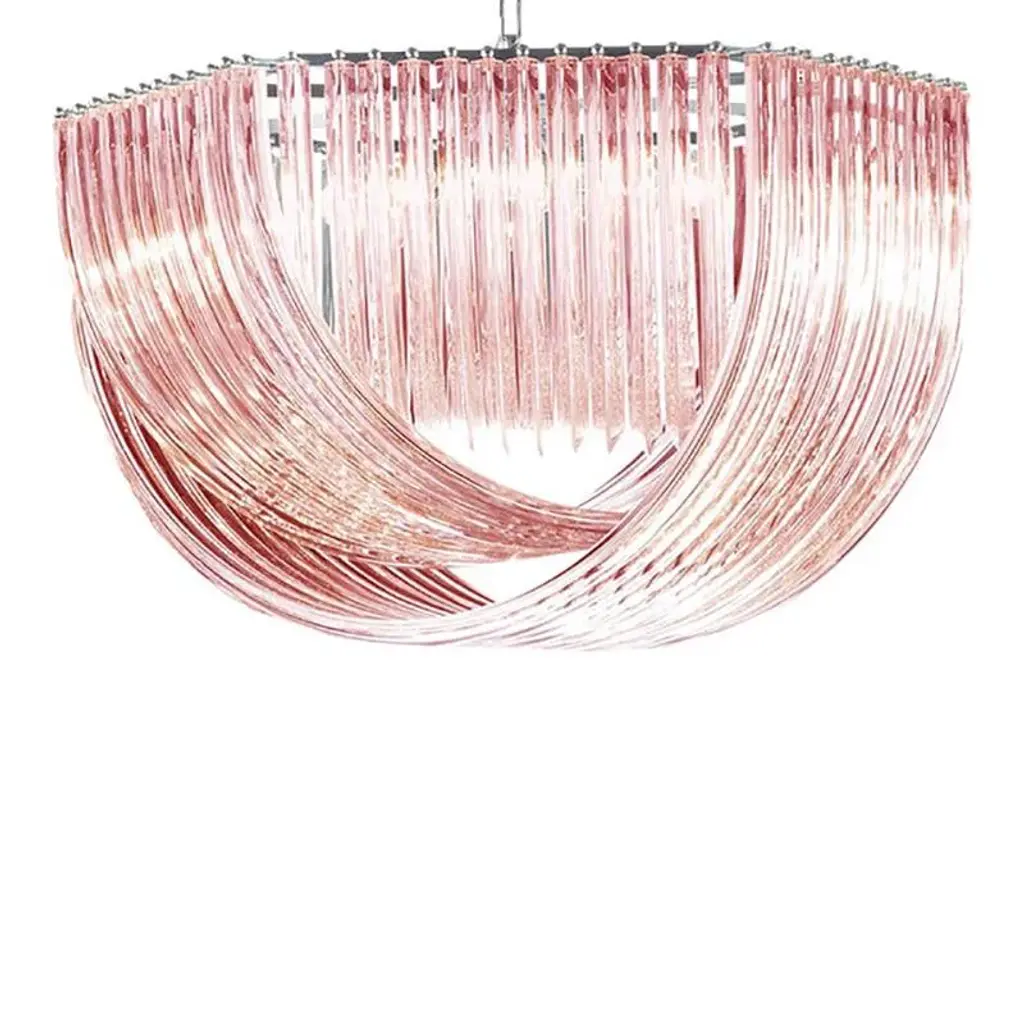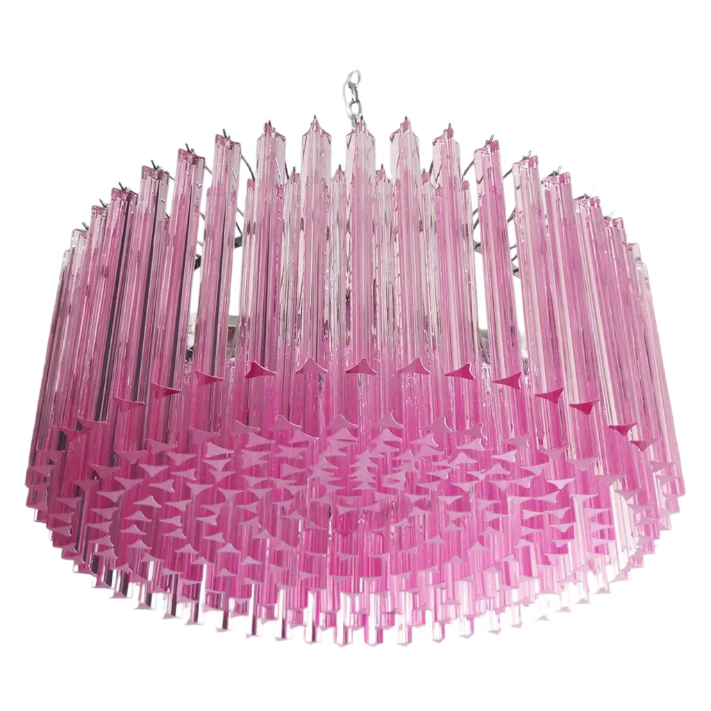 Contemporary pink romantic bundled TRIEDRO Murano glass chandelier. Exagonal structure for transparents bundled triedrons with 3 different arch sizes. Metal frame in chromed plating bath. Spare parts are included. Triedro arcs decorated in pink color. All made in Italy. US Plug (up to 110V).
