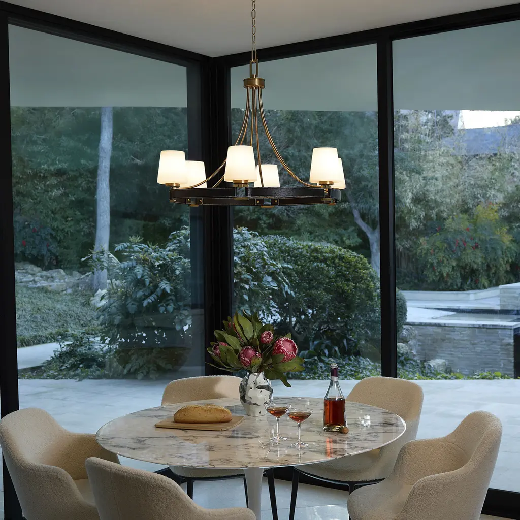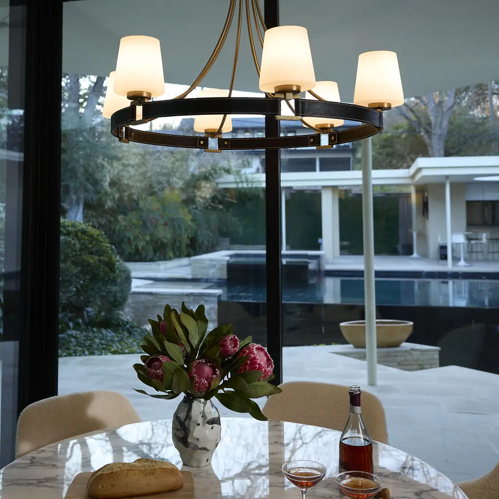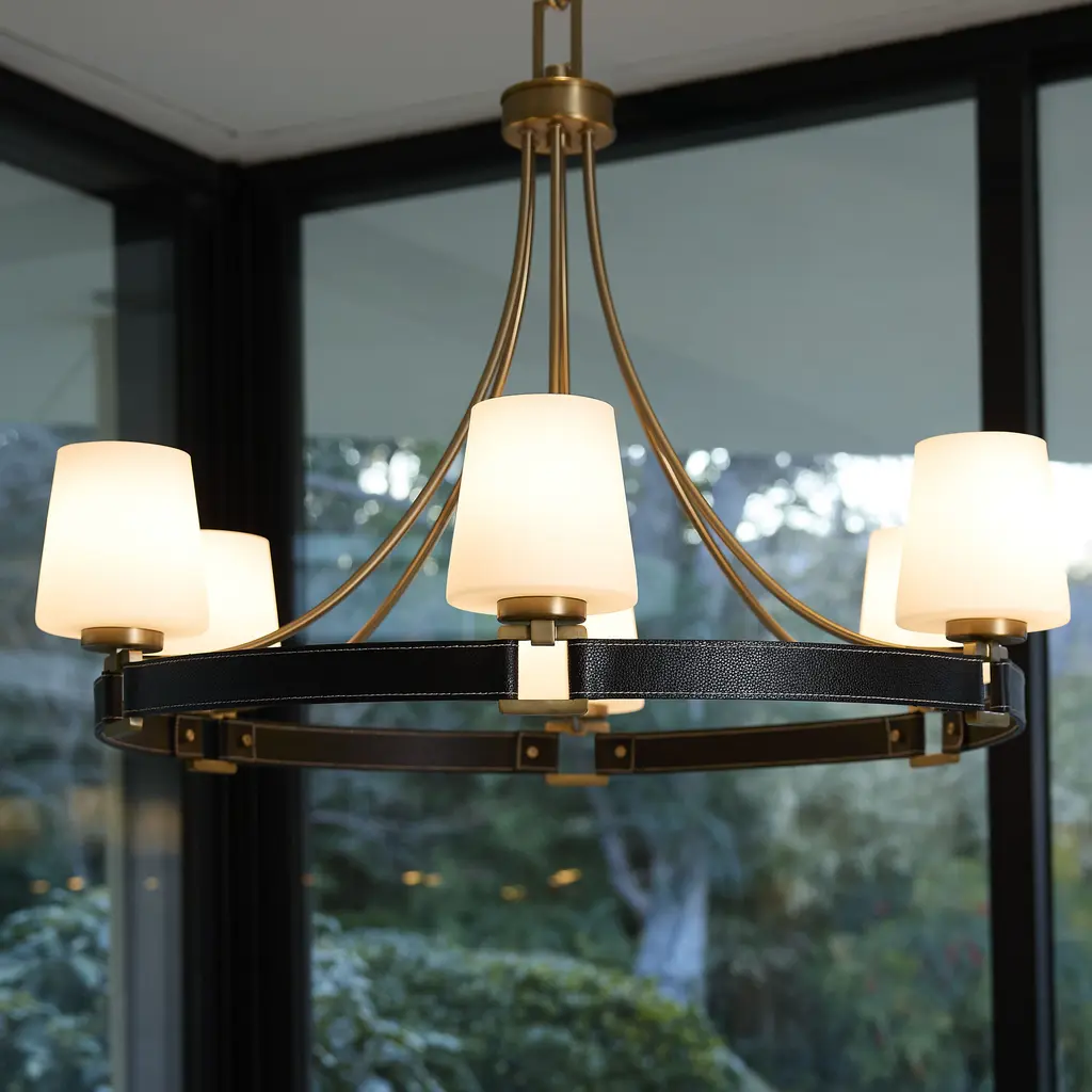 Hidalgo chandelier blends upscale design with mixed materials, featuring a crown-style frame. Fashion-inspired leather trims paired with buckle accents add contrast and depth to the rich design. This chandelier pairs beautifully with the matching wall mount, allowing you to create a cohesive look that seamlessly ties together traditional and casual spaces.
