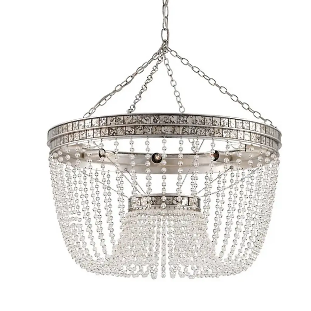 An elegant work of art, the silhouette of the Highbrow Chandelier from Currey & Company gracefully exemplifies its name. Wrought iron, crystal, and glass come together in the utmost tasteful arrangement, forming an ideal welcoming piece for modern homes. A series of chainlinks split and uphold a metal ring that, in turn, upholds several strands of crystal beads that swoop down and inward for an eye-catching demonstration. Eight bulbs in total rest within the piece, spreading an even glow that flows throughout the space.