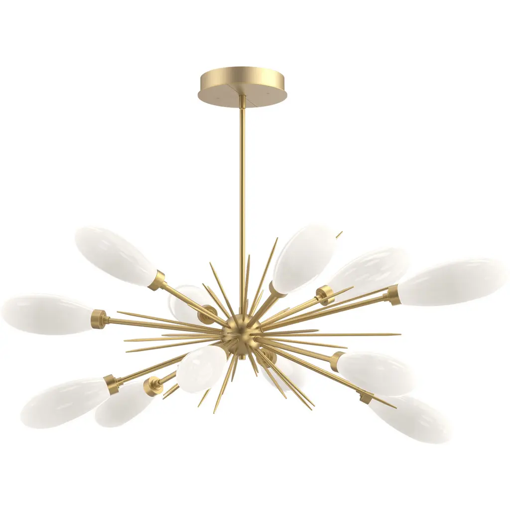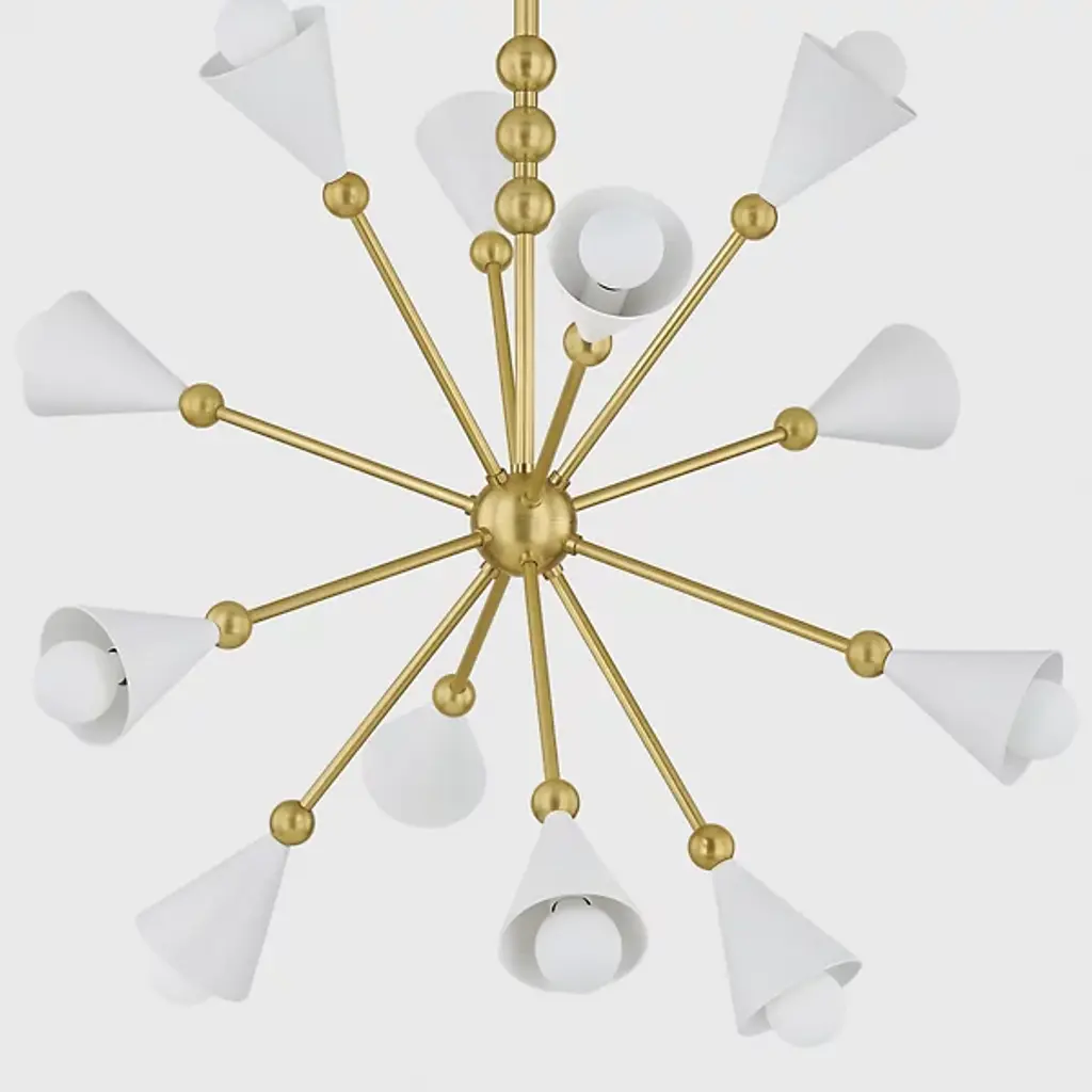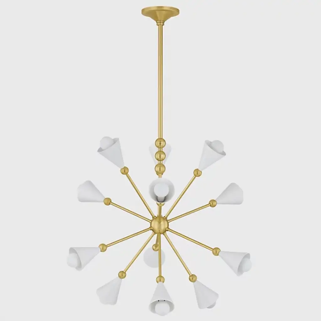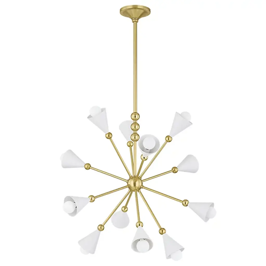 The Hikari Large Chandelier by DABITO from Mitzi's flamboyant Sputnik design exudes confidence and style, making it a standout piece in any room. Twelve soft white conical shades radiate from its Aged Brass satellite structure, casting light in all directions and creating a warm and inviting atmosphere. Small spheres adorn each arm like jewels, adding a decorative touch that enhances its mid-century modern revival charm. This chandelier perfectly blends bold design and elegant detailing, illuminating your space with a sophisticated flair.