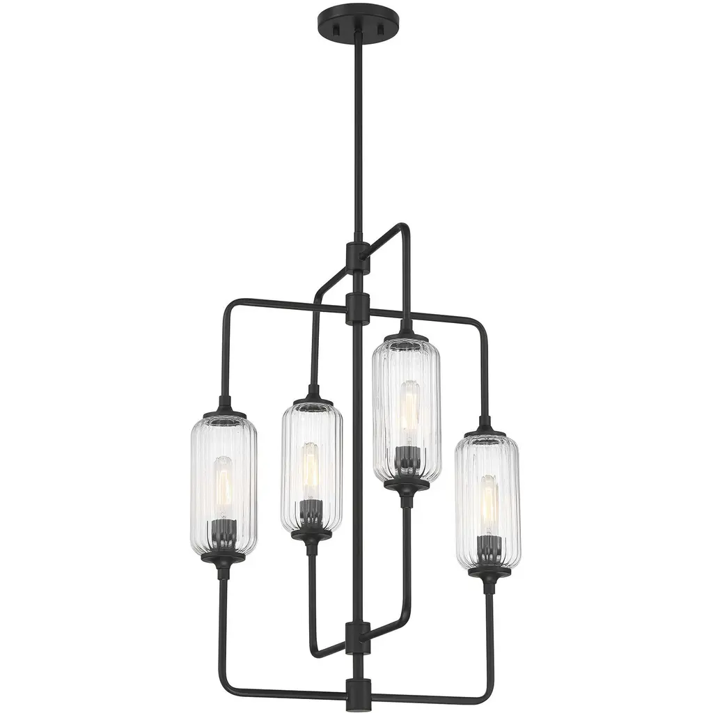 The Savoy House Holton 4-light foyer light showcases an inventive and geometric style with tall, rounded shades of clear ribbed glass and a slim, rounded structure finished in Matte Black. It will bring a big dose of style to any space Holton is 20" in width and has an adjustable height ranging from 28.25" to 82.25". It uses four standard size bulbs of up to 60 watts per bulb. Bulbs not included. Comes with four 12" downrods and one 6" downrod.