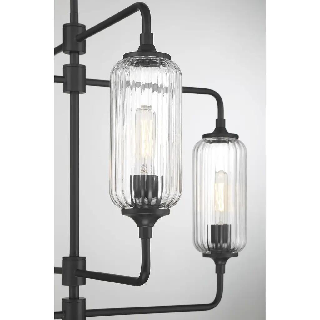The Savoy House Holton 4-light chandelier showcases an inventive and geometric style with tall, rounded shades of clear ribbed glass and a slim, rounded structure finished in Black. It will bring a big dose of style to any space Holton is 26" in width and has an adjustable height ranging from 20.25" to 74.25". It uses four standard size bulbs of up to 60 watts per bulb. Bulbs not included. Comes with four 12" downrods and one 6" downrod.
