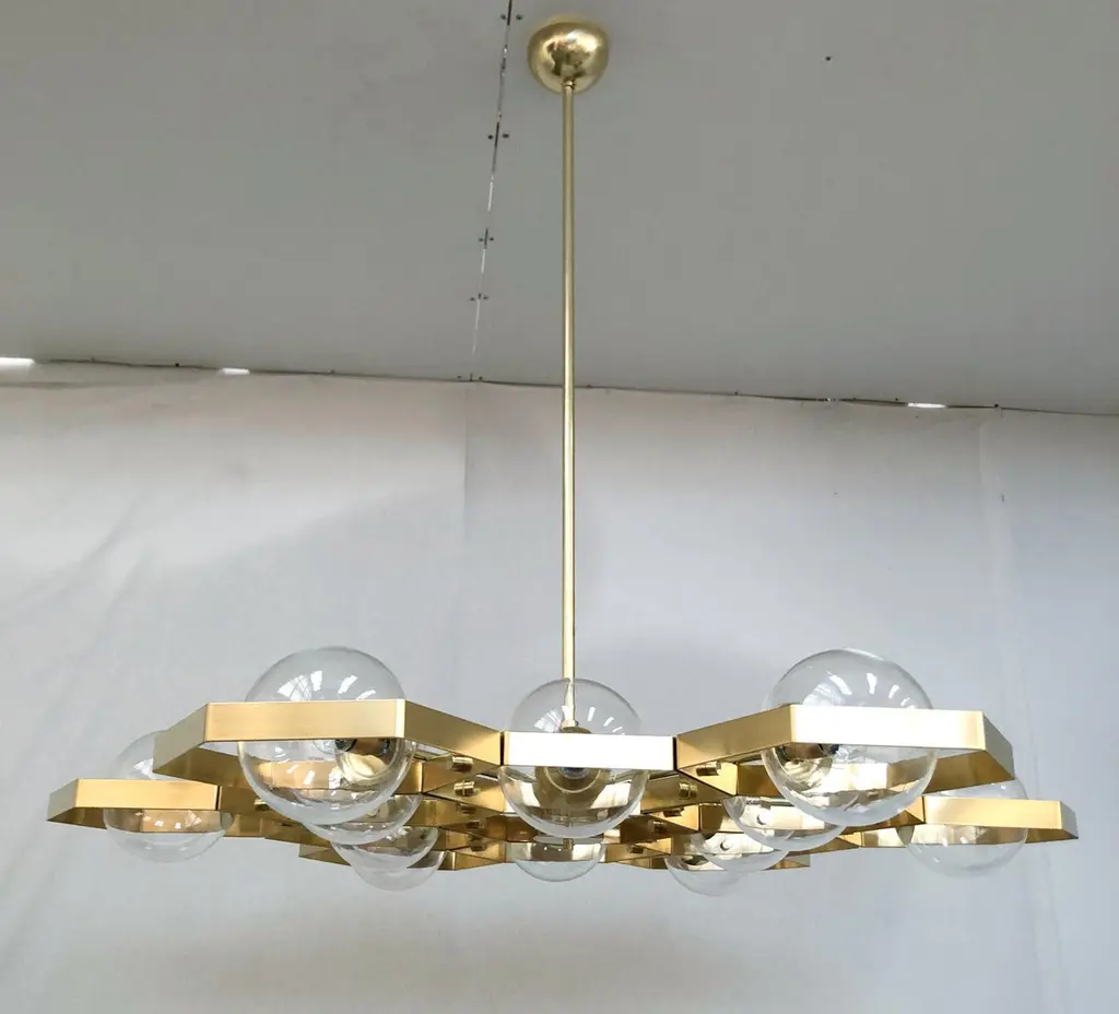 Italian modern chandelier with Murano glass globes, mounted on unlacquered brass frame / designed by Fabio Bergomi for Fabio Ltd, made in ItalyMeasures: Diameter 47 inches, height 45 inches with rod and canopy12 lights / E12 or E14 type / max 40W eachOrder only / This item ships from ItalyOrder Reference #: FABIOLTD C782The listed price applies to all Brass finishes : Unlacquered Natural Brass, Unlacquered Polished Brass, Lacquered Polished Brass, Lacquered Satin BrassOther finishes available with upcharge of $600 : Bronzed, Polished Chrome, Satin Chrome, Polished Nickel, Satin Nickel, Polished Black Nickel, Satin Black Nickel, Polished Copper, Satin Copper