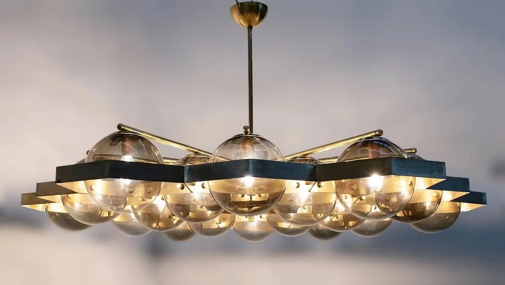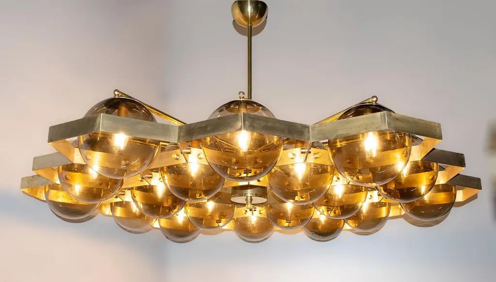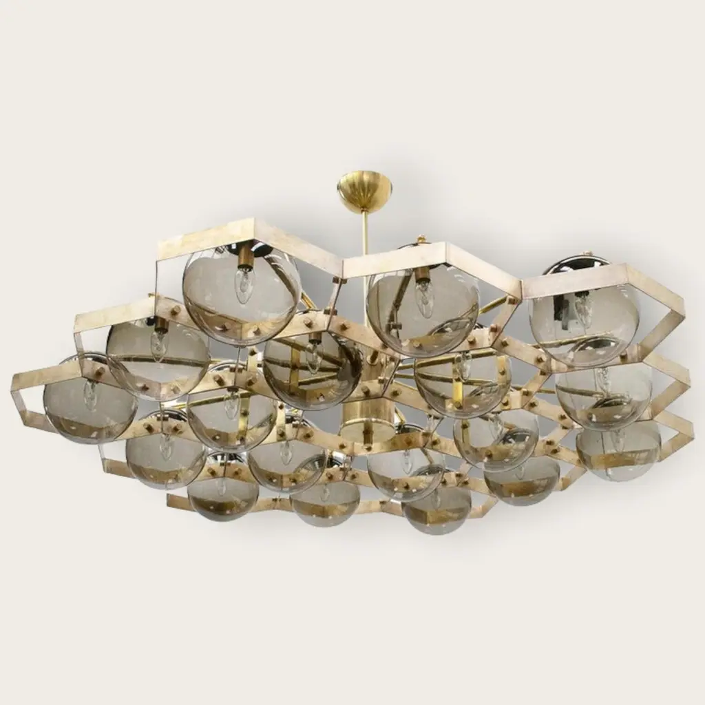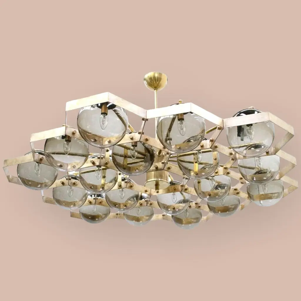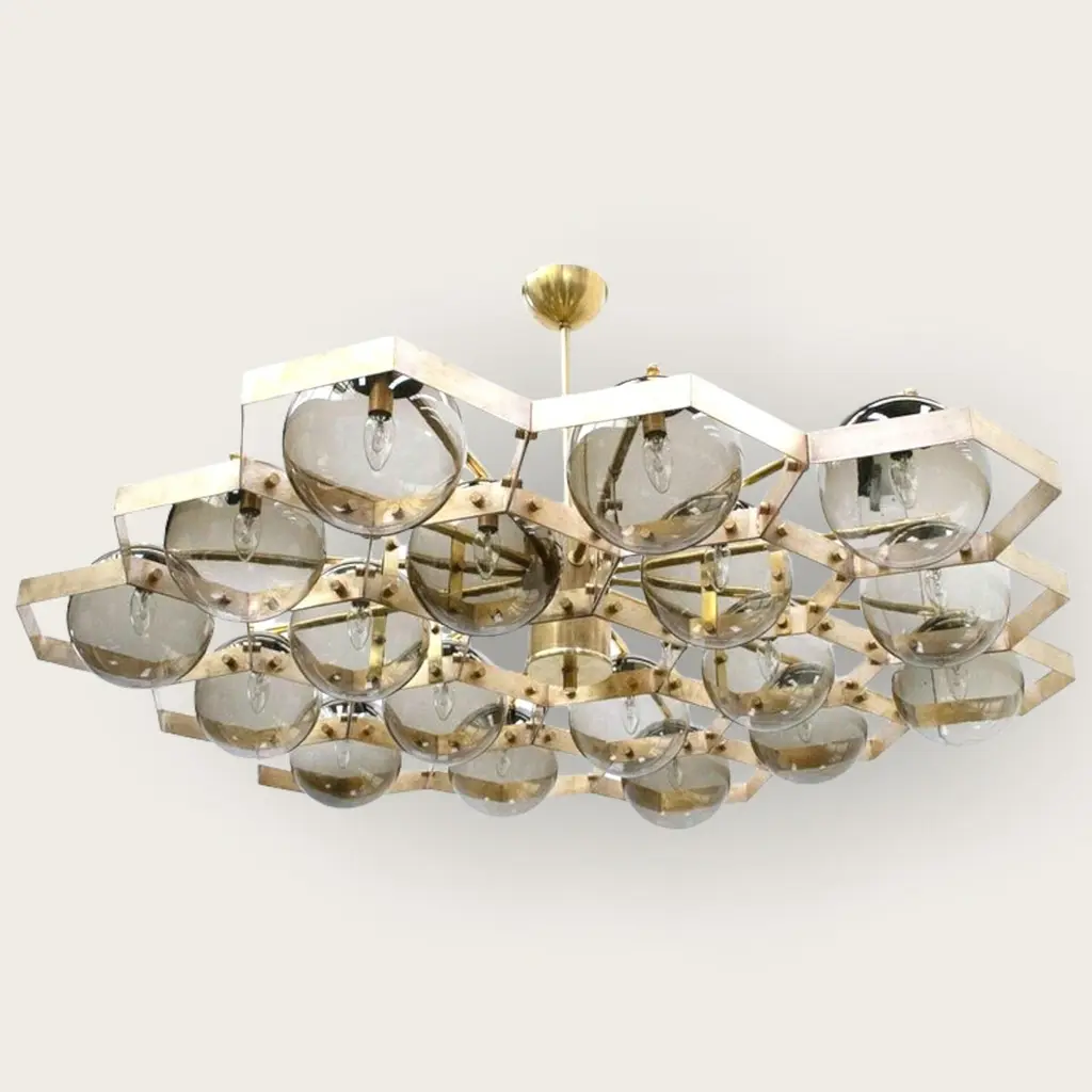 Italian modern chandelier with smoky Murano globes and natural brass finish / Designed by Fabio Bergomi for Fabio Ltd/ Made in Italy18 lights / E12 or E14 type / max 40W each Measures: Diameter 59 inches / height 30 inchesOrder only / This item ships from ItalyOrder reference #: FABIOLTD C458The listed price applies to all Brass finishes : Unlacquered Natural Brass, Unlacquered Polished Brass, Lacquered Polished Brass, Lacquered Satin BrassOther finishes available with upcharge of $2,500: Bronzed, Polished Chrome, Satin Chrome, Polished Nickel, Satin Nickel, Polished Black Nickel, Satin Black Nickel, Polished Copper, Satin Copper