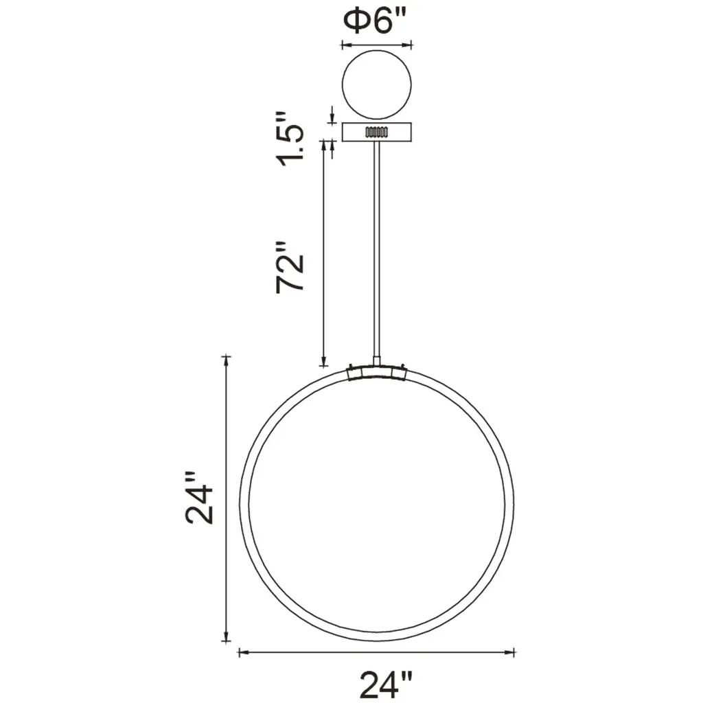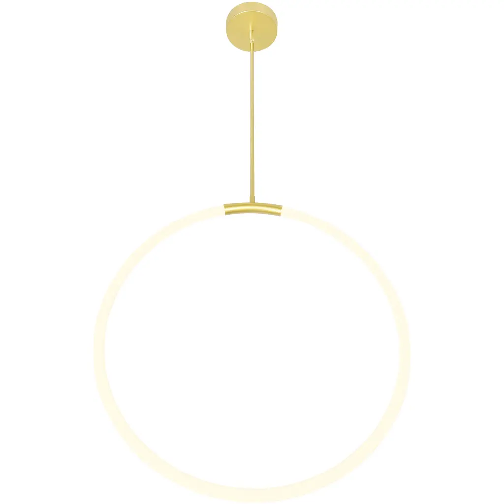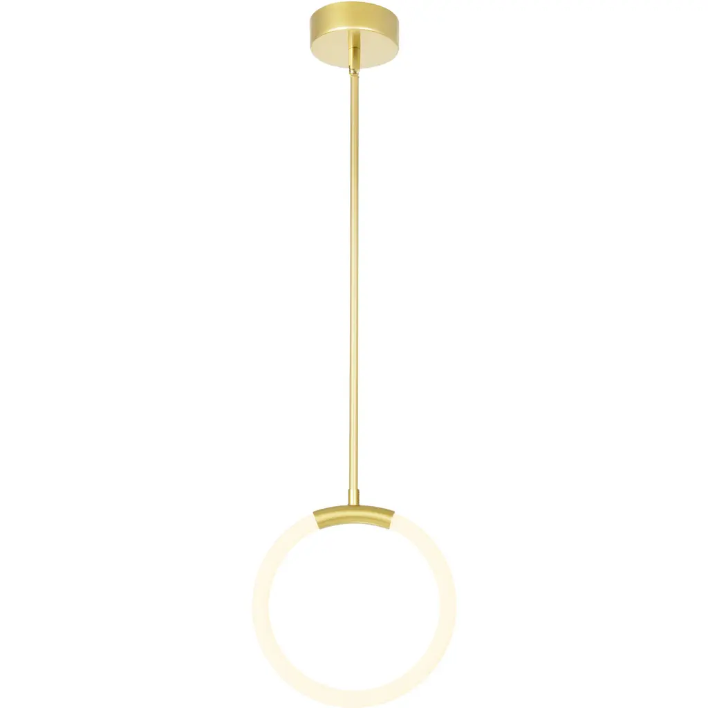 Make a bold, modern statement with the Hoops 24'' LED Chandelier in Satin Gold. With its sculptural silhouette, this contemporary pendant light features a single vertical LED ring suspended from a clean satin gold rod. Emitting a soft, ambient glow, this piece works beautifully in entryways, staircases, or any space that could use a touch of refined illumination. Its integrated LED technology ensures energy efficiency and long-lasting brightness, while its minimalist elegance brings visual interest without overwhelming the room. Finish: Satin Gold Light Count: Integrated LED Light Source: LED, No Bulb Required Adjustable Hanging Height: Yes Material: Metal and Acrylic Style: Modern / Minimalist / Geometric