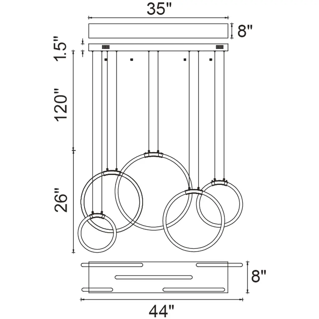 Make a bold lighting statement with the Hoops 44'' 5-Light LED Chandelier in Satin Gold. Designed for modern interiors, this multi-ring pendant fixture showcases five integrated LED rings cascading at varying heights from a minimalist rectangular canopy. The Satin Gold finish offers dramatic contrast, while the suspended circular design provides architectural interest without overwhelming your decor. Whether in a double-height foyer, stairwell, or expansive dining space, this chandelier brings both brilliance and style to your home. Finish: Satin Gold Light Count: Integrated LED (5 Rings) Light Source: LED, No Bulb Required Adjustable Hanging Height: Yes Material: Metal and Acrylic Style: Modern / Minimalist / Architectural
