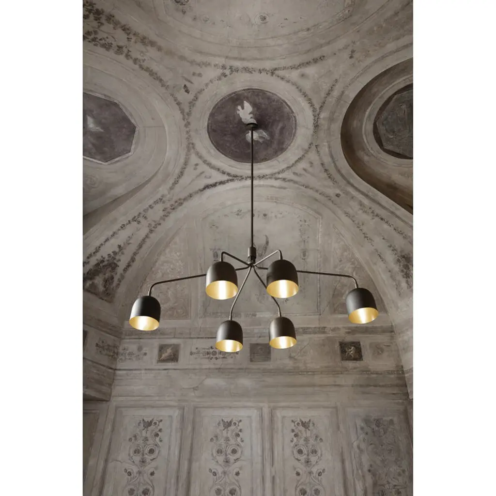 GUBI’s Howard chandelier is designed by the designer duo Space Copenhagen. Inspired by the rough and industrial esthetics of New York, Howard is a contemporary yet luxurious eye-catcher that brings a welcoming atmosphere to your home. The sculptural lamp consists of sleek arms and six brass shades finished with a dark gunmetal surface. However, the inner surface of the shades glows in shiny brass, creating a pleasantly warm light over the dining table or sofa group.