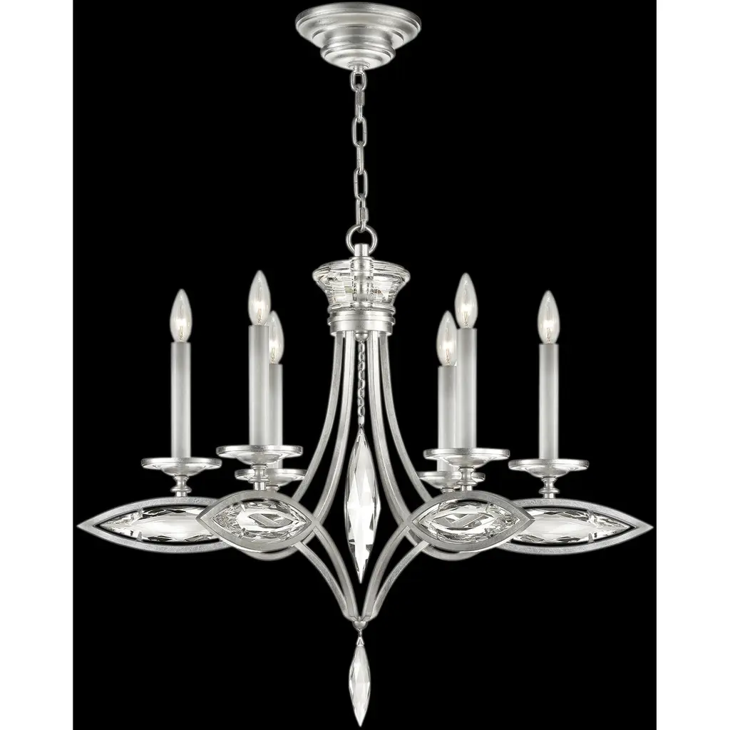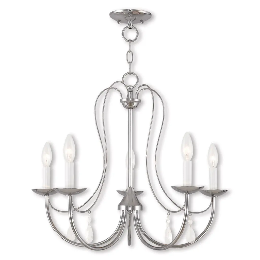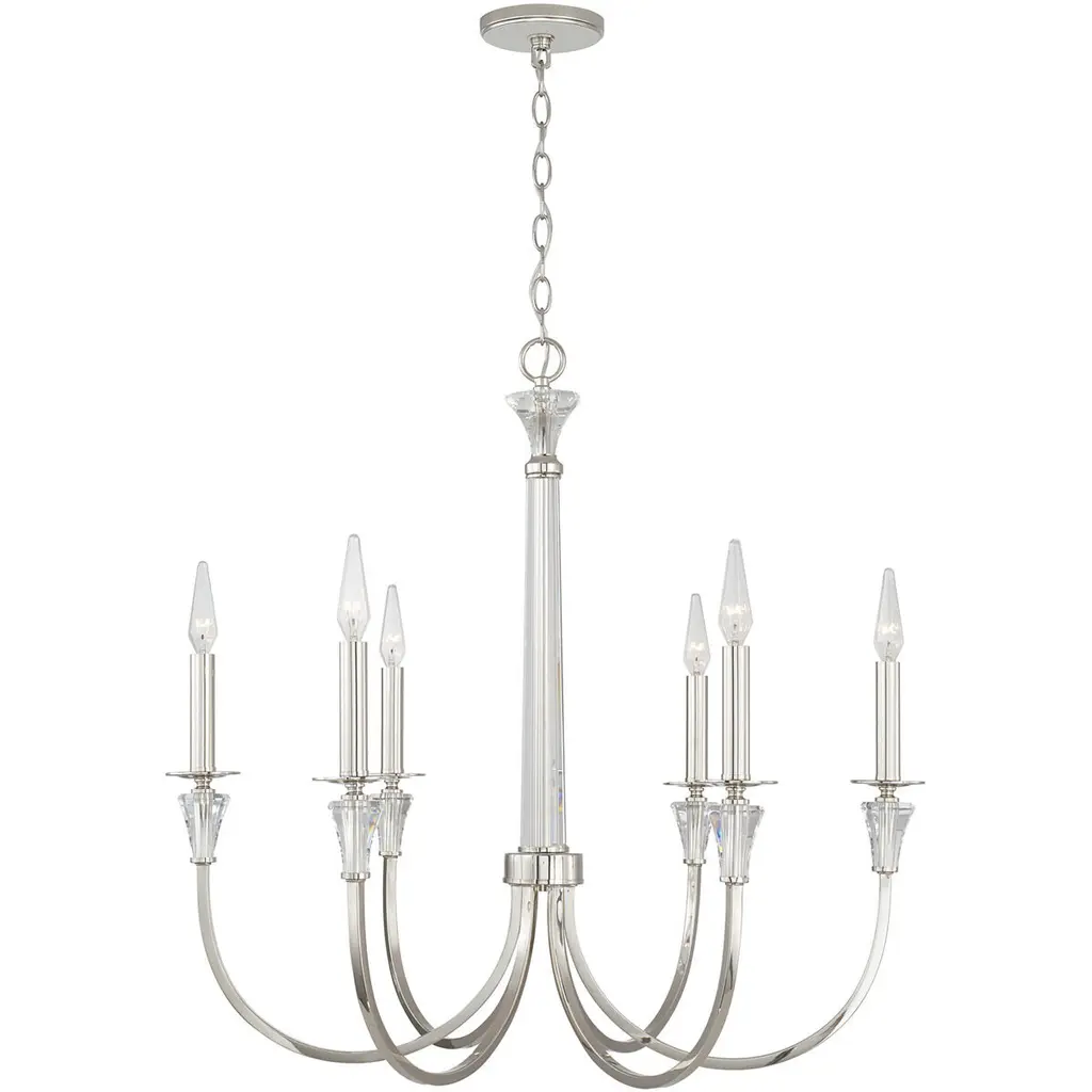 The Hoyne collection offers a contemporary update to a traditional style. Candelabra lamping finished in sleek polished nickel accented with delicate crystal drops give the Hoyne its dramatic appeal. The central column and candle holders are also ensconced in sparkling clear crystal. This stunning chandelier is ideal for kitchens, dining areas, and foyers.