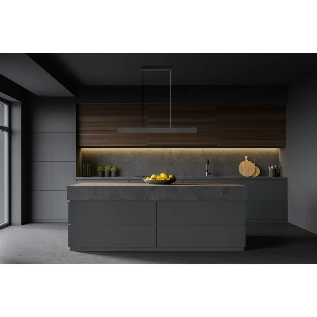 Energy saving LED lighting adds easy versatility and eco-friendly personality to the clean lines of a modern linear chandelier. It's the perfect shape for a kitchen island or rectangular dining table, adding bright, diffused illumination with a frosted diffuser. A matte black finish is crisp and refined, perfect for a variety of spaces and decor motifs.