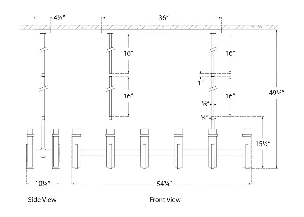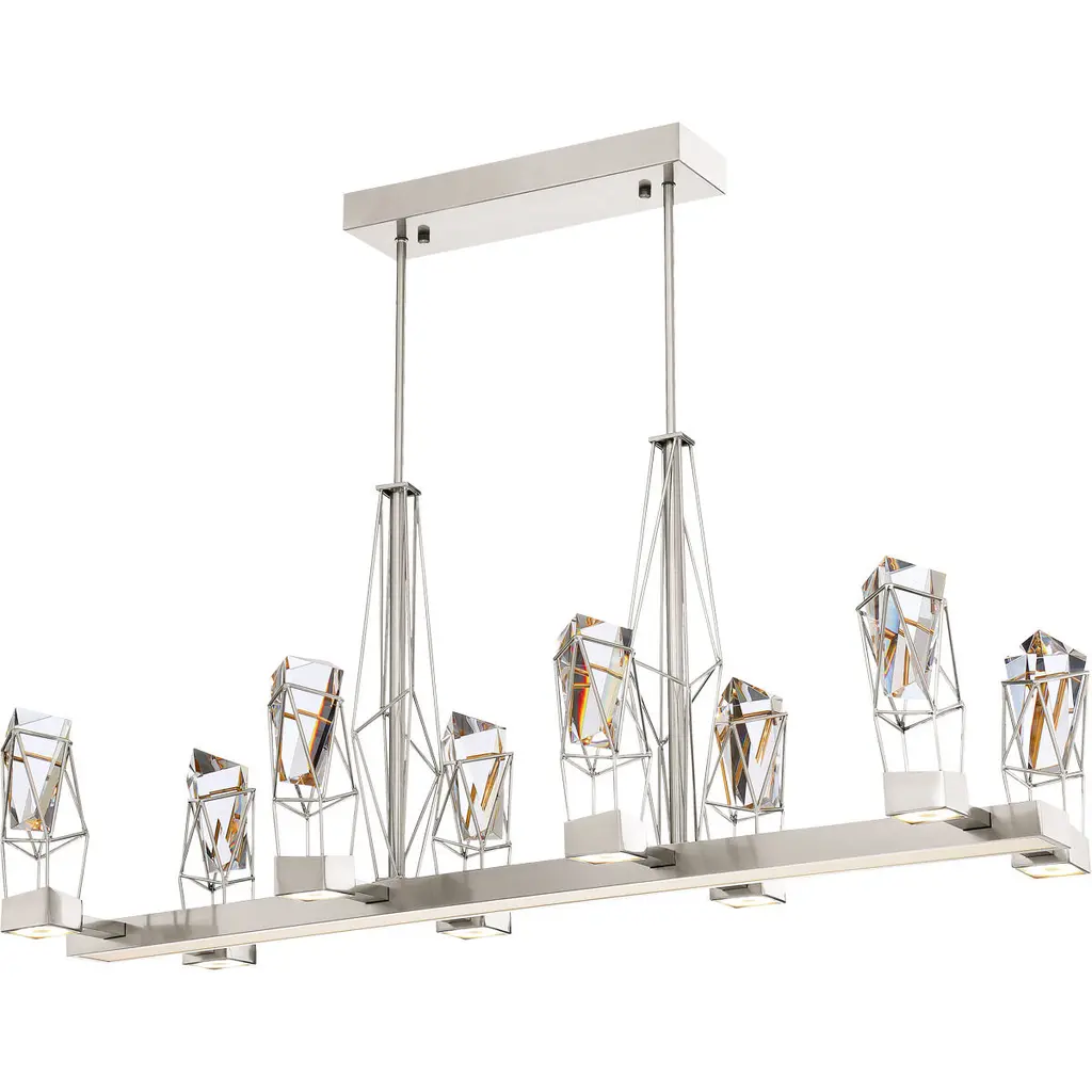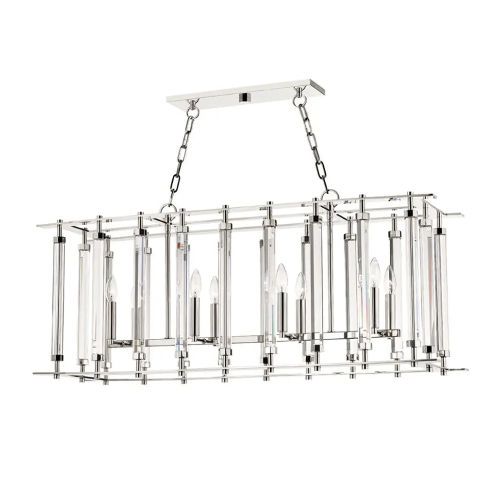 Malik Large Linear Chandelier in Polished Nickel with Crystal Designer: Ian K. Fowler Fixture Height: 15.5" Min. Custom Height: 23" O/A Height: 49.75" Canopy: 4.5" x 36" Rectangle Mounting: Rod Shade Detail: Crystal Socket: Dedicated LED Wattage: 50w (4000lm) Safety Rating Location: Damp Note: Custom Height Available