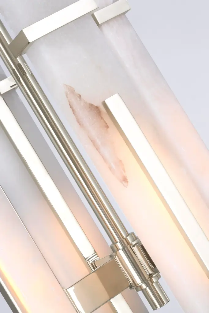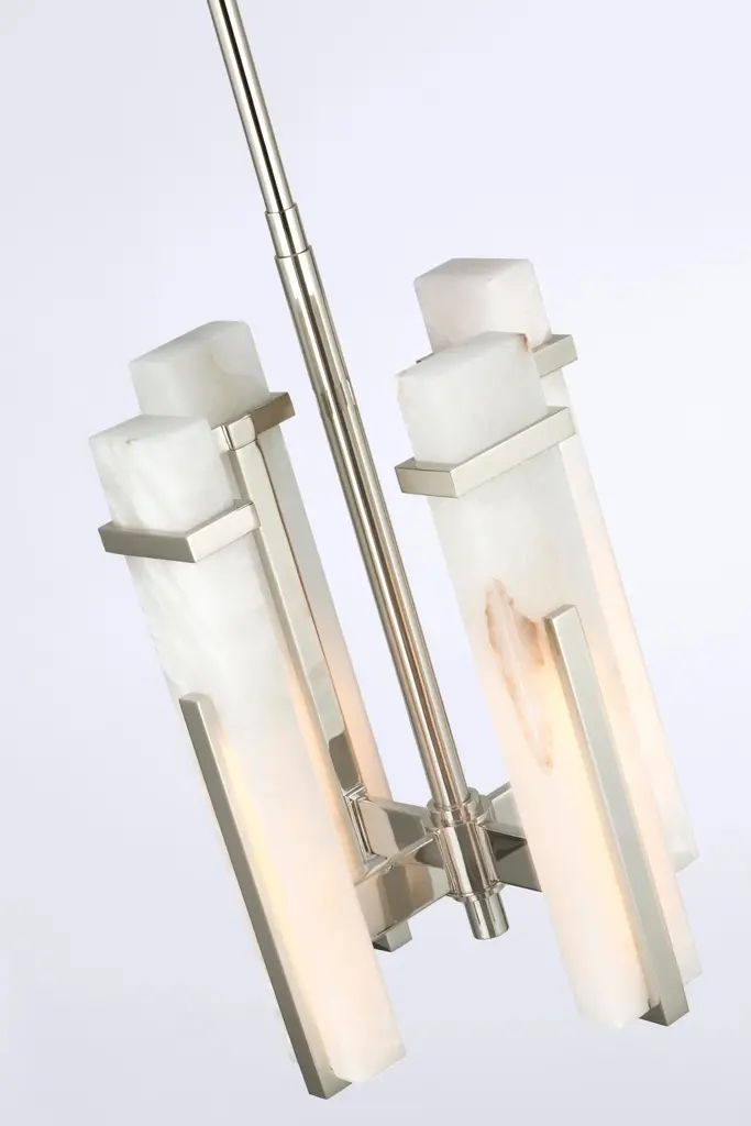 Malik Small Chandelier in Polished Nickel with Alabaster Designer: Ian K. Fowler Fixture Height: 18.75" Min. Custom Height: 25.5" O/A Height: 54" Canopy: 4.75" Round Mounting: Rod Shade Detail: Alabaster Socket: Dedicated LED Wattage: 35w (2800lm) Safety Rating Location: Damp Note: Custom Height Available Alabaster is a Natural Stone Variations in Color and Texture are Expected