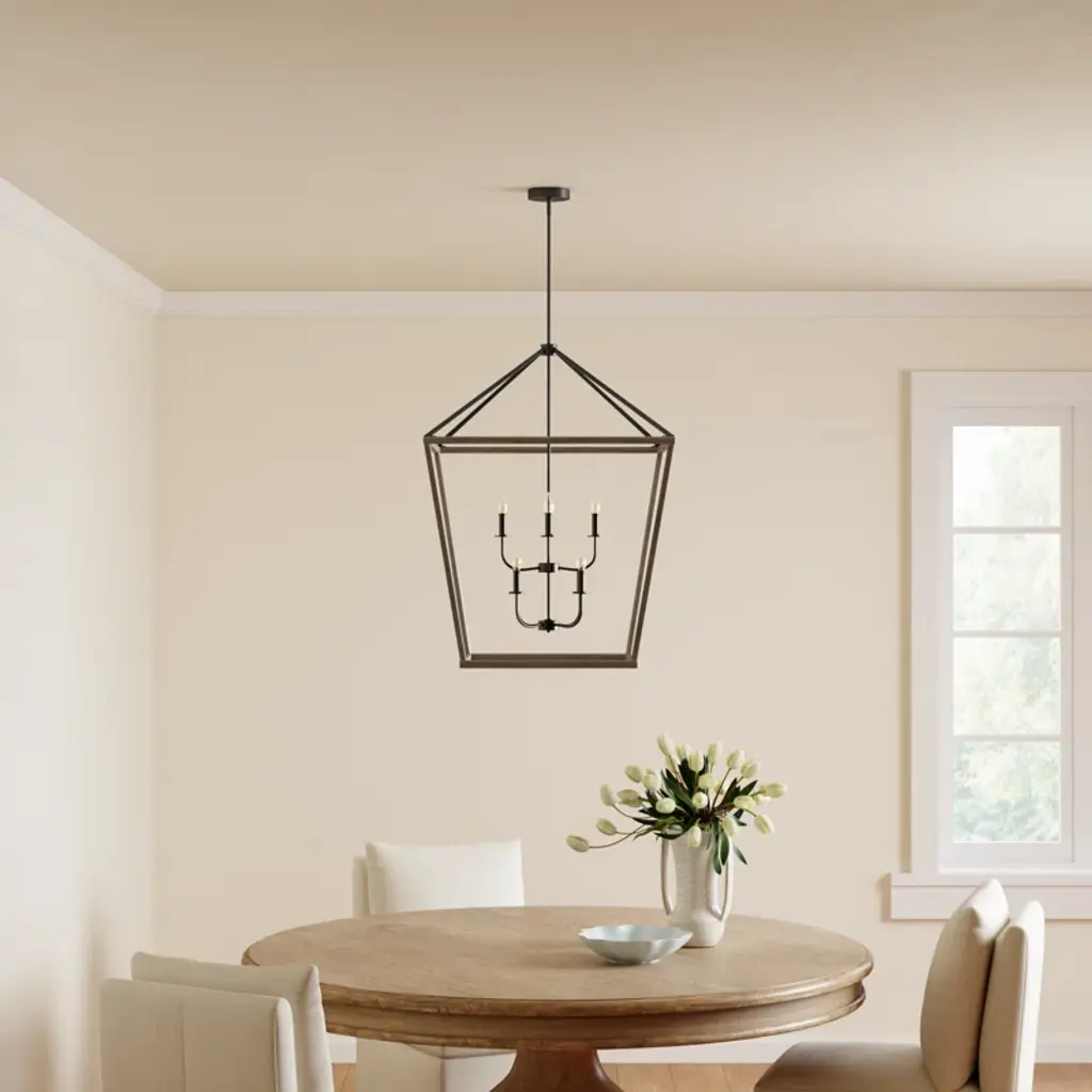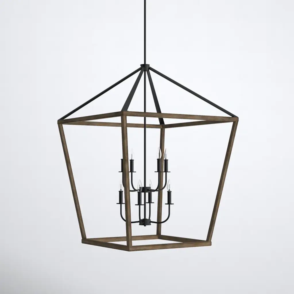 This 8-light chandelier blends traditional charm with rustic elegance. Crafted from metal with a weathered finish, its open geometric frame showcases candle-style bulbs that cast a warm, ambient glow. Compatible with dimmer switches and LED bulbs, it’s easy to tailor the lighting to your mood. We love that it’s height adjustable and damp-rated, making it a versatile choice for dining rooms, entryways, or covered outdoor spaces alike.