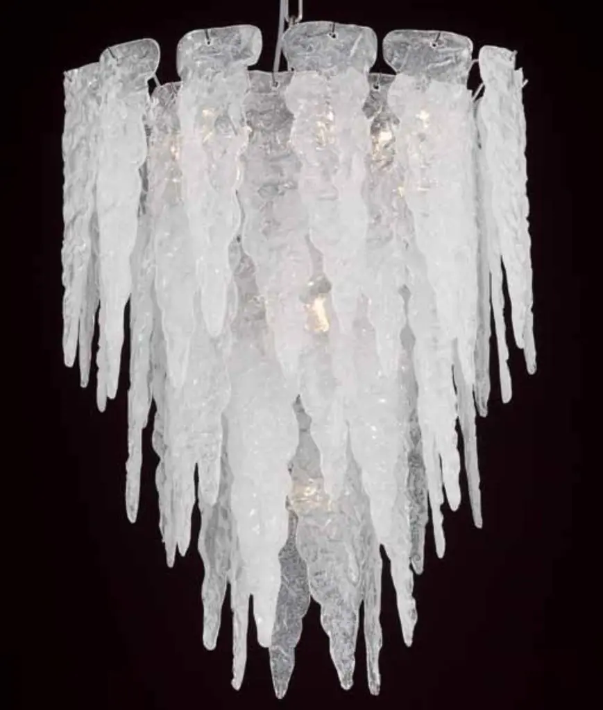 Italian chandelier shown with milky white Murano ice spikes glasses mounted on chrome finish frame, inspired by Mazzega / Made in Italy7 lights / E12 or E14 type / max 40W eachMeasures: Diameter 21.5 inches / height 27.5 inches plus chain and canopyOrder only / This item ships from ItalyOrder reference #: FABIOLTD C851