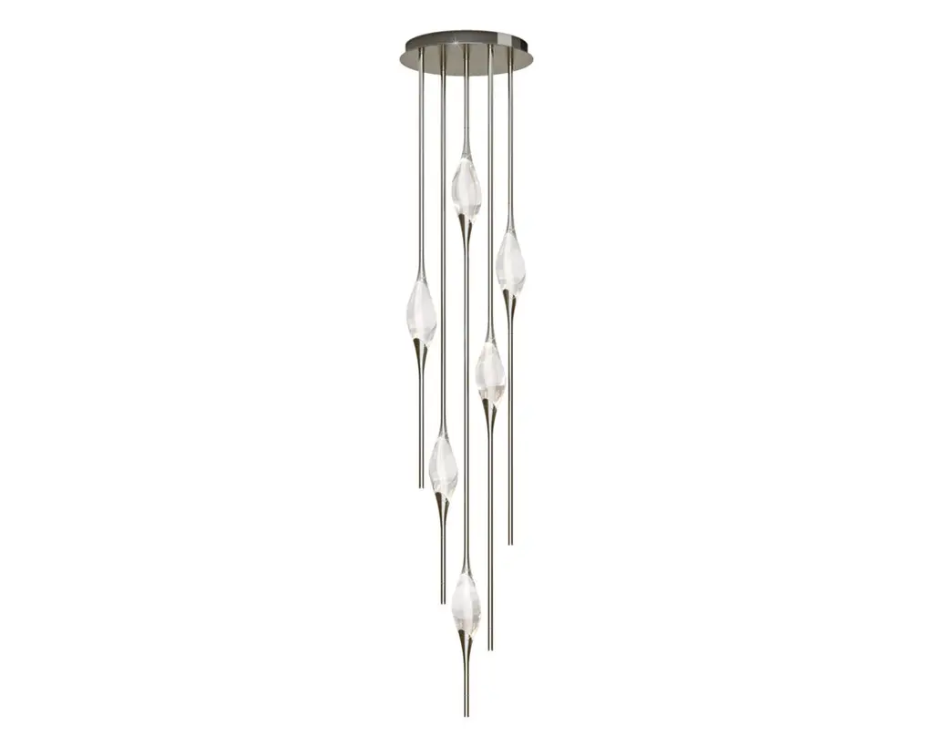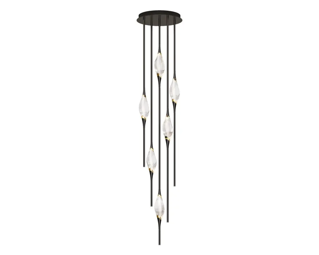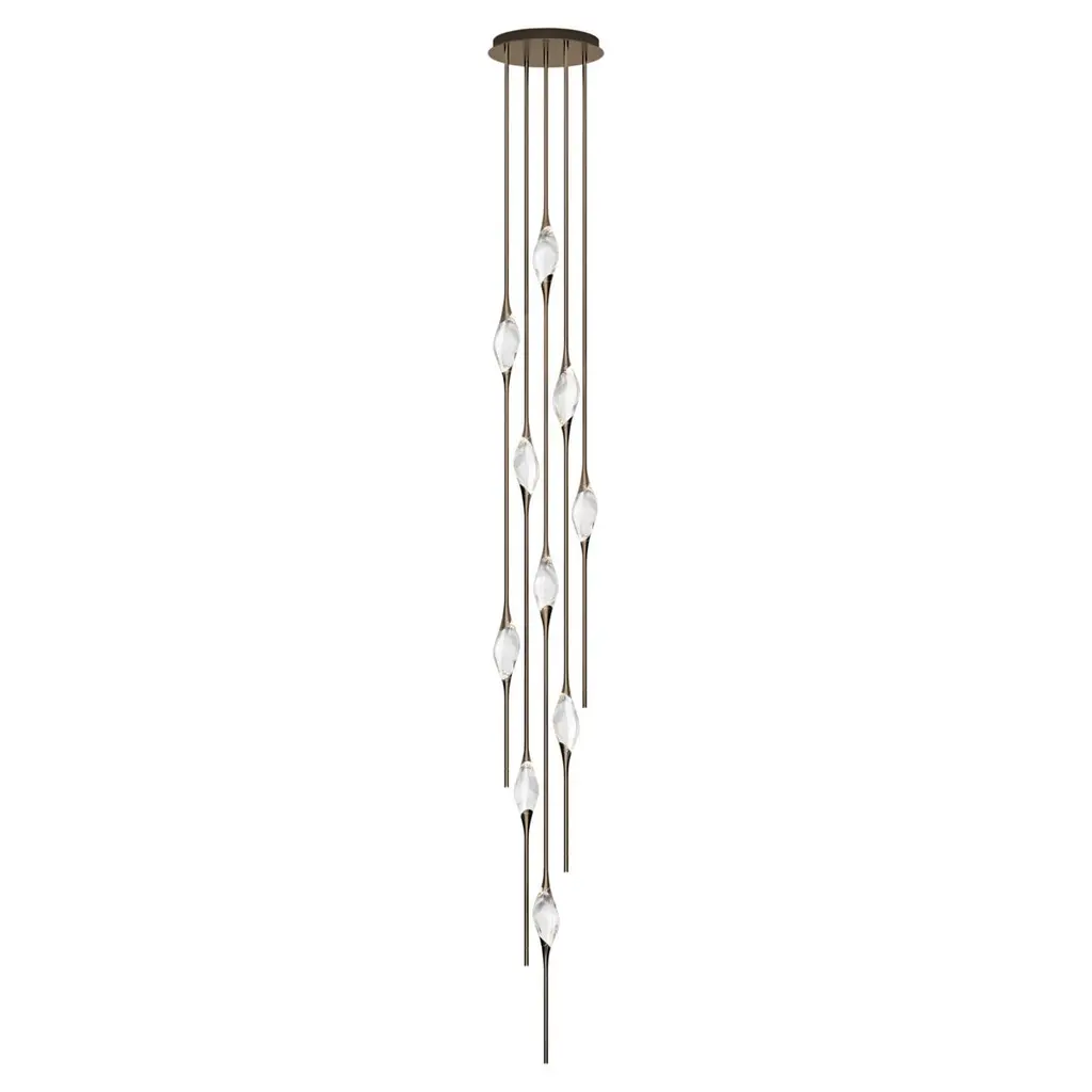 Il Pezzo 12 is a female figure suspended in the air, carrying in her womb the light. It’s nimble, refined, addictive.The solid clearest crystal, brilliantly illuminated by two LEDs, diffuses ambient light and casts mesmerizing patterns throughout the room. It’s suspended between brass stems and brass casting rings, available in different finishes. The fixture is adorned with an additional LED at the end of each stem to provide direct lighting. Experiencing the exquisite craftsmanship of this piece, combined with highly advanced LED technology, is truly fascinating.Il Pezzo 12 allows to create clusters able to satisfy the most demanding designs by creating fascinating compositions.Each chandelier is numbered and shows the “Missing Piece” (“Pezzo Mancante” in Italian): a small brass cylinder containing a unique serial number, guarantees its authenticity and individuality.Custom sizes and finishes are also available to suit every preference.All our masterpieces are meticulously crafted in our Atelier located in Florence, Italy, from a small team of people driven by a shared passion for quality and beauty. We constantly strive to create unparalleled works of art, where each piece is a testament to our commitment to craftsmanship and innovation.Structure: BrassFinish: BronzeDiffusers: Solid crystalLight source: 2.700K LED, CRI>90, dimmable.Size: ø40 x H 200 cm - ø15.7" x H 78.7" (custom size on request)ETL certified UL and CSA standards compliant.