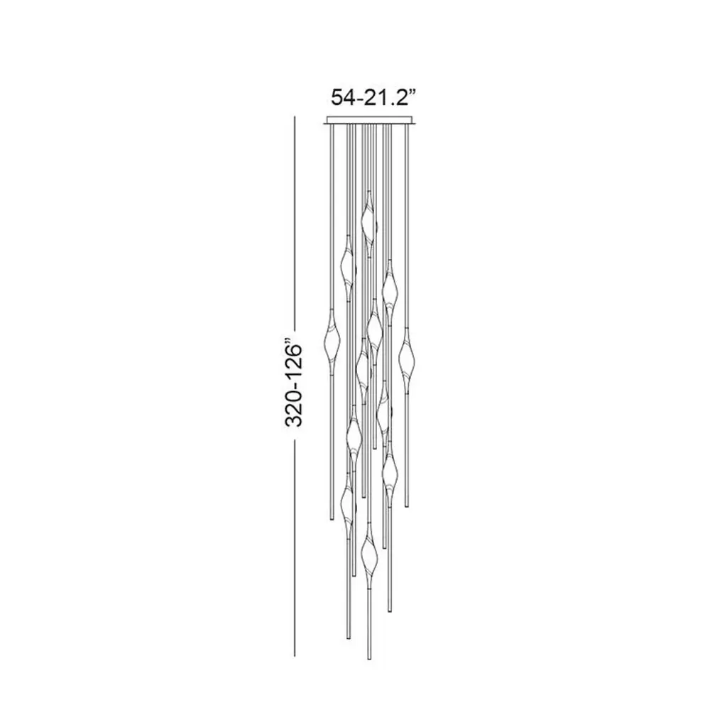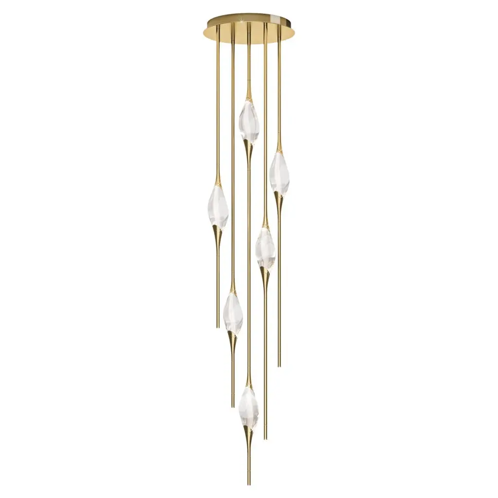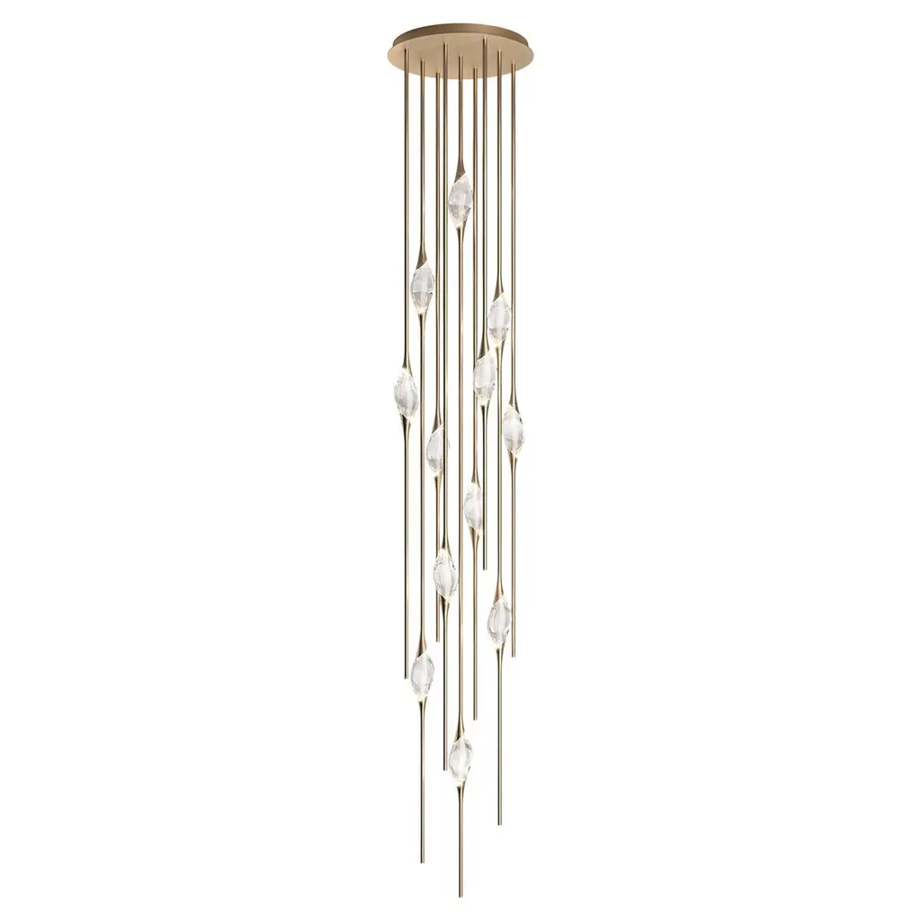 Il Pezzo 12 is a female figure suspended in the air, carrying in her womb the light. It’s nimble, refined, addictive.The solid clearest crystal, brilliantly illuminated by two LEDs, diffuses ambient light and casts mesmerizing patterns throughout the room. It’s suspended between brass stems and brass casting rings, available in different finishes. The fixture is adorned with an additional LED at the end of each stem to provide direct lighting. Experiencing the exquisite craftsmanship of this piece, combined with highly advanced LED technology, is truly fascinating.Il Pezzo 12 allows to create clusters able to satisfy the most demanding designs by creating fascinating compositions.Each chandelier is numbered and shows the “Missing Piece” (“Pezzo Mancante” in Italian): a small brass cylinder containing a unique serial number, guarantees its authenticity and individuality.Custom sizes and finishes are also available to suit every preference.All our masterpieces are meticulously crafted in our Atelier located in Florence, Italy, from a small team of people driven by a shared passion for quality and beauty. We constantly strive to create unparalleled works of art, where each piece is a testament to our commitment to craftsmanship and innovation.Structure: BrassFinish: GoldDiffusers: Solid crystalLight source: 2.700K LED, CRI>90, dimmable.Size: ø55 x H 320 cm - ø21.6" x H 126" (custom size on request)ETL certified UL and CSA standards compliant.