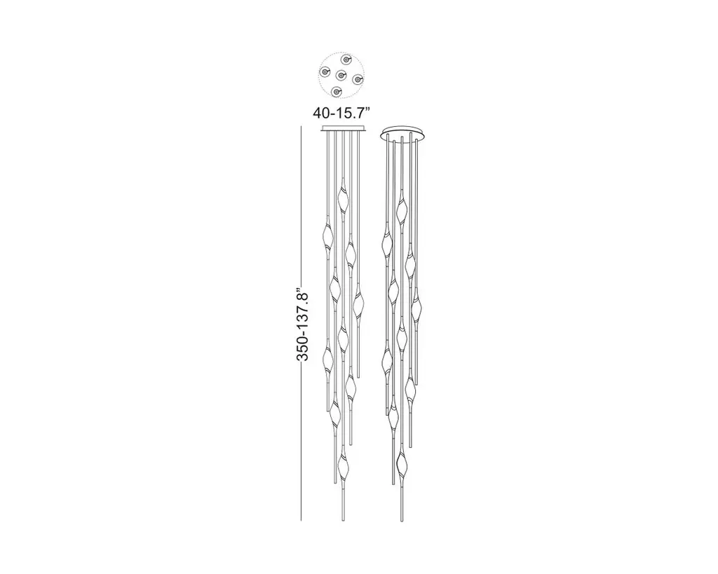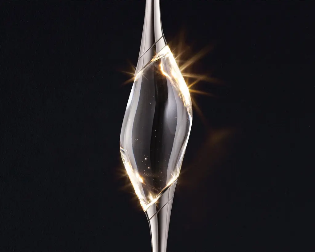 Il Pezzo 12 is a female figure suspended in the air, carrying in her womb the light. It’s nimble, refined, addictive.The solid clearest crystal, brilliantly illuminated by two LEDs, diffuses ambient light and casts mesmerizing patterns throughout the room. It’s suspended between brass stems and brass casting rings, available in different finishes. The fixture is adorned with an additional LED at the end of each stem to provide direct lighting. Experiencing the exquisite craftsmanship of this piece, combined with highly advanced LED technology, is truly fascinating.Il Pezzo 12 allows to create clusters able to satisfy the most demanding designs by creating fascinating compositions.Each chandelier is numbered and shows the “Missing Piece” (“Pezzo Mancante” in Italian): a small brass cylinder containing a unique serial number, guarantees its authenticity and individuality.Custom sizes and finishes are also available to suit every preference.All our masterpieces are meticulously crafted in our Atelier located in Florence, Italy, from a small team of people driven by a shared passion for quality and beauty. We constantly strive to create unparalleled works of art, where each piece is a testament to our commitment to craftsmanship and innovation.Structure: BrassFinish: NickelDiffusers: Solid crystalLight source: 2.700K LED, CRI>90, dimmable.Size: ø40 x H 350 cm - ø15.7" x H 137.8" (custom size on request)ETL certified UL and CSA standards compliant.