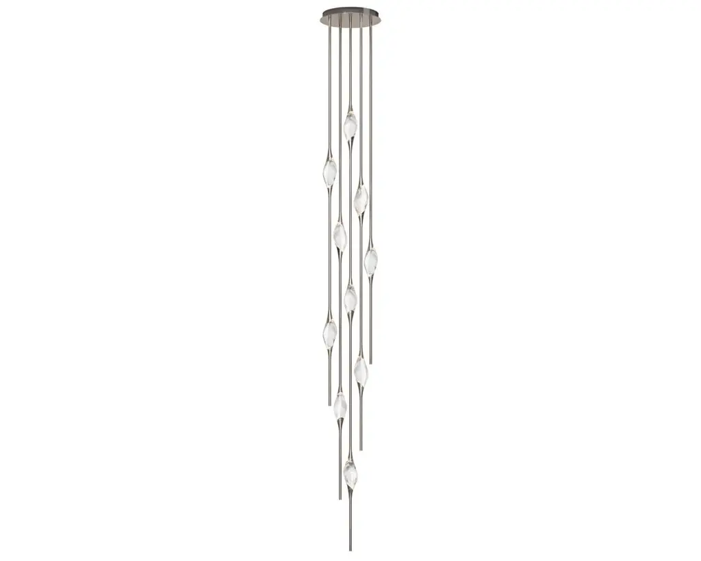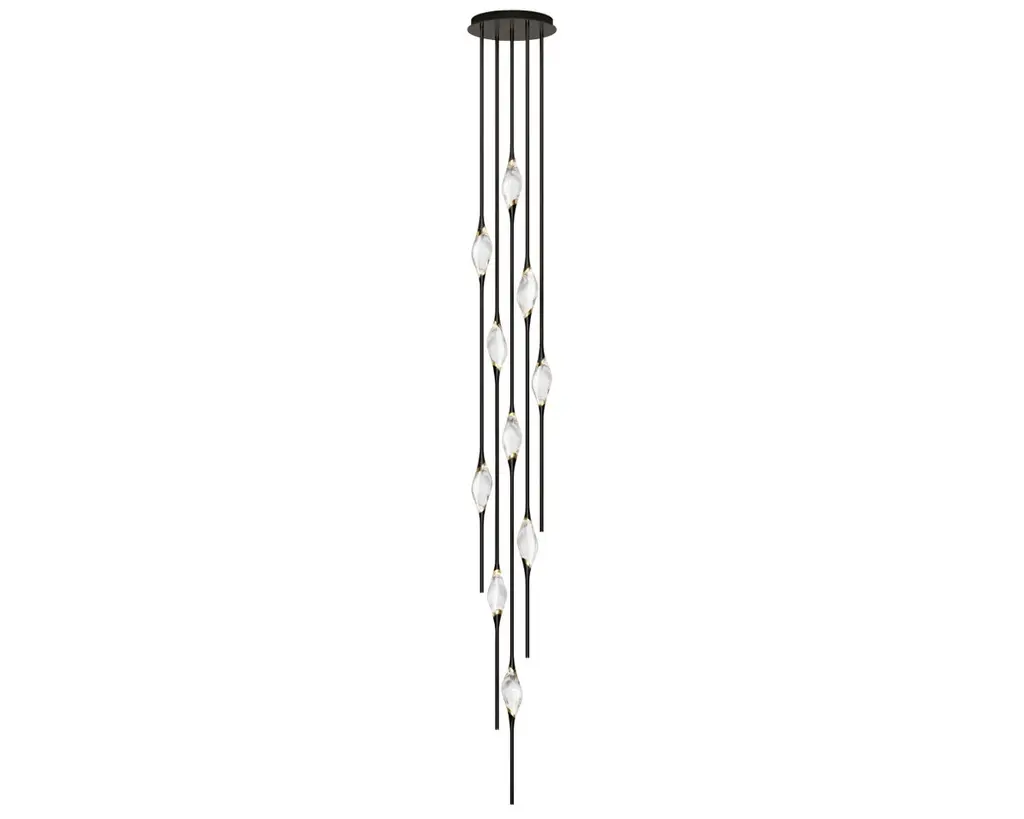 Il Pezzo 12 is a female figure suspended in the air, carrying in her womb the light. It’s nimble, refined, addictive.The solid clearest crystal, brilliantly illuminated by two LEDs, diffuses ambient light and casts mesmerizing patterns throughout the room. It’s suspended between brass stems and brass casting rings, available in different finishes. The fixture is adorned with an additional LED at the end of each stem to provide direct lighting. Experiencing the exquisite craftsmanship of this piece, combined with highly advanced LED technology, is truly fascinating.Il Pezzo 12 allows to create clusters able to satisfy the most demanding designs by creating fascinating compositions.Each chandelier is numbered and shows the “Missing Piece” (“Pezzo Mancante” in Italian): a small brass cylinder containing a unique serial number, guarantees its authenticity and individuality.Custom sizes and finishes are also available to suit every preference.All our masterpieces are meticulously crafted in our Atelier located in Florence, Italy, from a small team of people driven by a shared passion for quality and beauty. We constantly strive to create unparalleled works of art, where each piece is a testament to our commitment to craftsmanship and innovation.Structure: BrassFinish: Satin brassDiffusers: Solid crystalLight source: 2.700K LED, CRI>90, dimmable.Size: ø40 x H 350 cm - ø15.7" x H 137.8" (custom size on request)ETL certified UL and CSA standards compliant.