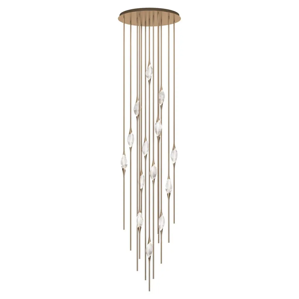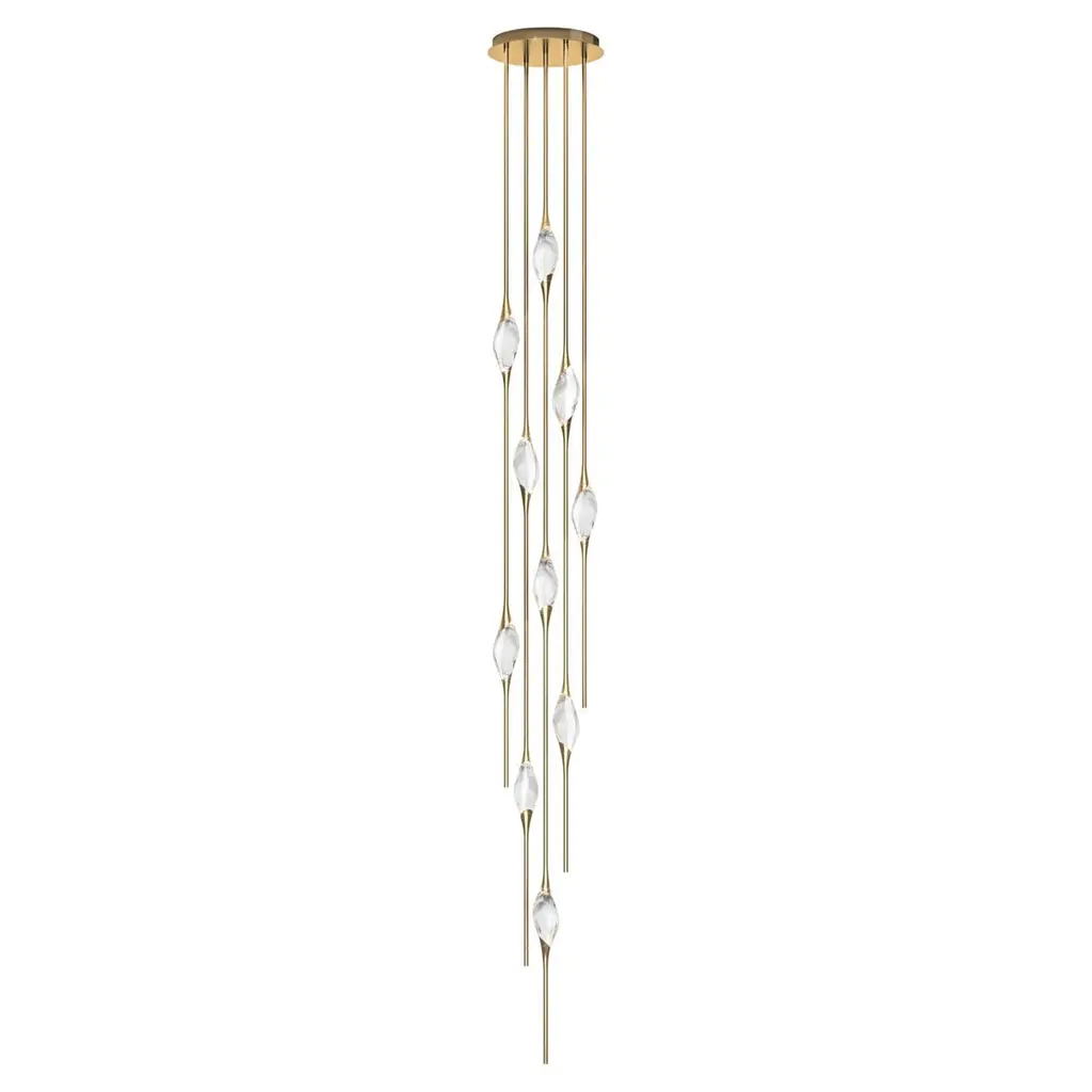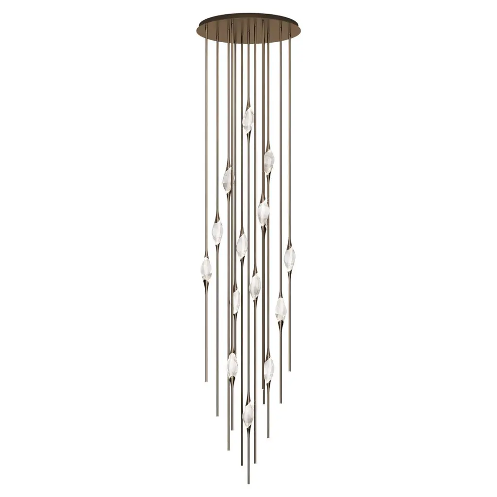 Il Pezzo 12 is a female figure suspended in the air, carrying in her womb the light. It’s nimble, refined, addictive.The solid clearest crystal, brilliantly illuminated by two LEDs, diffuses ambient light and casts mesmerizing patterns throughout the room. It’s suspended between brass stems and brass casting rings, available in different finishes. The fixture is adorned with an additional LED at the end of each stem to provide direct lighting. Experiencing the exquisite craftsmanship of this piece, combined with highly advanced LED technology, is truly fascinating.Il Pezzo 12 allows to create clusters able to satisfy the most demanding designs by creating fascinating compositions.Each chandelier is numbered and shows the “Missing Piece” (“Pezzo Mancante” in Italian): a small brass cylinder containing a unique serial number, guarantees its authenticity and individuality.Custom sizes and finishes are also available to suit every preference.All our masterpieces are meticulously crafted in our Atelier located in Florence, Italy, from a small team of people driven by a shared passion for quality and beauty. We constantly strive to create unparalleled works of art, where each piece is a testament to our commitment to craftsmanship and innovation.Structure: BrassFinish: BronzeDiffusers: Solid crystalLight source: 2.700K LED, CRI>90, dimmable.Size: ø90 x H 550 cm - ø35.5" x H 216.5 (custom size on request)ETL certified UL and CSA standards compliant.