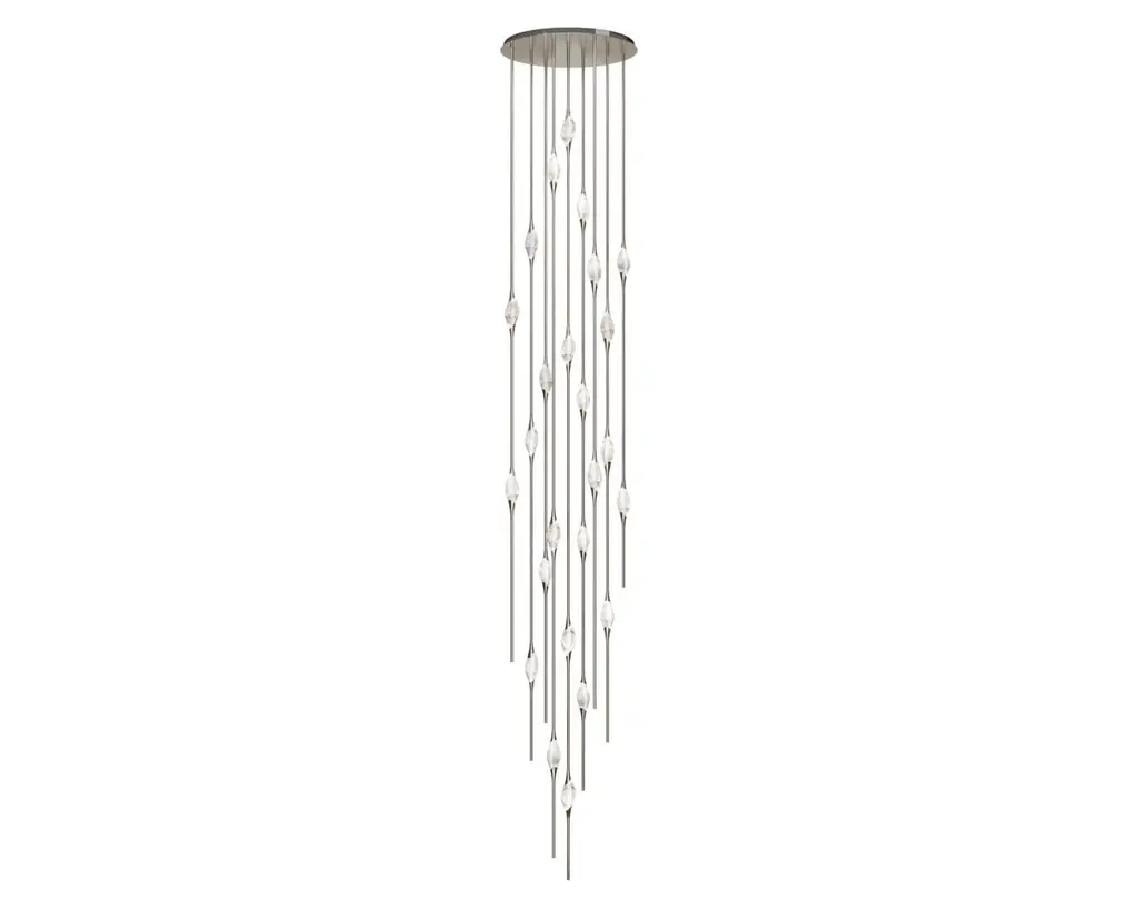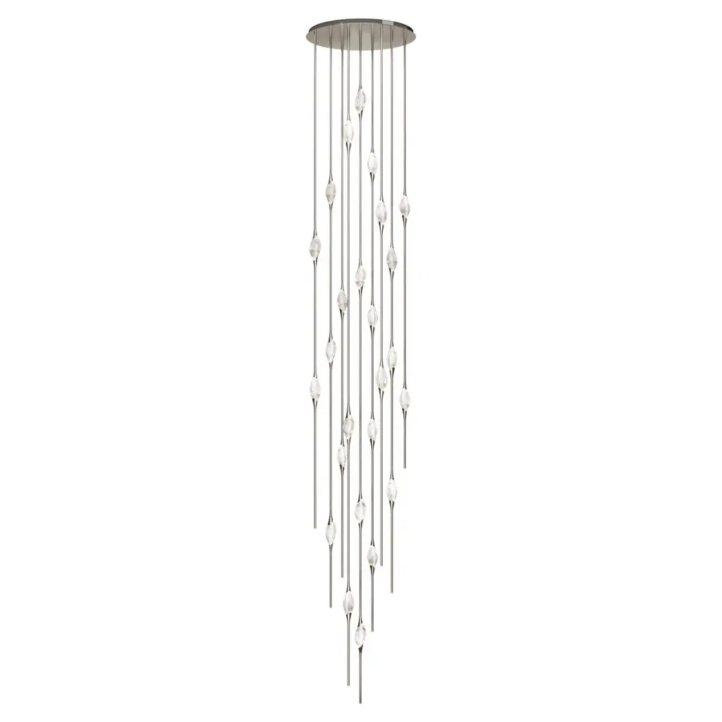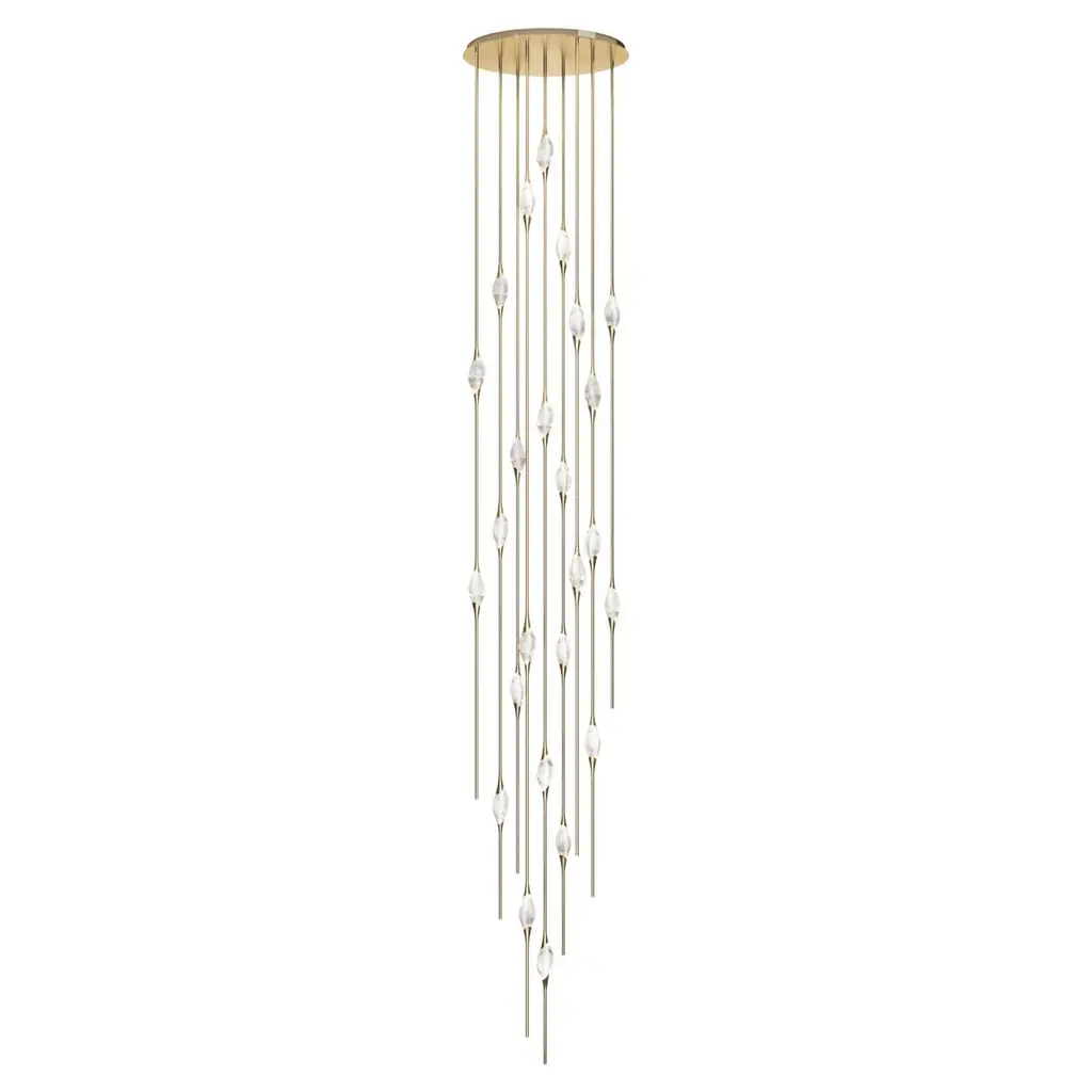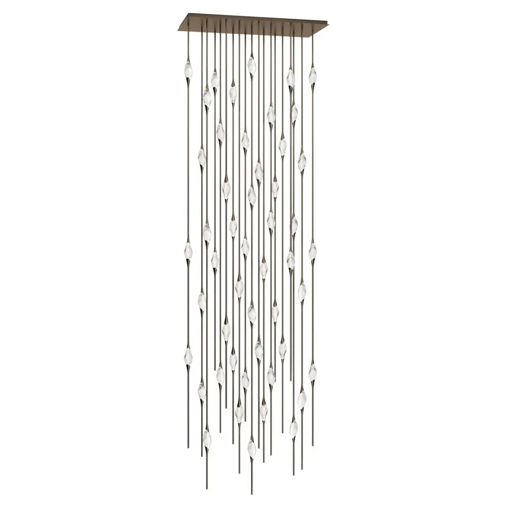 Il Pezzo 12 is a female figure suspended in the air, carrying in her womb the light. It’s nimble, refined, addictive.The solid clearest crystal, brilliantly illuminated by two LEDs, diffuses ambient light and casts mesmerizing patterns throughout the room. It’s suspended between brass stems and brass casting rings, available in different finishes. The fixture is adorned with an additional LED at the end of each stem to provide direct lighting. Experiencing the exquisite craftsmanship of this piece, combined with highly advanced LED technology, is truly fascinating.Il Pezzo 12 allows to create clusters able to satisfy the most demanding designs by creating fascinating compositions.Each chandelier is numbered and shows the “Missing Piece” (“Pezzo Mancante” in Italian): a small brass cylinder containing a unique serial number, guarantees its authenticity and individuality.Custom sizes and finishes are also available to suit every preference.All our masterpieces are meticulously crafted in our Atelier located in Florence, Italy, from a small team of people driven by a shared passion for quality and beauty. We constantly strive to create unparalleled works of art, where each piece is a testament to our commitment to craftsmanship and innovation.Structure: BrassFinish: BronzeDiffusers: Solid crystalLight source: 2.700K LED, CRI>90, dimmable.Size: ø90 x H 550 cm - ø35.5" x H 216.5 (custom size on request)ETL certified UL and CSA standards compliant.
