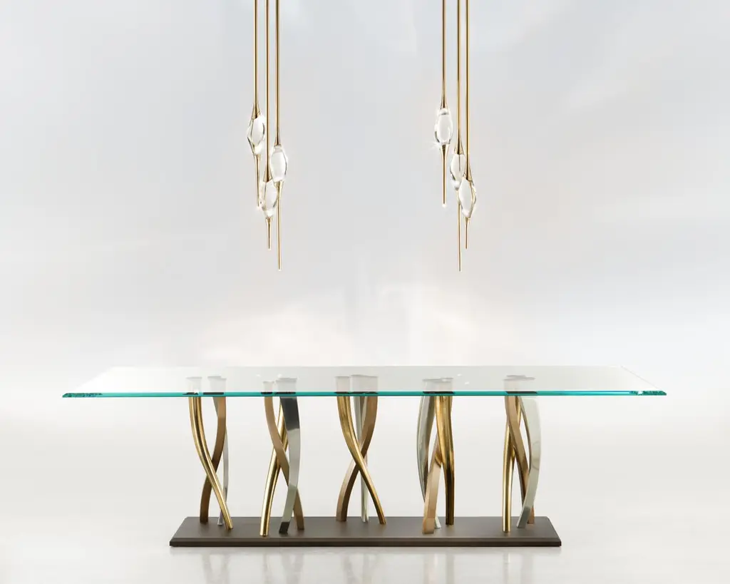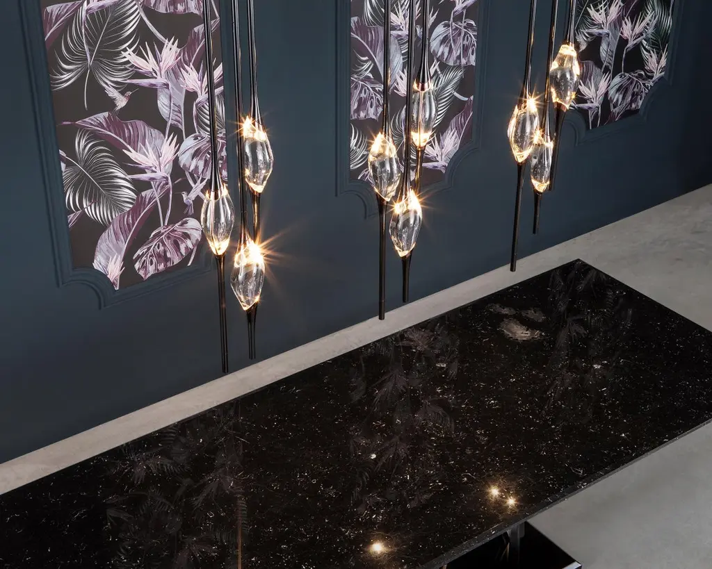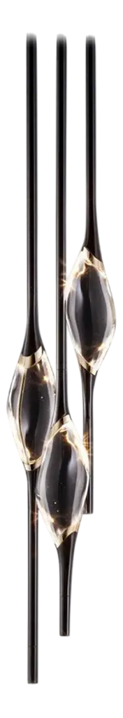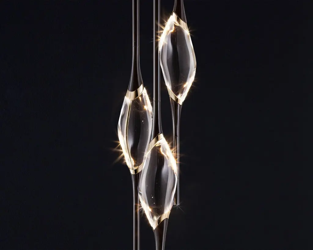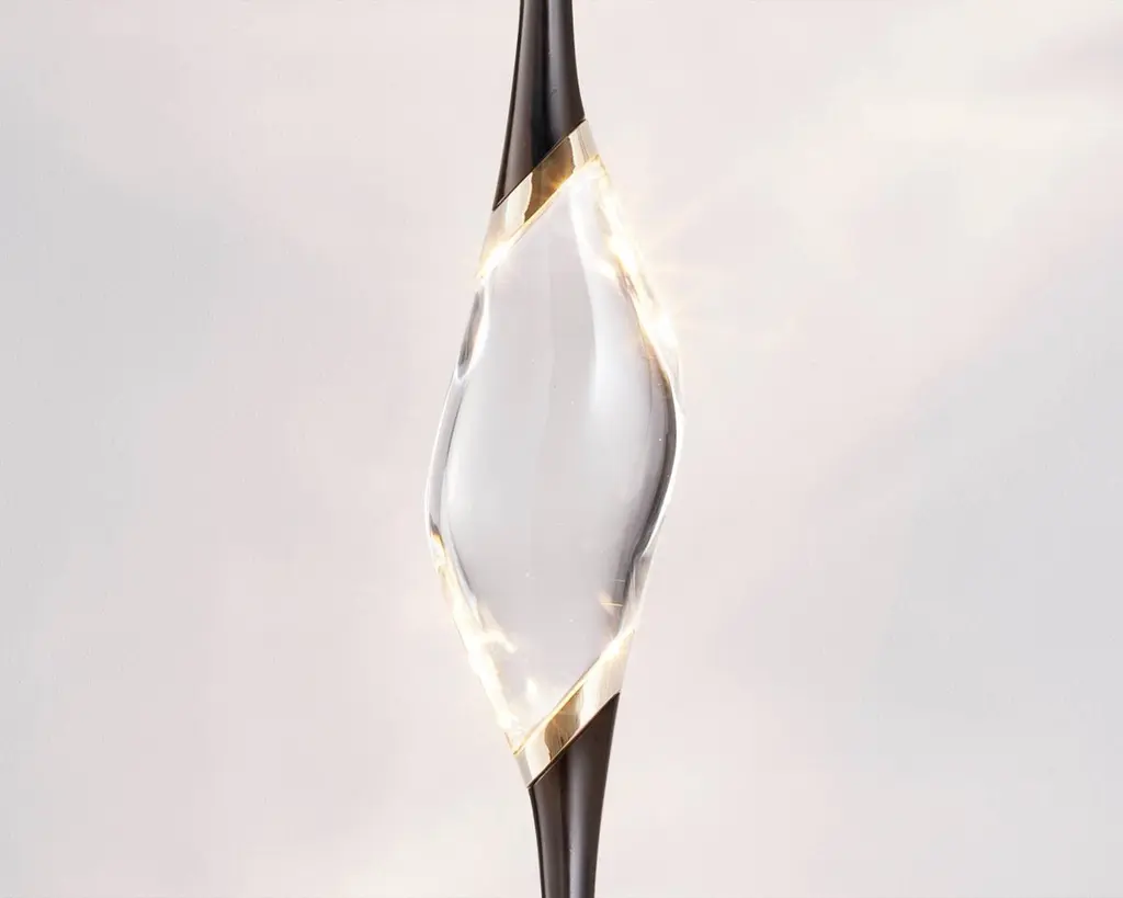 Il Pezzo 12 is a female figure suspended in the air, carrying in her womb the light. It’s nimble, refined, addictive.The solid clearest crystal, brilliantly illuminated by two LEDs, diffuses ambient light and casts mesmerizing patterns throughout the room. It’s suspended between brass stems and brass casting rings, available in different finishes. The fixture is adorned with an additional LED at the end of each stem to provide direct lighting. Experiencing the exquisite craftsmanship of this piece, combined with highly advanced LED technology, is truly fascinating.Each chandelier is numbered and shows the “Missing Piece” (“Pezzo Mancante” in Italian): a small brass cylinder containing a unique serial number, guarantees its authenticity and individuality.Custom sizes and finishes are also available to suit every preference.All our masterpieces are meticulously crafted in our Atelier located in Florence, Italy, from a small team of people driven by a shared passion for quality and beauty. We constantly strive to create unparalleled works of art, where each piece is a testament to our commitment to craftsmanship and innovation.Structure: brassFinish: black and goldDiffusers: solid crystalLight source: 2.700K LED, CRI>90, dimmable.Size: ø20 x H 120 cm - ø7.9" x H 47.2" (custom height on request)ETL certified UL and CSA standards compliant.