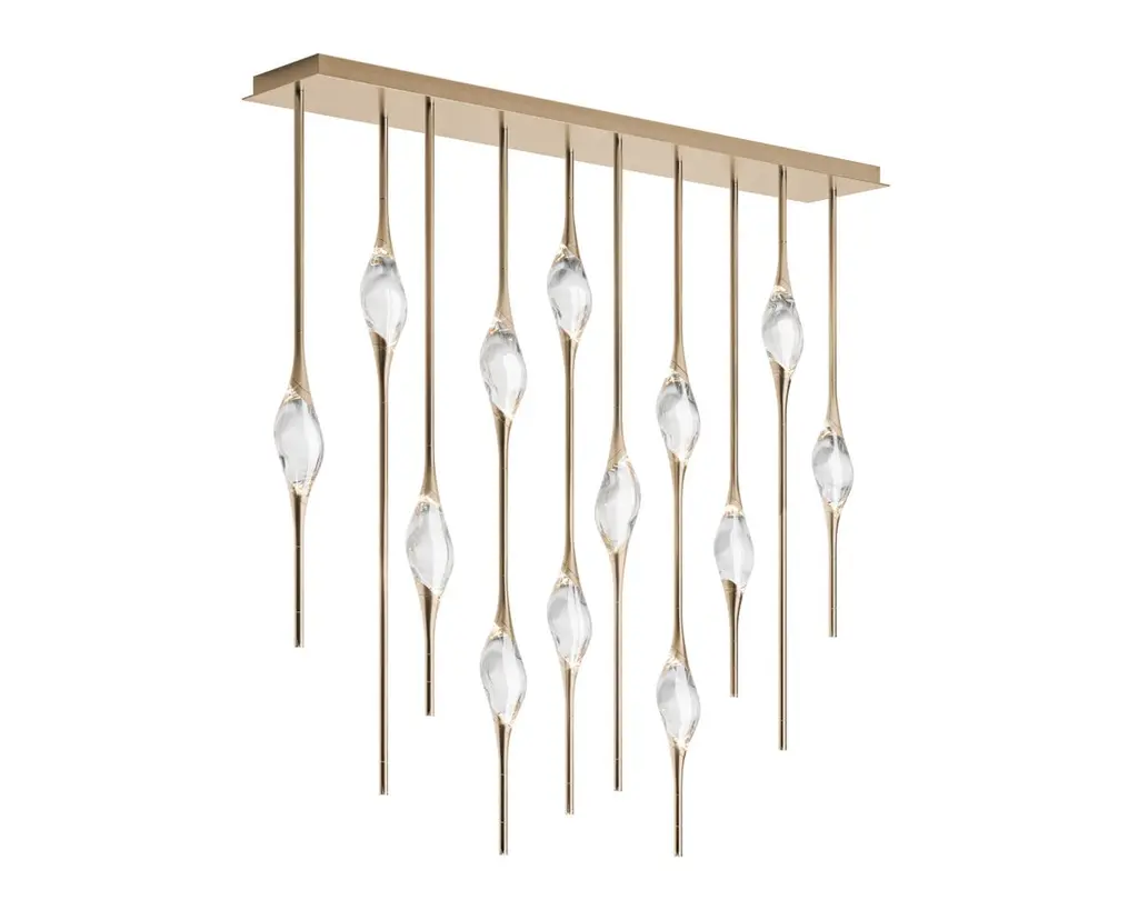 Il Pezzo 12 is a female figure suspended in the air, carrying in her womb the light. It’s nimble, refined, addictive.The solid clearest crystal, brilliantly illuminated by two LEDs, diffuses ambient light and casts mesmerizing patterns throughout the room. It’s suspended between brass stems and brass casting rings, available in different finishes. The fixture is adorned with an additional LED at the end of each stem to provide direct lighting. Experiencing the exquisite craftsmanship of this piece, combined with highly advanced LED technology, is truly fascinating.Il Pezzo 12 allows to create clusters able to satisfy the most demanding designs by creating fascinating compositions. Each chandelier is numbered and shows the “Missing Piece” (“Pezzo Mancante” in Italian): a small brass cylinder containing a unique serial number, guarantees its authenticity andindividuality. Custom sizes and finishes are also available to suit every preference.All our masterpieces are meticulously crafted in our Atelier located in Florence, Italy, from a small team of people driven by a shared passion for quality and beauty. We constantly strive to create unparalleled works of art, where each piece is a testament to our commitment to craftsmanship and innovation.Structure: BrassFinish: BronzeDiffusers: Solid crystalLight source: 2.700K LED, CRI>90, dimmable.Size: 150 x 25 x H 150 cm - 59" x 9.8" x H 59" (custom size on request)ETL certified UL and CSA standards compliant.