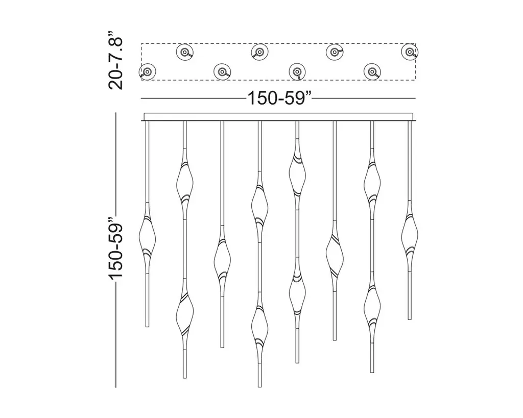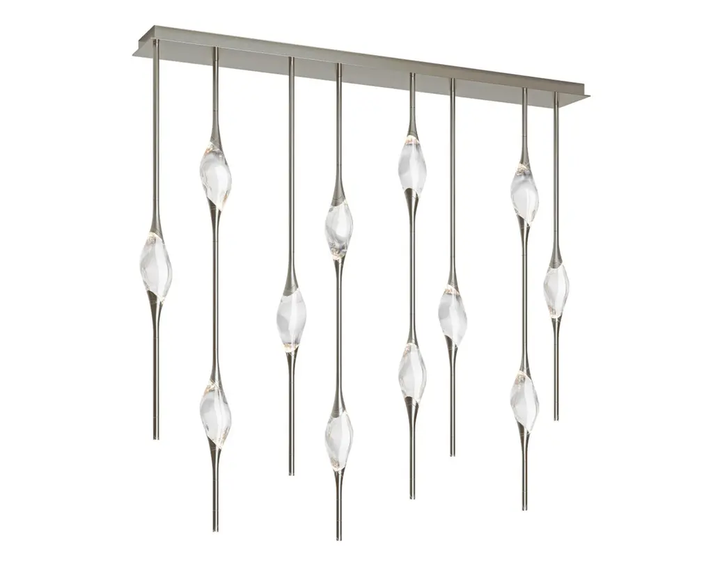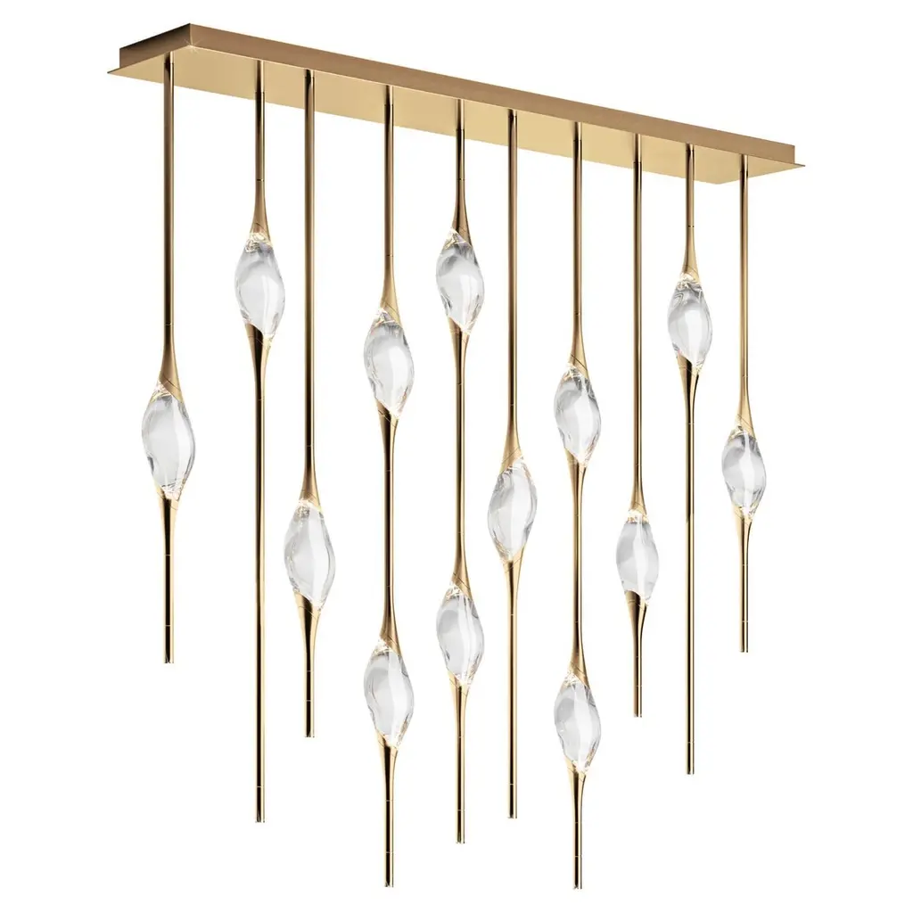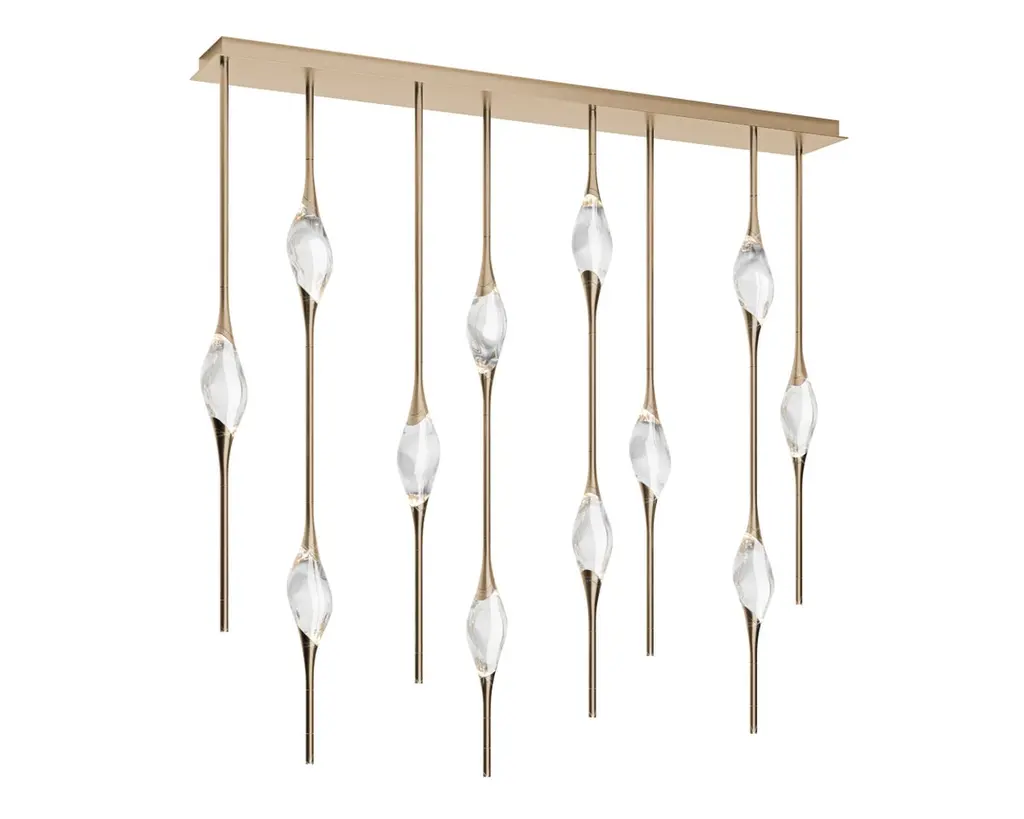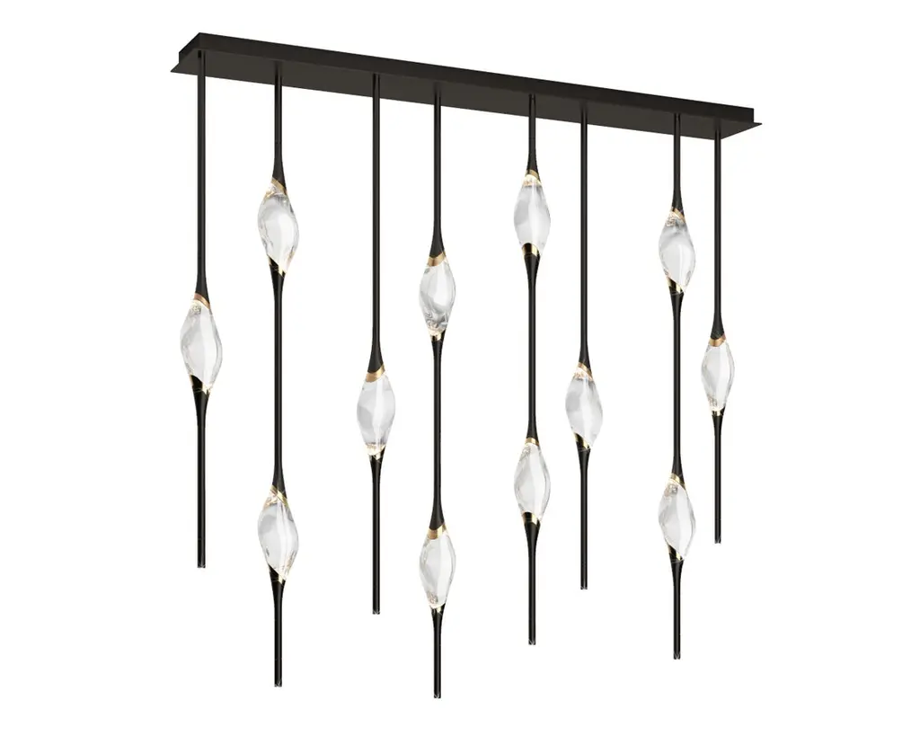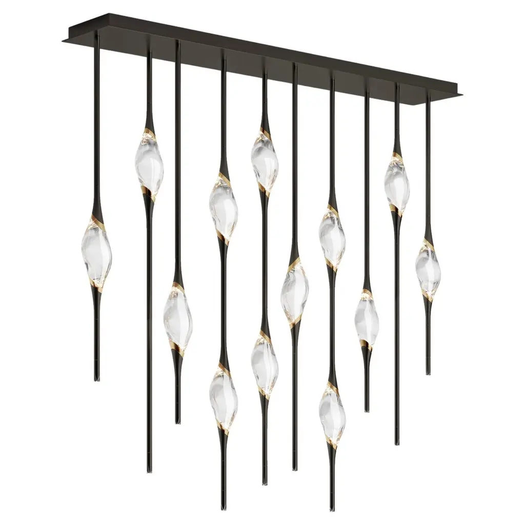 Il Pezzo 12 is a female figure suspended in the air, carrying in her womb the light. It’s nimble, refined, addictive.The solid clearest crystal, brilliantly illuminated by two LEDs, diffuses ambient light and casts mesmerizing patterns throughout the room. It’s suspended between brass stems and brass casting rings, available in different finishes. The fixture is adorned with an additional LED at the end of each stem to provide direct lighting. Experiencing the exquisite craftsmanship of this piece, combined with highly advanced LED technology, is truly fascinating.Il Pezzo 12 allows to create clusters able to satisfy the most demanding designs by creating fascinating compositions. Each chandelier is numbered and shows the “Missing Piece” (“Pezzo Mancante” in Italian): a small brass cylinder containing a unique serial number, guarantees its authenticity andindividuality. Custom sizes and finishes are also available to suit every preference.All our masterpieces are meticulously crafted in our Atelier located in Florence, Italy, from a small team of people driven by a shared passion for quality and beauty. We constantly strive to create unparalleled works of art, where each piece is a testament to our commitment to craftsmanship and innovation.Structure: BrassFinish: BronzeDiffusers: Solid crystalLight source: 2.700K LED, CRI>90, dimmable.Size: 150 x 20 x H 150 cm - 59" x 7.8" x H 59" (custom size on request)ETL certified UL and CSA standards compliant.