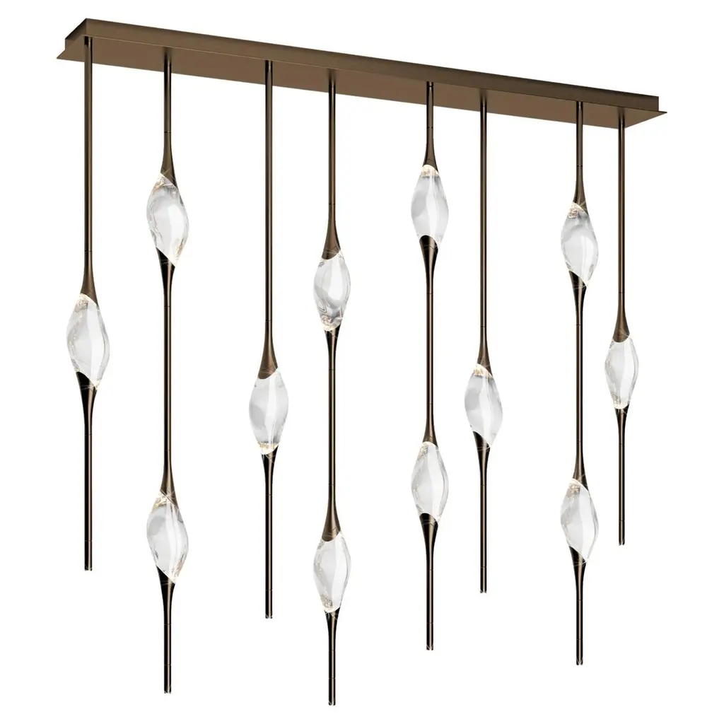 Il Pezzo 12 is a female figure suspended in the air, carrying in her womb the light. It’s nimble, refined, addictive.The solid clearest crystal, brilliantly illuminated by two LEDs, diffuses ambient light and casts mesmerizing patterns throughout the room. It’s suspended between brass stems and brass casting rings, available in different finishes. The fixture is adorned with an additional LED at the end of each stem to provide direct lighting. Experiencing the exquisite craftsmanship of this piece, combined with highly advanced LED technology, is truly fascinating.Il Pezzo 12 allows to create clusters able to satisfy the most demanding designs by creating fascinating compositions. Each chandelier is numbered and shows the “Missing Piece” (“Pezzo Mancante” in Italian): a small brass cylinder containing a unique serial number, guarantees its authenticity andindividuality. Custom sizes and finishes are also available to suit every preference.All our masterpieces are meticulously crafted in our Atelier located in Florence, Italy, from a small team of people driven by a shared passion for quality and beauty. We constantly strive to create unparalleled works of art, where each piece is a testament to our commitment to craftsmanship and innovation.Structure: BrassFinish: NickelDiffusers: Solid crystalLight source: 2.700K LED, CRI>90, dimmable.Size: 150 x 20 x H 150 cm - 59" x 7.8" x H 59" (custom size on request)ETL certified UL and CSA standards compliant.