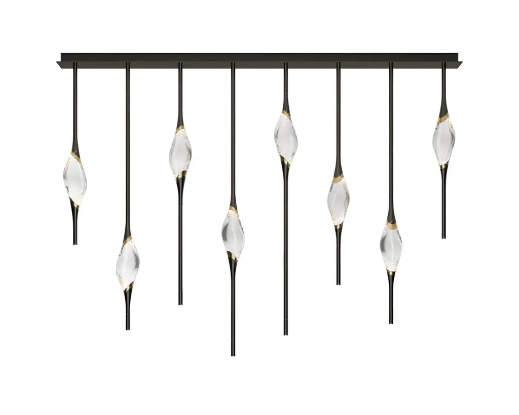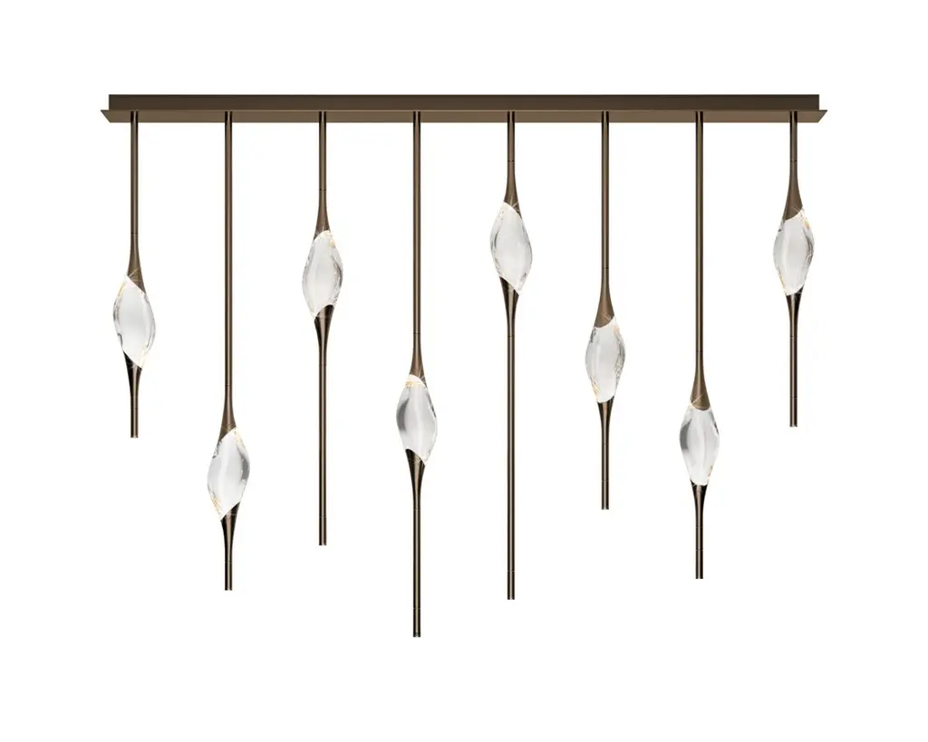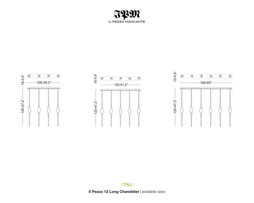Il Pezzo 12 is a female figure suspended in the air, carrying in her womb the light. It’s nimble, refined, addictive.The solid clearest crystal, brilliantly illuminated by two LEDs, diffuses ambient light and casts mesmerizing patterns throughout the room. It’s suspended between brass stems and brass casting rings, available in different finishes. The fixture is adorned with an additional LED at the end of each stem to provide direct lighting. Experiencing the exquisite craftsmanship of this piece, combined with highly advanced LED technology, is truly fascinating.Il Pezzo 12 allows to create clusters able to satisfy the most demanding designs by creating fascinating compositions. Each chandelier is numbered and shows the “Missing Piece” (“Pezzo Mancante” in Italian): a small brass cylinder containing a unique serial number, guarantees its authenticity andindividuality. Custom sizes and finishes are also available to suit every preference.All our masterpieces are meticulously crafted in our Atelier located in Florence, Italy, from a small team of people driven by a shared passion for quality and beauty. We constantly strive to create unparalleled works of art, where each piece is a testament to our commitment to craftsmanship and innovation.Structure: BrassFinish: Satin brassDiffusers: Solid crystalLight source: 2.700K LED, CRI>90, dimmable.Size: 160 x 15 x H 120 cm - 62.9" x 5.9" x H 47.2" (custom size on request)ETL certified UL and CSA standards compliant.