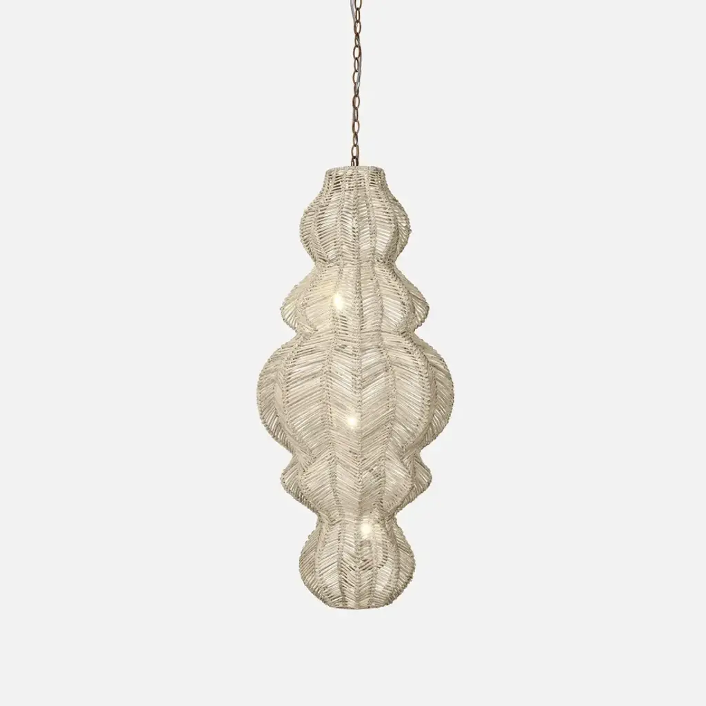 This elongated pendant chandelier is as timeless as it is unique. Sculpted and woven from natural rattan to form an abstractly striking shape. Sourced from a climbing palm tree mostly found in Southeast Asia, no two strands are exactly alike, resulting in natural variations in each piece.