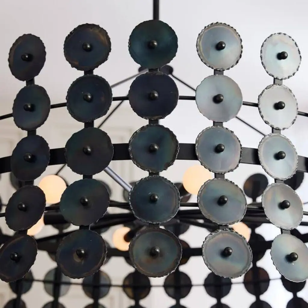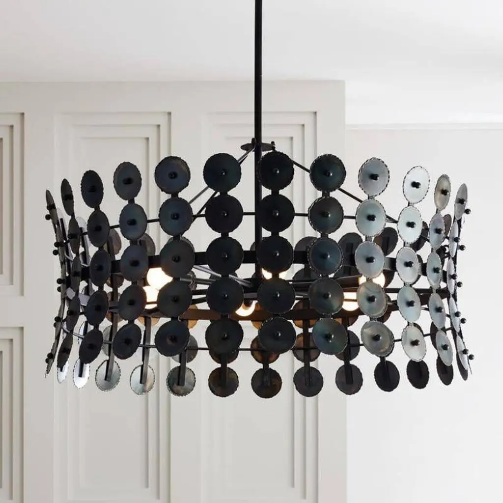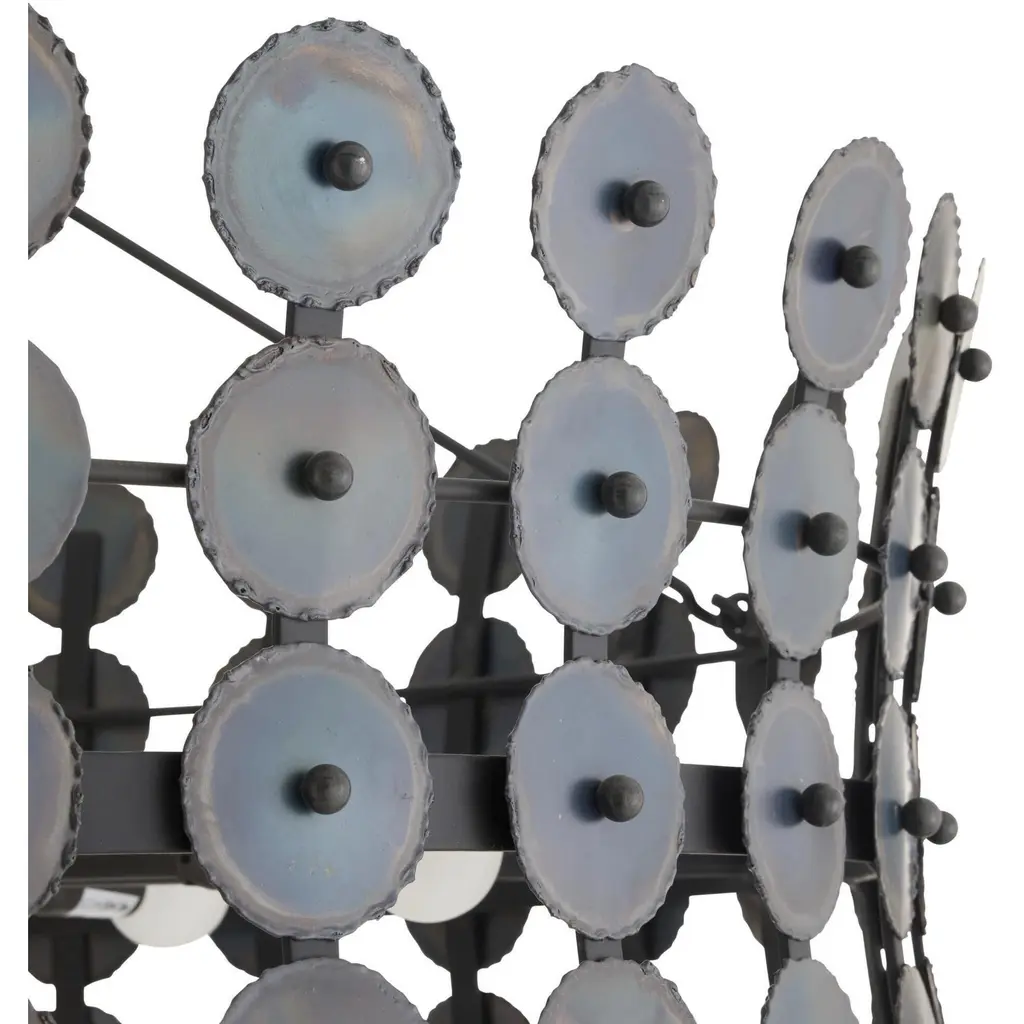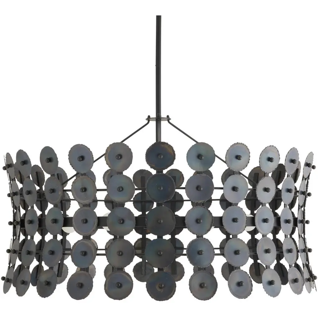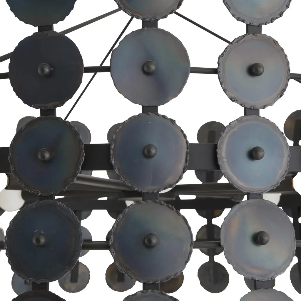 The rhythmic repetition of circles adds pleasing symmetry to a fixture of burnt iron. Hung from a matching iron pipe, the hourglass shape is enhanced with hand-torched details that add a subtle gradation effect. Damp-rated, although limited covered outdoor conditions may affect finish. Finish will vary.