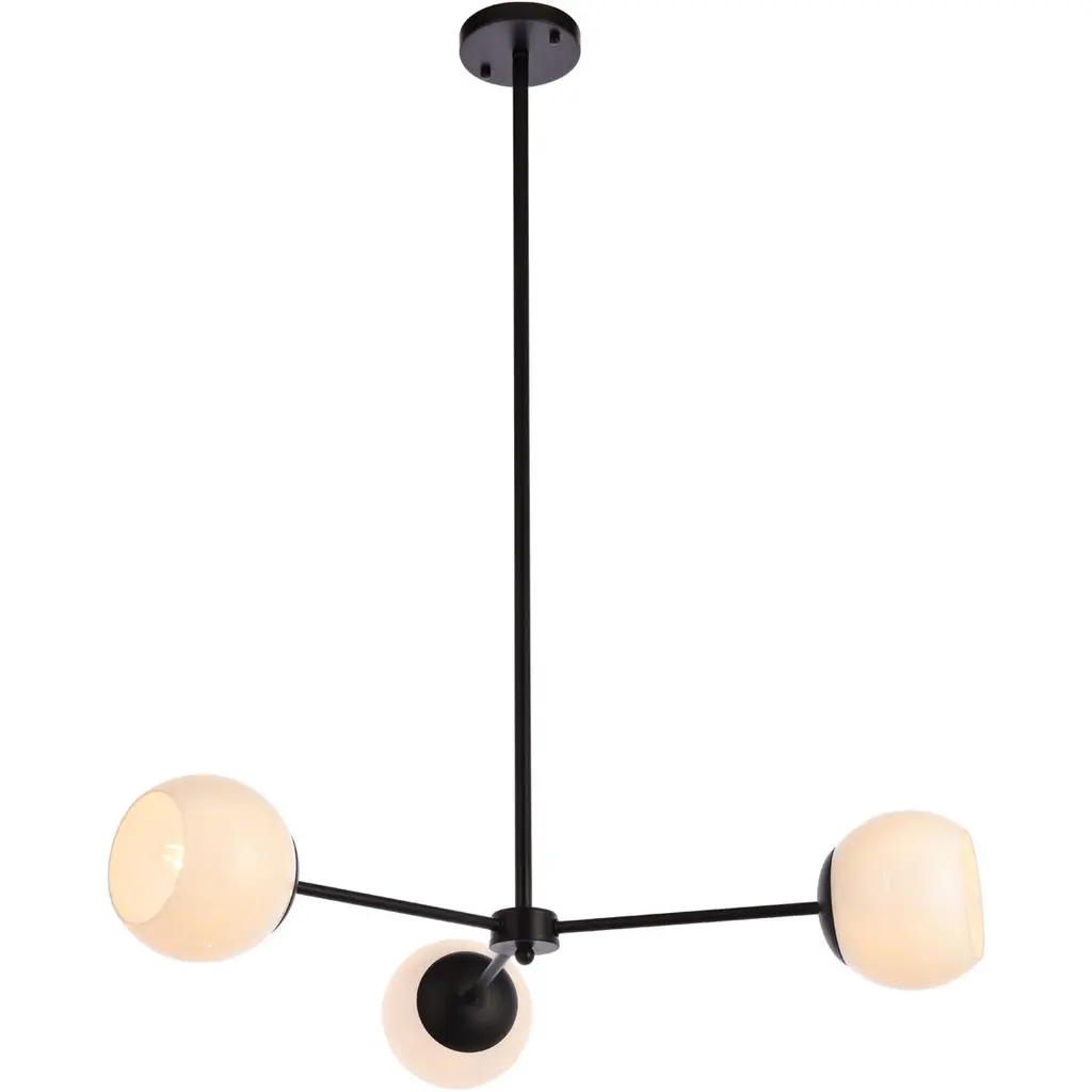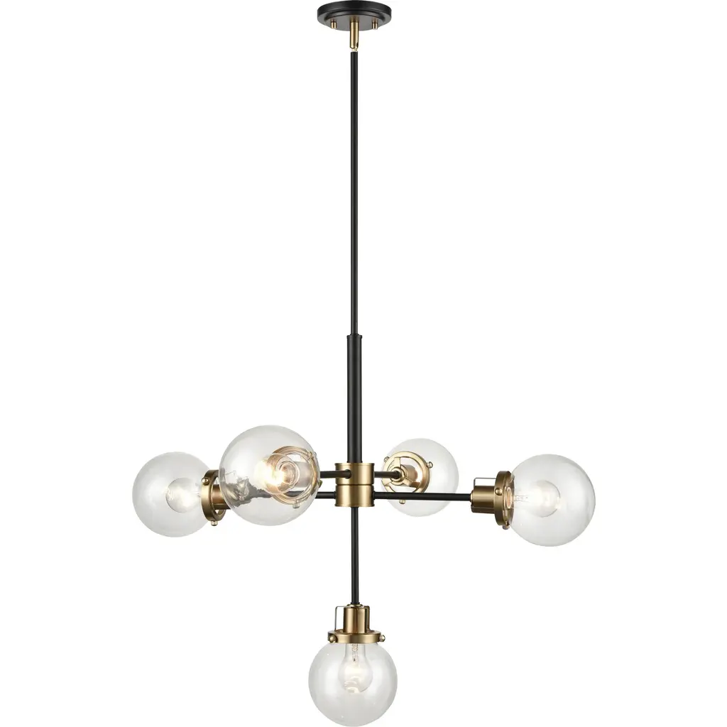The Incantare Chandelier by Huxe catches the eye with its clean lines and subtle styling. A smooth circular canopy drops a downrod that ends in a tubular stainless-steel form. Two slender beams traverse the tube, each one holding glass spheres at both ends. Inside the spheres, incandescent lamping emits a clean glow, dispersing the glare-free, ambient light in every direction. Its modular silhouette lends a striking and grounded statement, while its sleek lines bring a delicate visual balance.