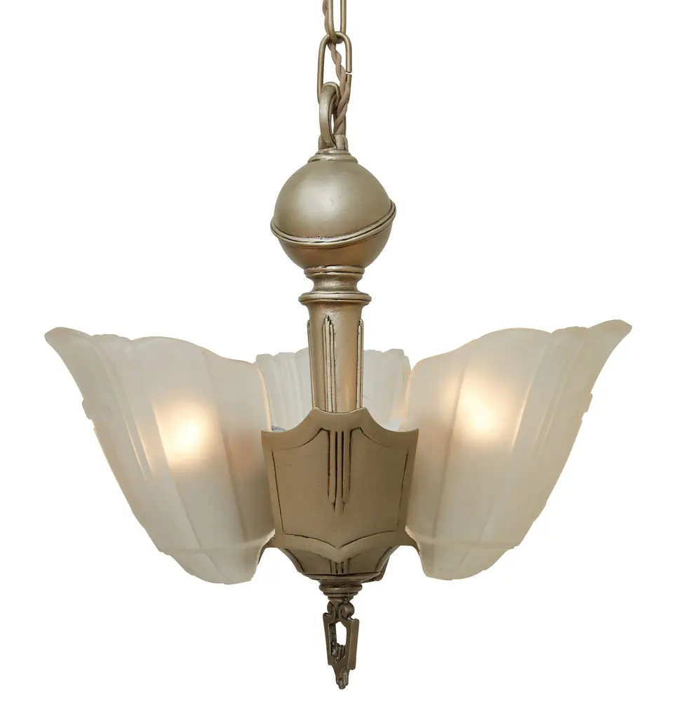 Interesting Vintage Art Deco 3 Light Chandelier With Cast Body And Clear Etched Slipper Shades