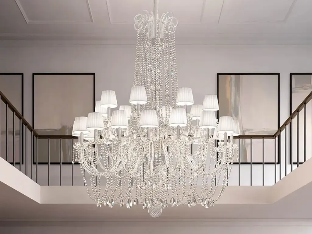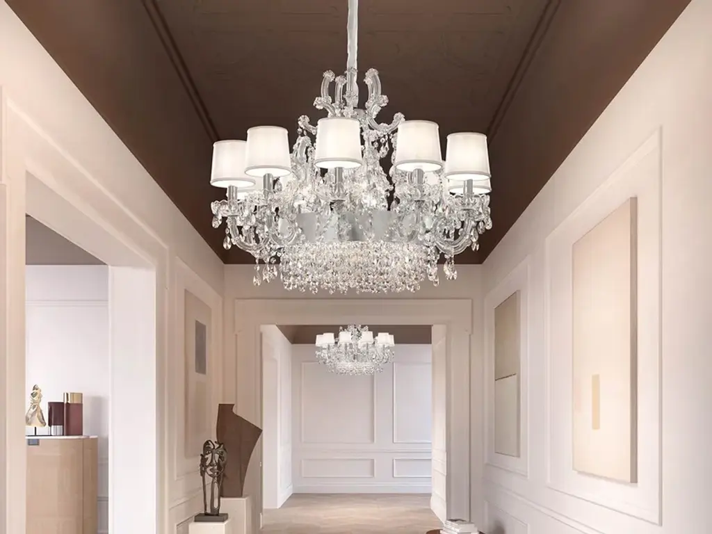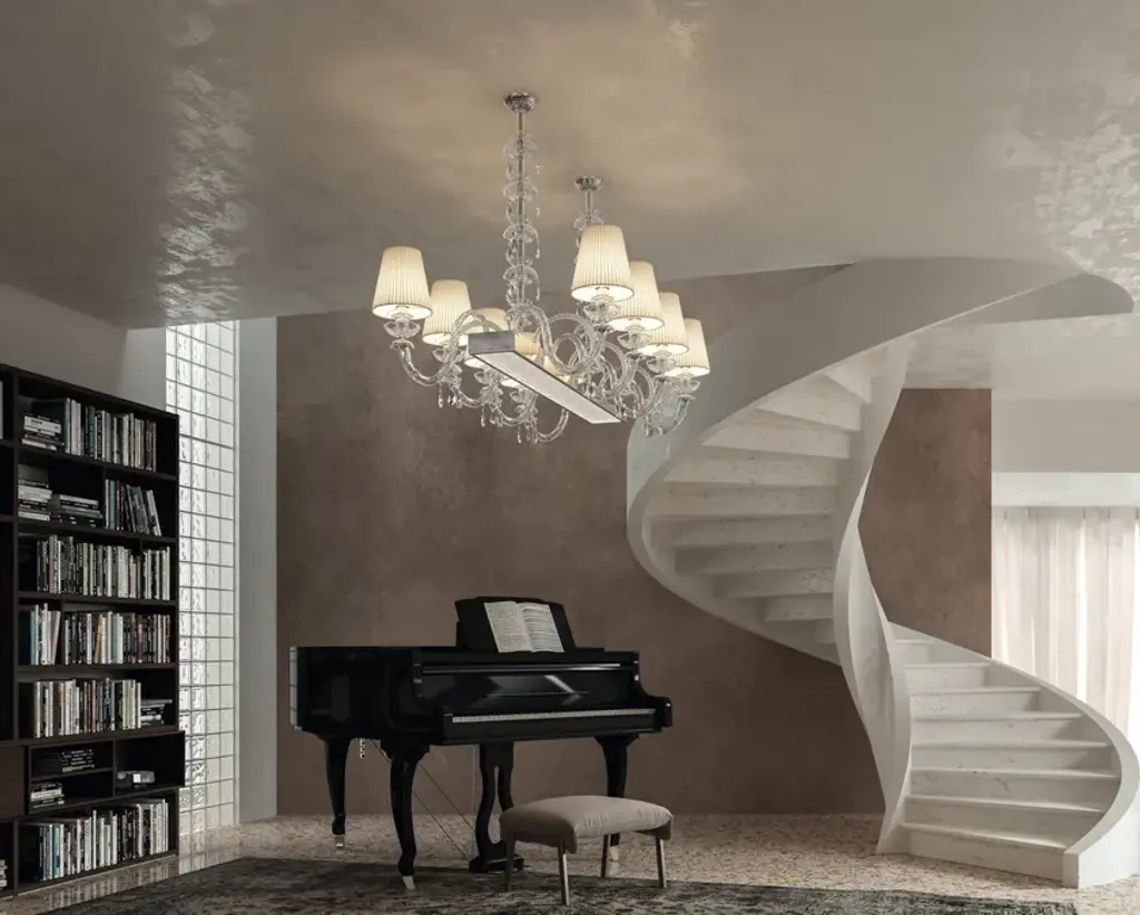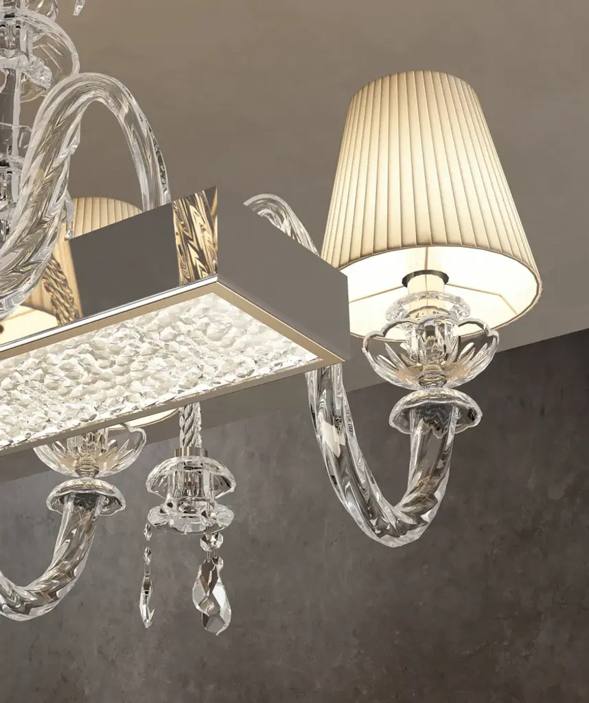 Light source:E14 (US E12) halogen energy saving - E14 (US E12) LED bulbs - 4000° K LED strip.Available finishes: 24 carat matt gold, Tortora. Blown Murano glass: Transparent, Smoke, Amber. Available lampshades: Plissè ivory.Beauty plays the aristocrat, choosing paths which reveal vivacious flashes of light and transparency. Patrizia Volpato presents Intrecci, a line dedicated to those who live elegance and who are also able to appreciate at the same time the freedom of composition enclosed within a pattern. The lines chase each other as only dreams can do and in an instant become poetry.