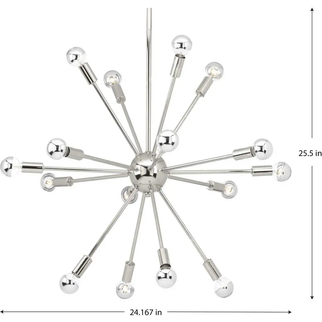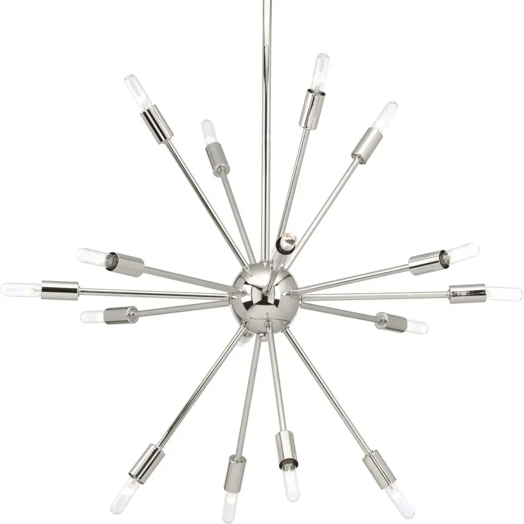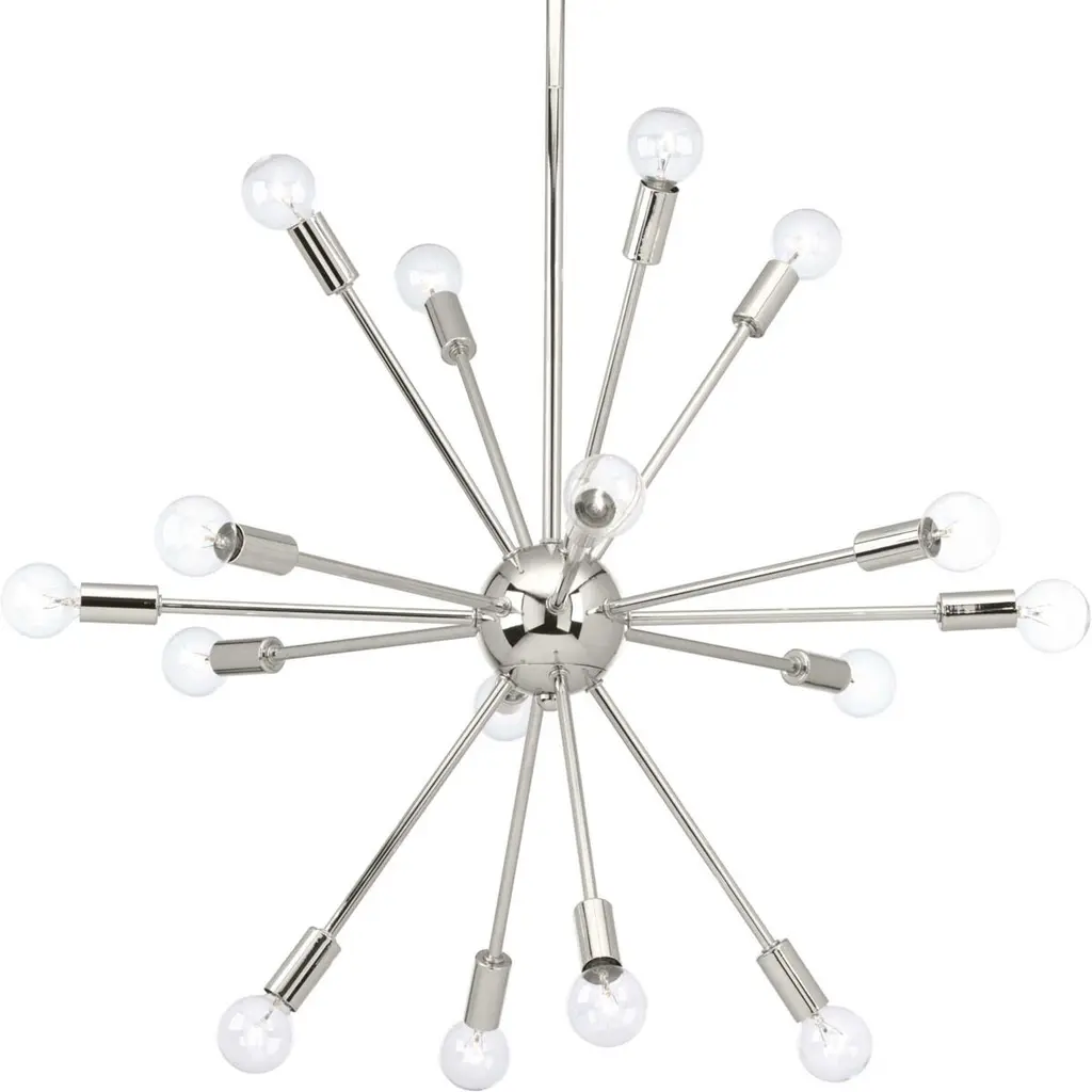 Featuring a Polished Nickel finish, these Space-Age inspired chandeliers boast sixteen lights, each extending to support a single candelabra lamp. Additionally, Ion chandeliers are stunning for mid-Century inspired interiors. This fixture is part of our Design Series collections and pairs nicely with our Elevate Collection.