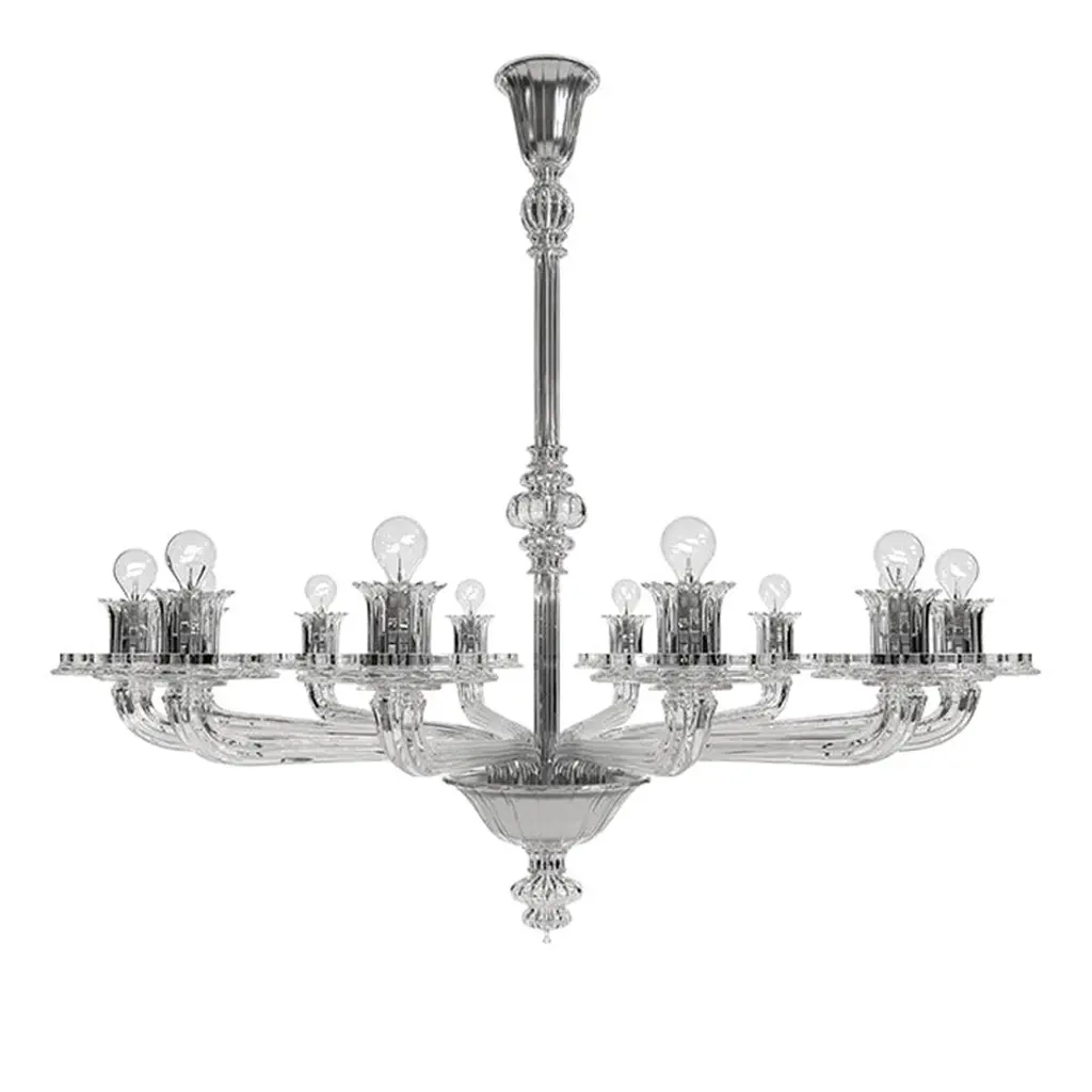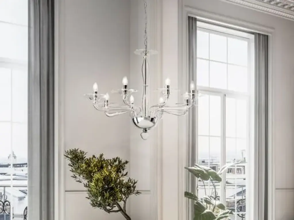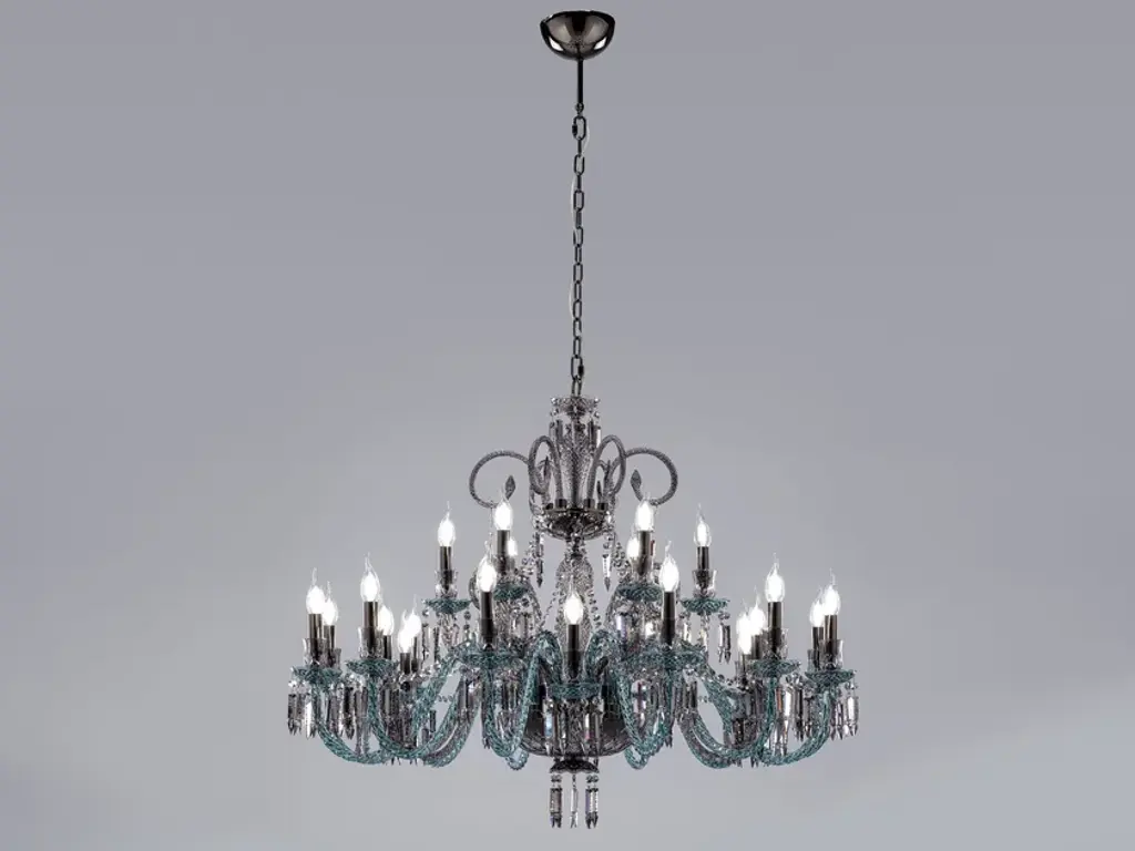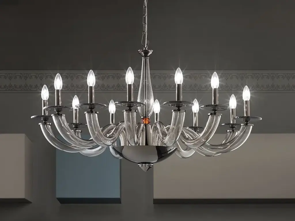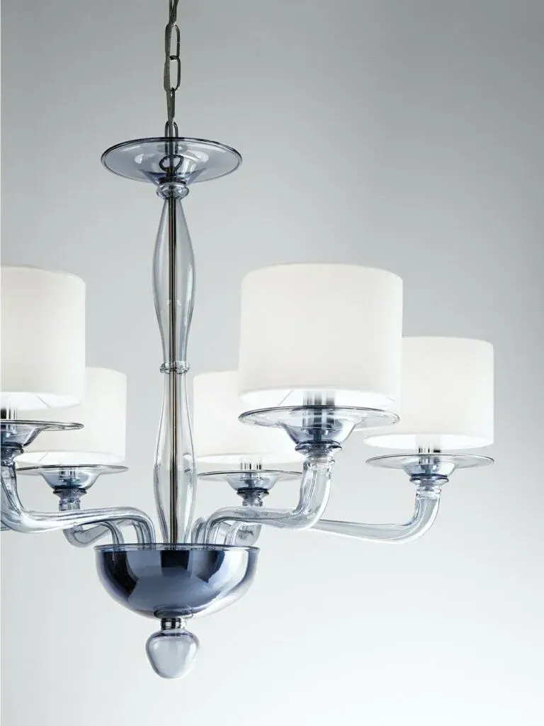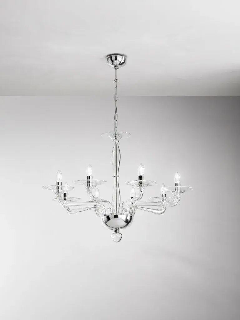 Isabel is a chandelier in blown glass, an object meticulously worked, selecting a range of metallic finishes, glass colours and precious details that make it unique and handcrafted.1001/6: 6 bulbs (E14 - 40W)1001/8: 8 bulbs (E14 - 40W)1001/10: 10 bulbs (E14 - 40W)1001/12: 12 bulbs (E14 - 40W)Lampshades sold separately.