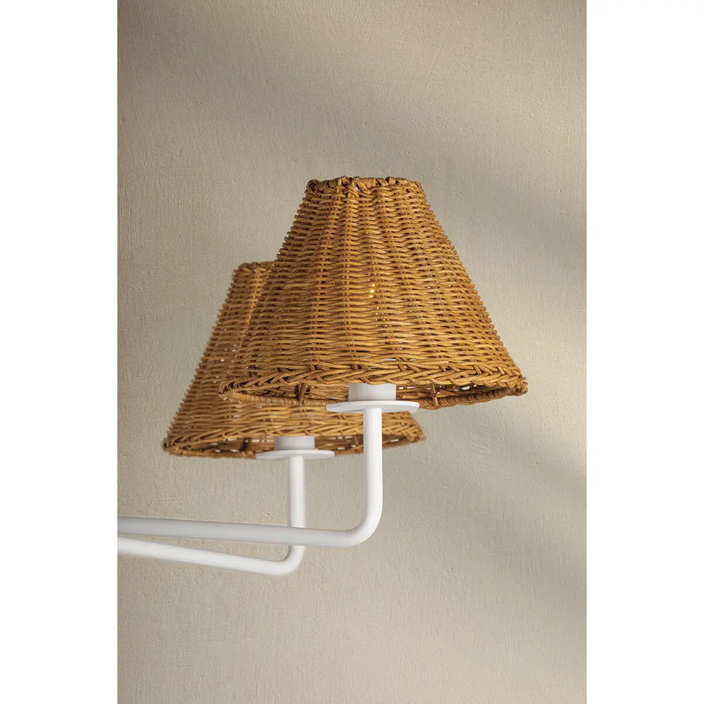 Issa has a natural style that's ahead of the curve. Slender, hooked arms hold a woven rattan shade that lets a soft light filter through. The aged brass or textured white finish is the perfect complement to the natural shade and adds to the fixture's overall earthy feel. Available as a chandelier, wall sconce or portable sconce, there's a place for Issa in every space.