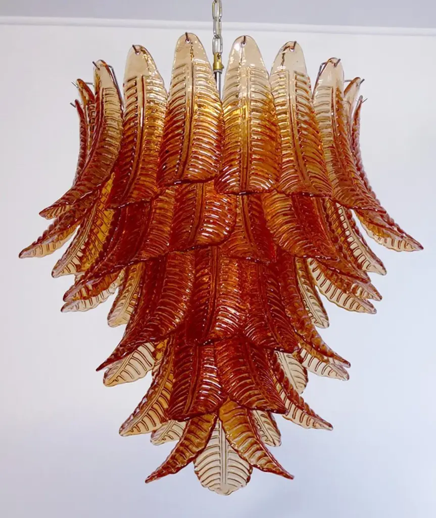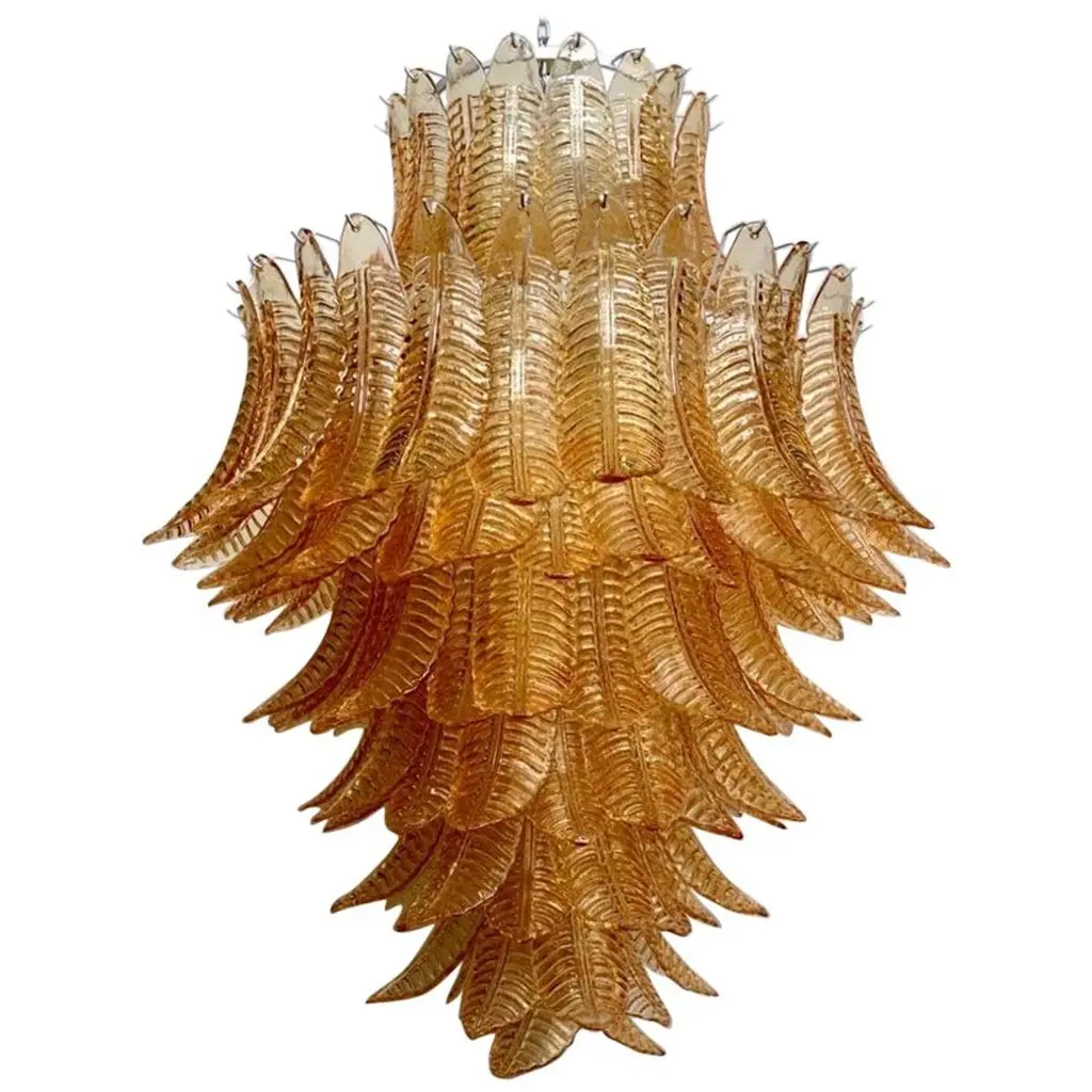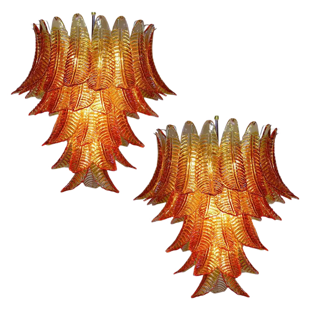 Beautiful and huge pair of Italian Murano chandeliers each composed of 52 splendid amber glasses that give a very elegant look. The glasses of this chandelier are real works of art, the weight of this chandelier is 45 kg. Dimensions: 61 inches (155 cm) height with chain; 33.45 inches (85 cm) height without chain; 31.50 inches (80 cm) diameter. Dimension glasses: 13 inches (33 cm) height; 4.55 inches (11.5 cm) width. Light bulbs: Eight light bulbs E14 dimension (not included in the sale). Up to 250V (Europe/UK Standard).The wiring of this item may be original and might need replacement, if not specified otherwise.