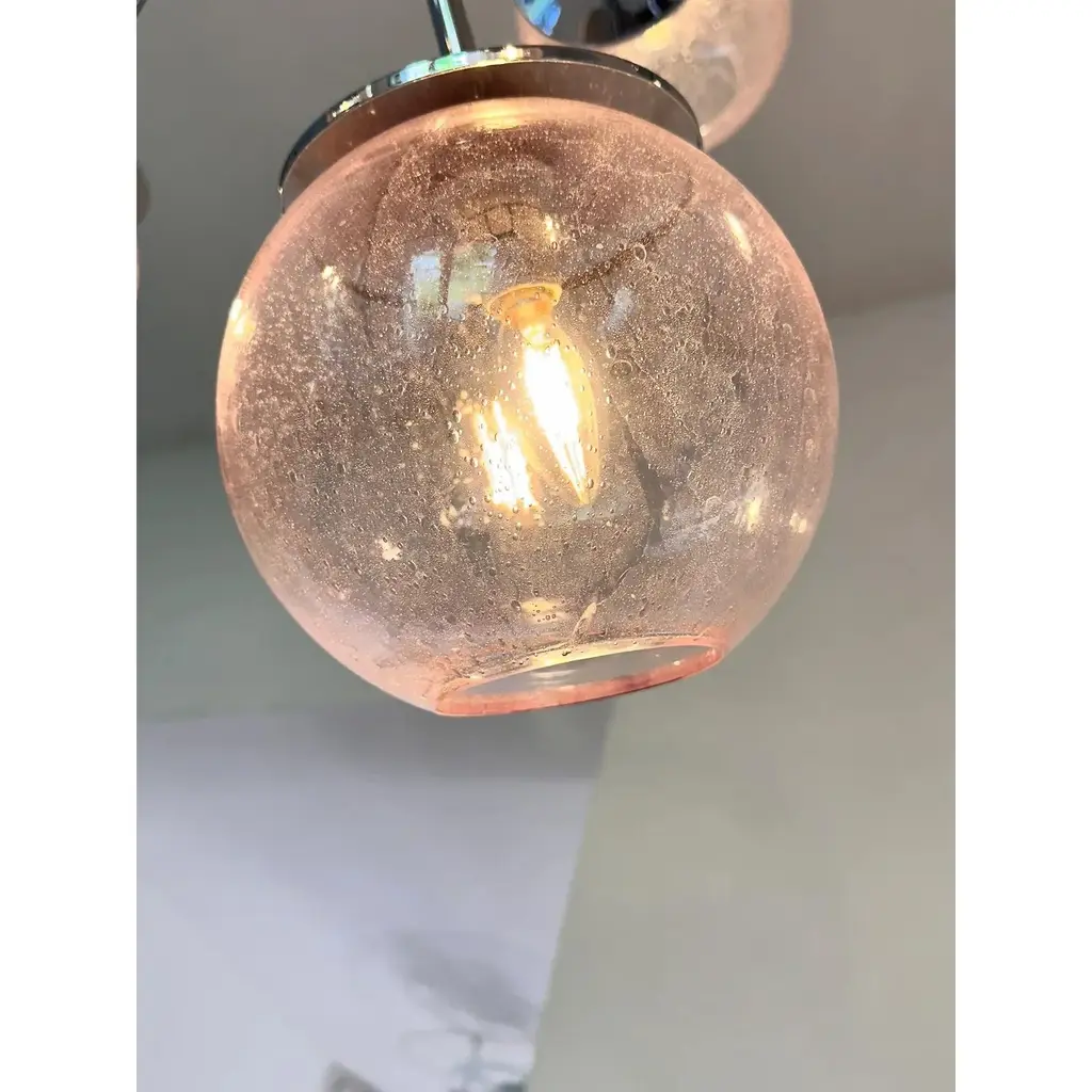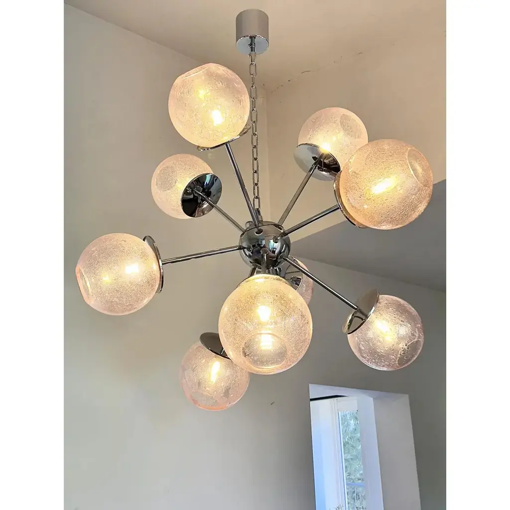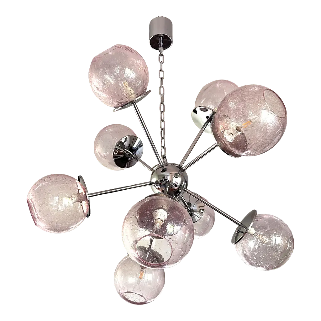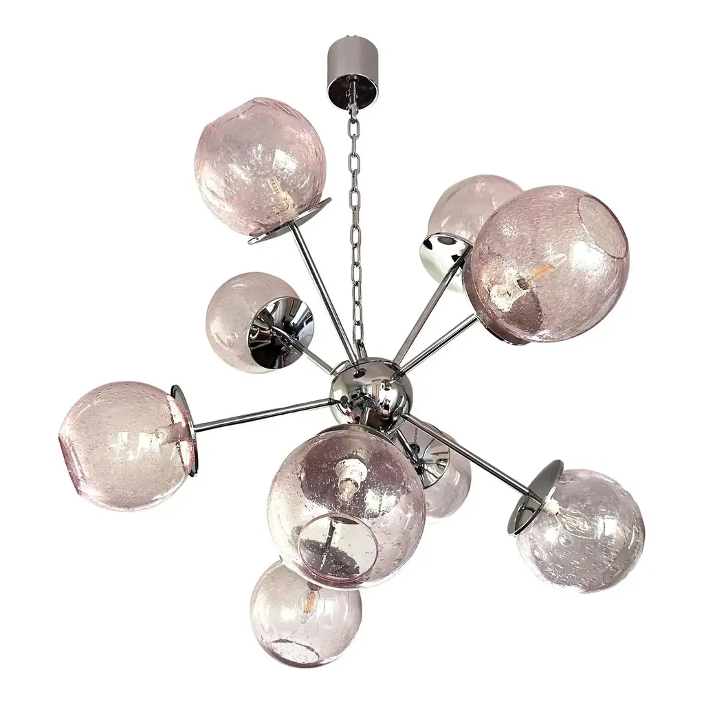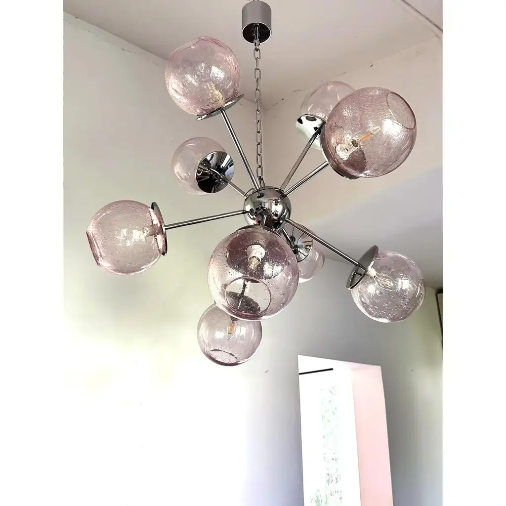 Luxury sputnik chandelier with pink spheres in Murano glass .”Pulegoso” is a traditional working of Murano glass that make bubbles inside. It is very bright. and scenographic. Hight quality of details. 9 bulbs for hight and low light. one sphere spare part included Metal frame in a bath of chrome. Exclusive design by Simoeng, fruit of hight italian craftmanship, All made in Murano glass. Diameter 90cm/35.4″ 9 lights, bulbs not included chain is 50 cm = 19.7″ more canopy Up to 250V (Europe/UK Standard).