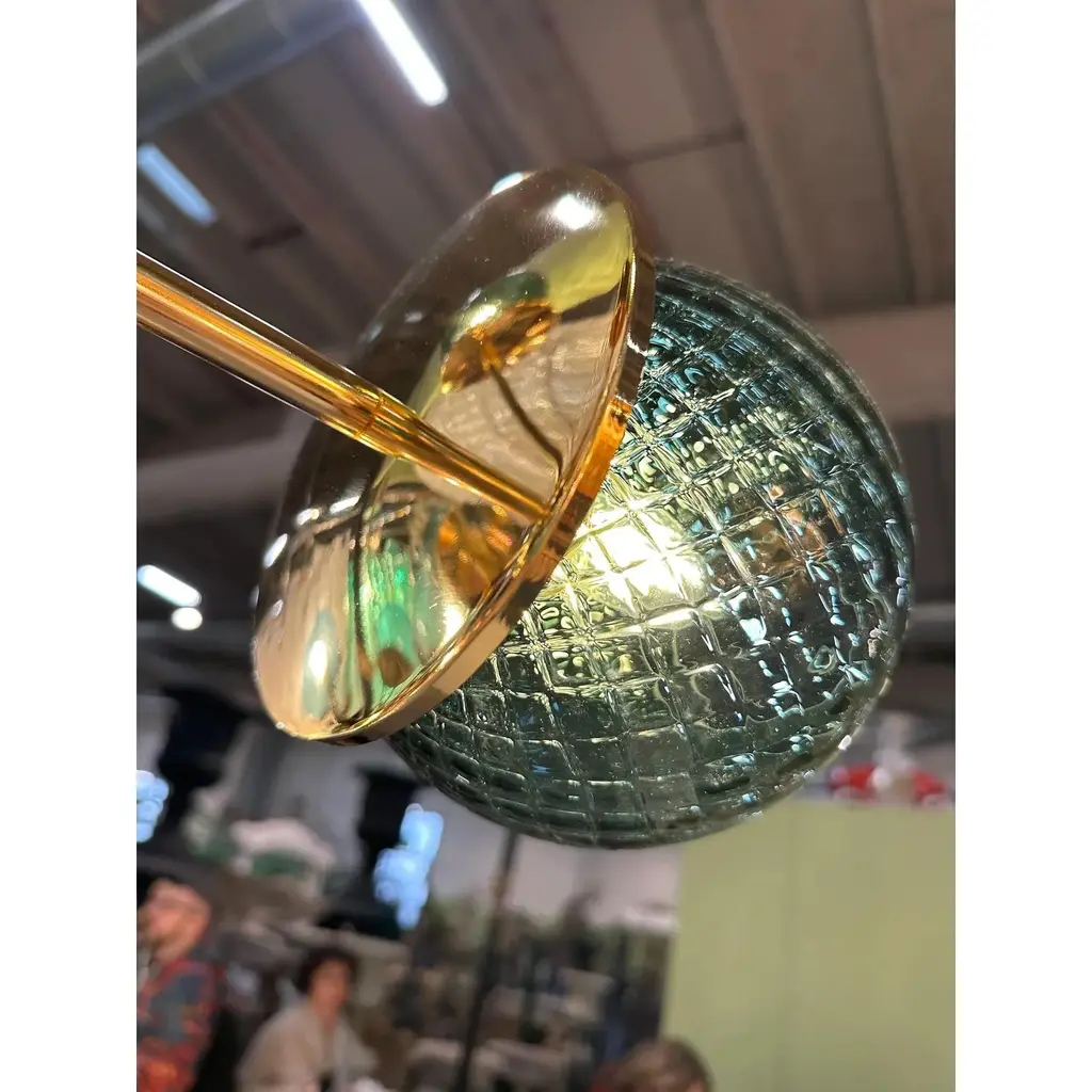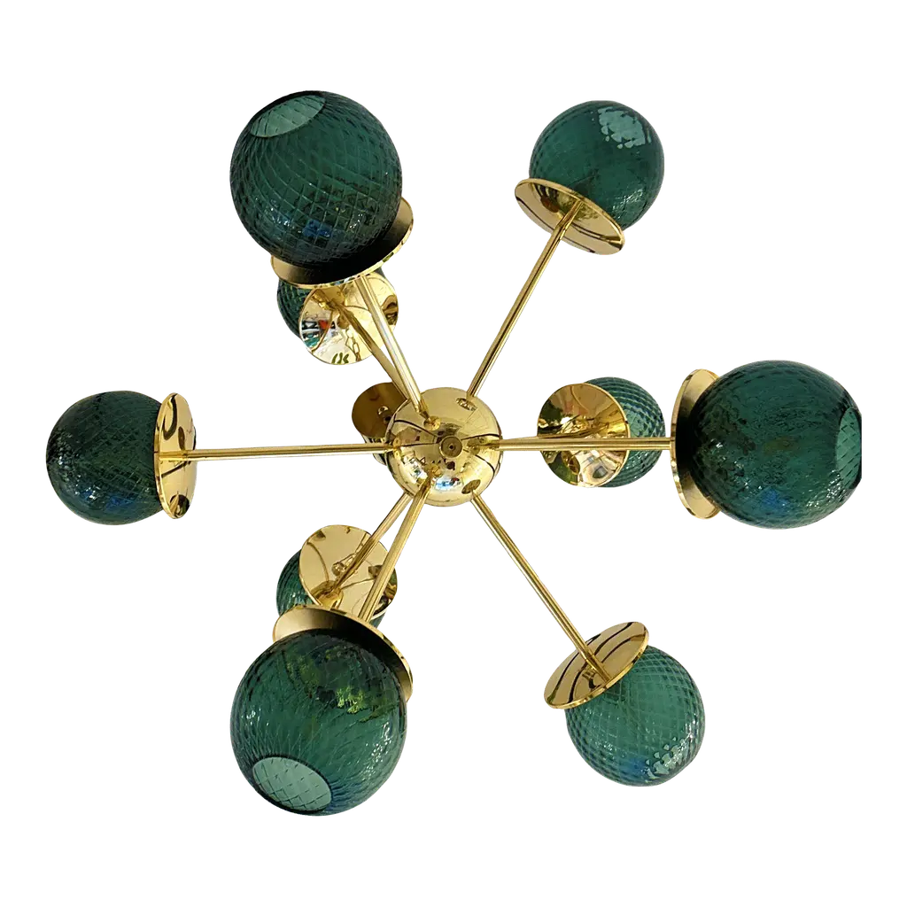 Scenographic sputnik chandelier with green- spheres in Murano glass ."ballotton" is a traditional working of Murano glass. The green is very bright.9 bulbs for hight and low light. Metal frame in a bath of gold 24k. Exclusive design by Simoeng, fruit of hight italian craftmanship, All made in Murano glass. Diameter 90cm/35.4" 9 lights, bulbs not included chain is 50 cm = 19.7″ more canopy Up to 250V (Europe/UK Standard).