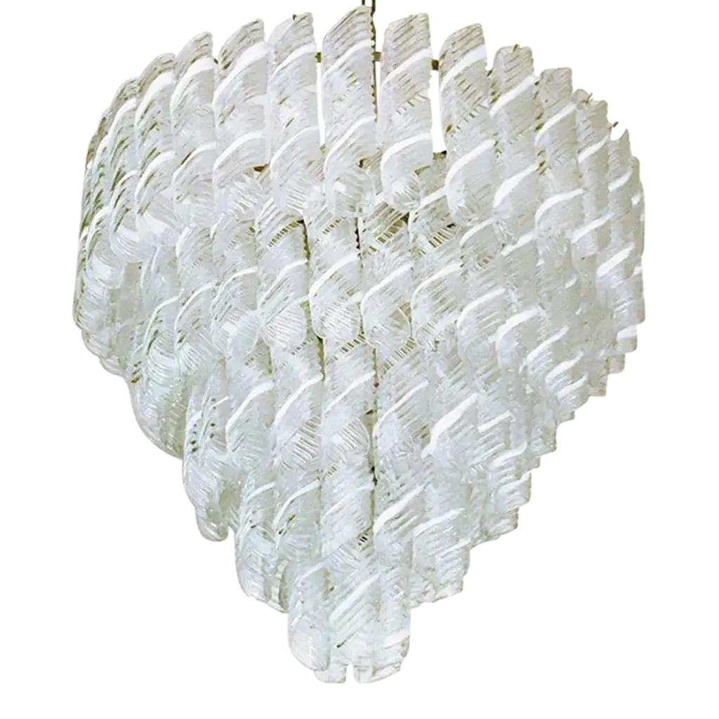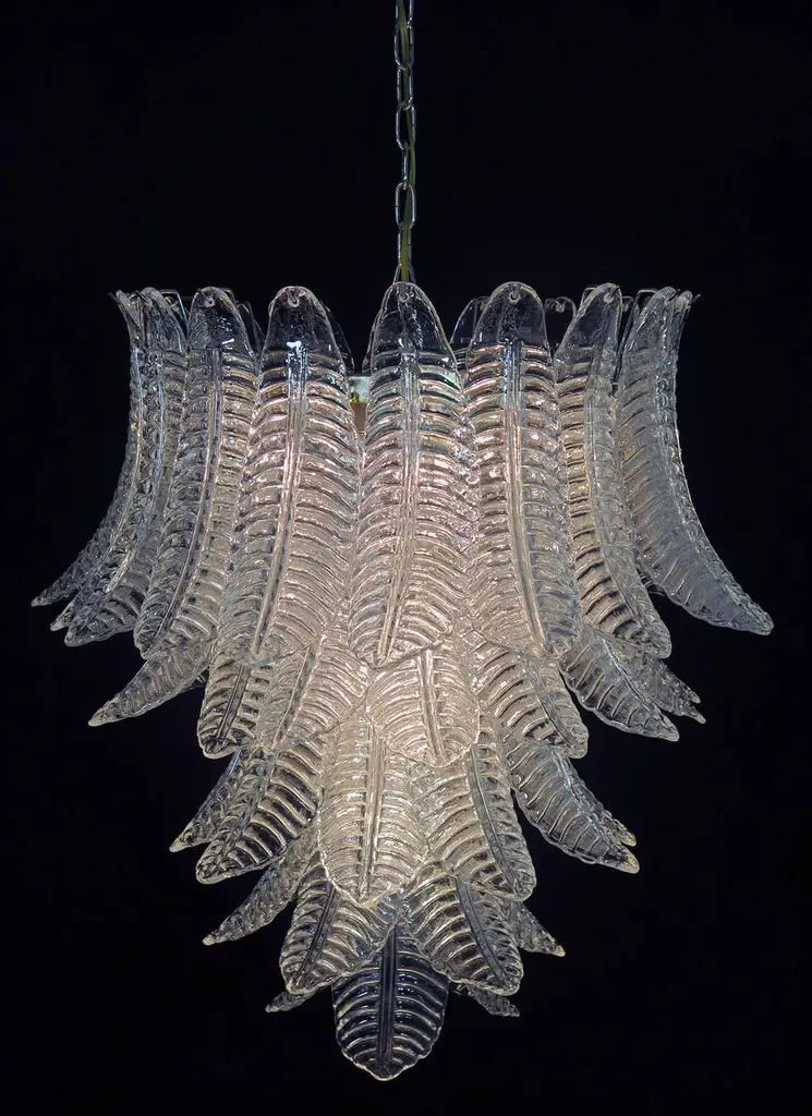 Pair of beautiful and huge Italian Murano chandeliers each composed of 52 splendid transparent glasses that give a very elegant look. The glasses of this chandelier are real works of art; the weight of this chandelier is 45 kg. Dimensions: 61 inches (155 cm) height with chain; 33.45 inches (85 cm) height without chain; 31.50 inches (80 cm) diameter. Dimension glasses: 13 inches (33 cm) height; 4.55 inches (11.5 cm) width Light bulbs: requires eight light bulbs: E14 dimension (not included in the sale). Up to 250V (Europe/UK Standard).The wiring of this item may be original and might need replacement, if not specified otherwise.