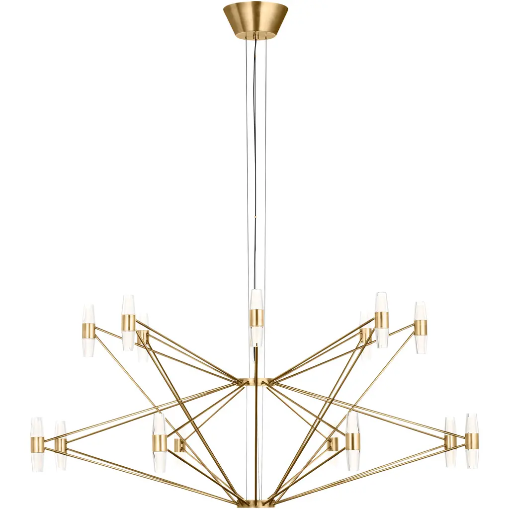 Wildly sculptural chandelier shown in un-lacquered natural brass with ivory shades fabricated in Italy by Fabio Ltd. This is a modern, contemporary interpretation of a classic chandelier, strongly influenced by Italian Mid-Century Modernism such as maker Stilnovo.Lampshade color may be specified by RAL color code. Our standard colors are shown in the final image there is no additional lead time or cost for these colors. Total dimensions as shown are 35.5" diameter and 39.5" overall height, but can be customized to suit your space.This piece may use any 16 E14 candelabra base bulbs up to 40 watts each (or use LED). Bulbs are not included.Order reference #: FABIOLTD C859 IVORY