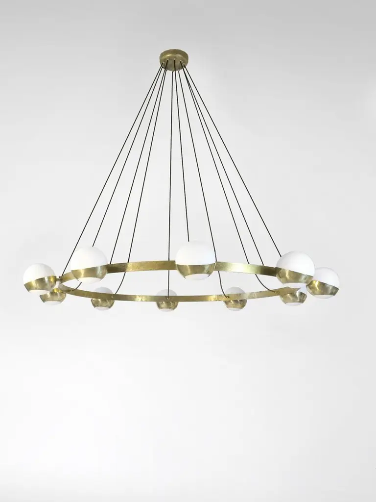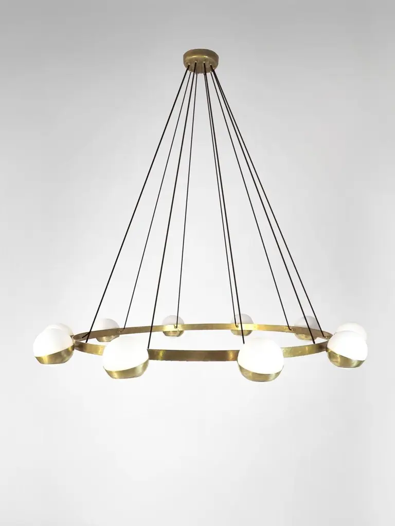 Elegant sculptural chandelier shown in un-lacquered natural brass with opaline milky glass globes fabricated in Italy by Fabio Ltd. This is a modern, contemporary interpretation of a classic chandelier, strongly influenced by Italian Mid-Century Modernism such as maker Stilnovo.Total dimensions as shown are 47" diameter and 39.5" overall height, but can be customized to suit your space.This piece may use any 10 E14 candelabra base bulbs up to 40 watts each (or use LED). Bulbs are not included.Order reference #: FABIOLTD C860