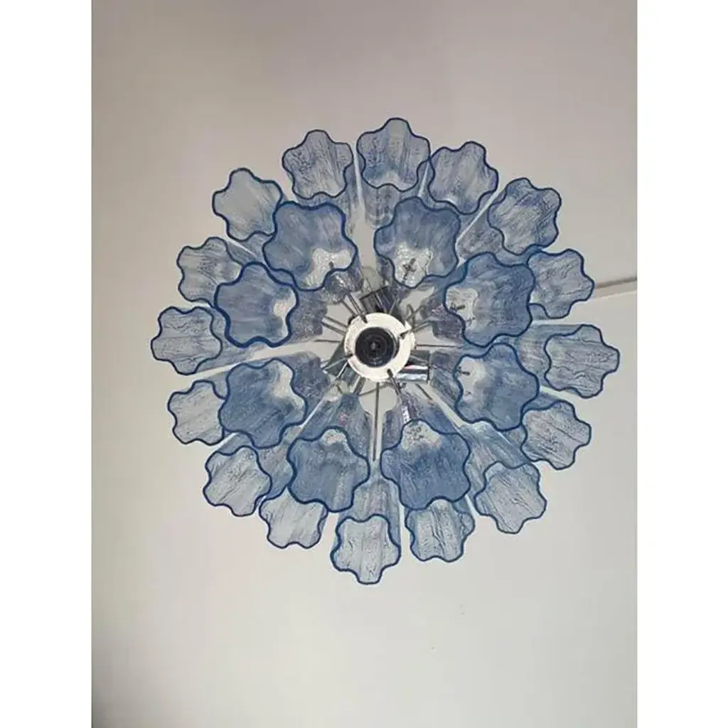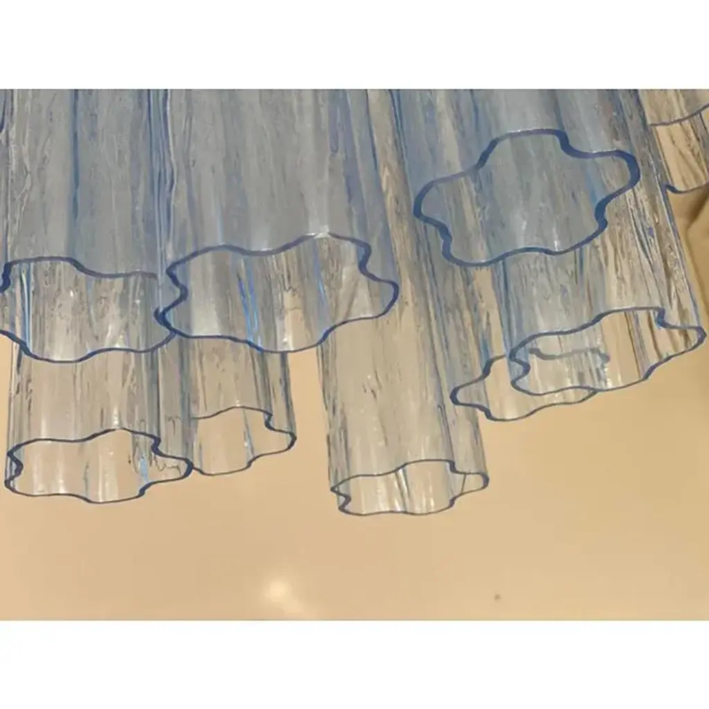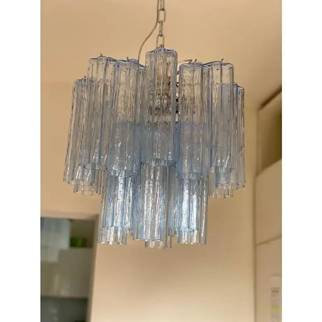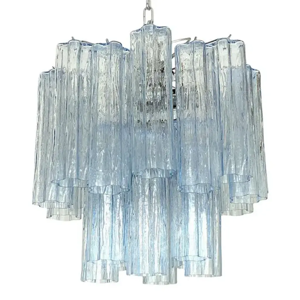 Contemporary lively murano glass “tronchi” chandelier "tronchi" element of murano glass decorated in light-blue. all made in italy, ship from italy chrome metal frame spare parts are included. Bulbs not included, they are compatible with led sustainability. entirely made in italy, made in murano glass fruit of of high italian know-how. dimensions (cm/in): d 50 cm h 40cm/ d 19.7″ h 15.7″ chain 19.7″ more canopy us plug (up to 110v).