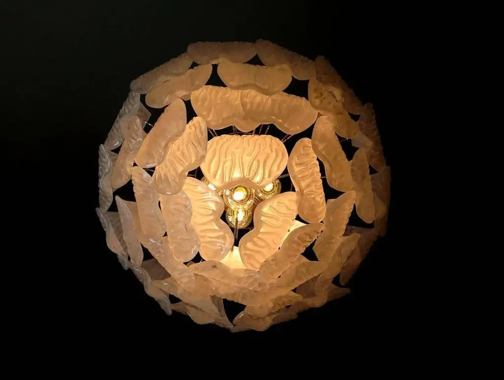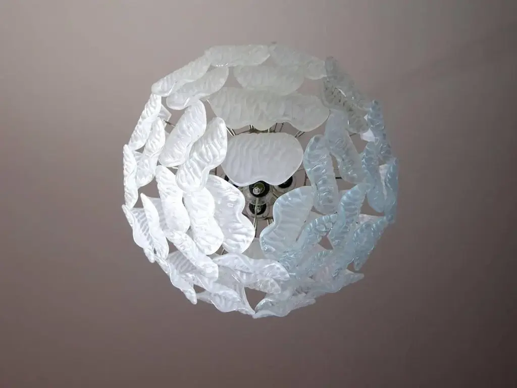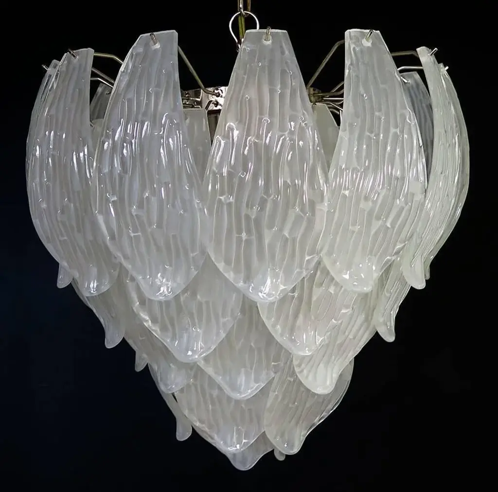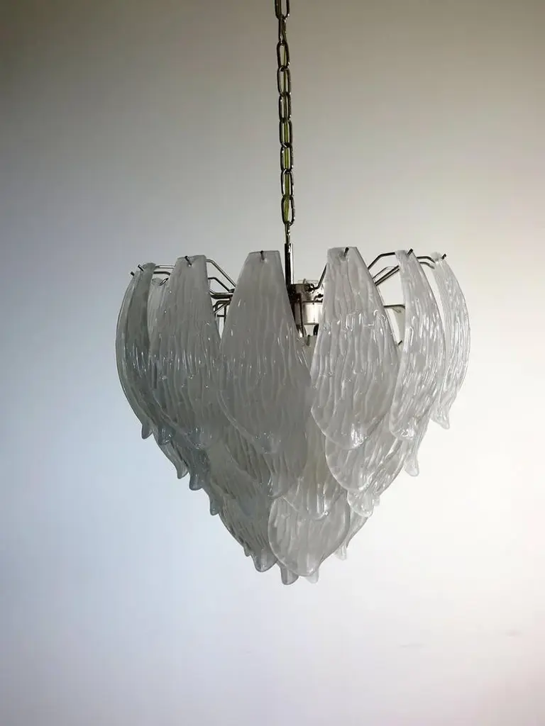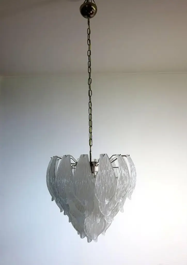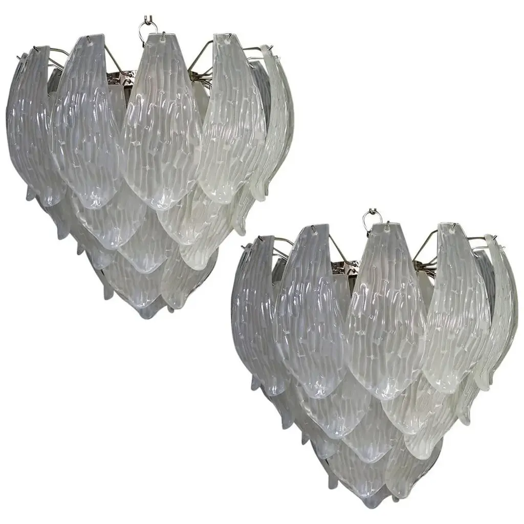 Pair of huge Italian vintage Murano chandelier made by 41 handblown transparent frosted carved glass leaves in a chrome frame. Dimensions: 49.20 inches (125 cm) height with chain; 25.80 inches (68 cm) height without chain; 21.25 inches (54 cm) diameter. Dimension glasses: 9.85 inches (25 cm) height; 4.75 inches (12 cm) width. Light bulbs: Five light bulbs: E14 dimension (not included). Up to 250V (Europe/UK Standard).The wiring of this item may be original and might need replacement, if not specified otherwise.