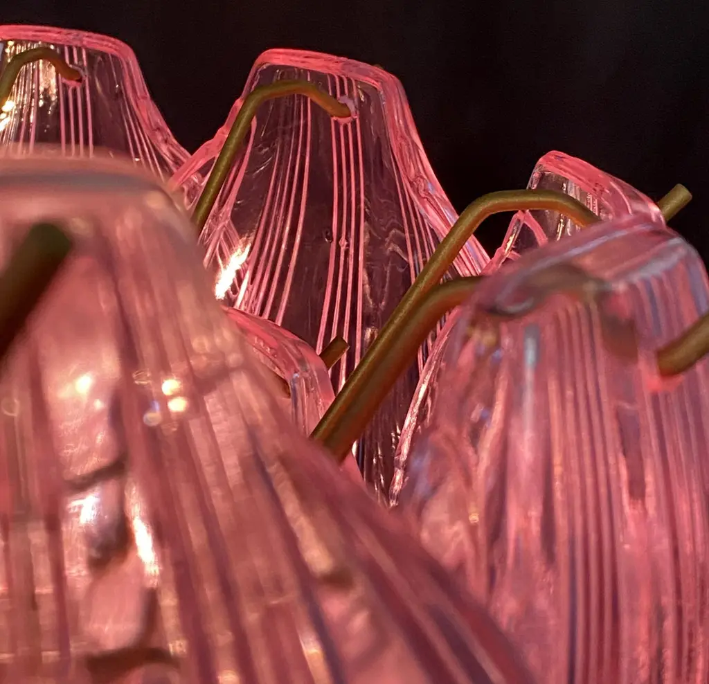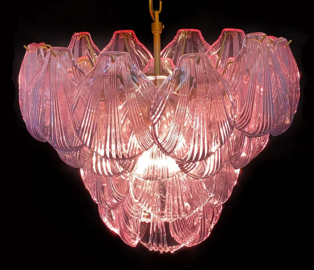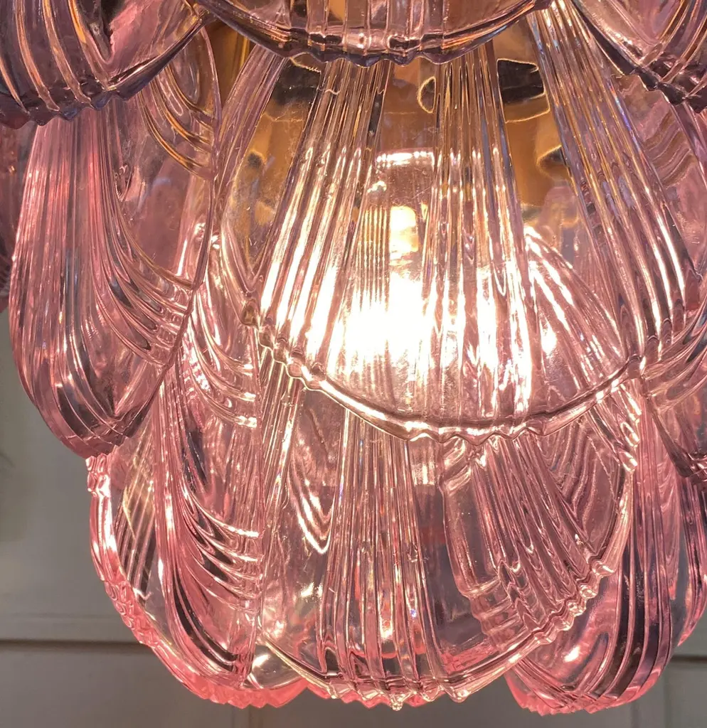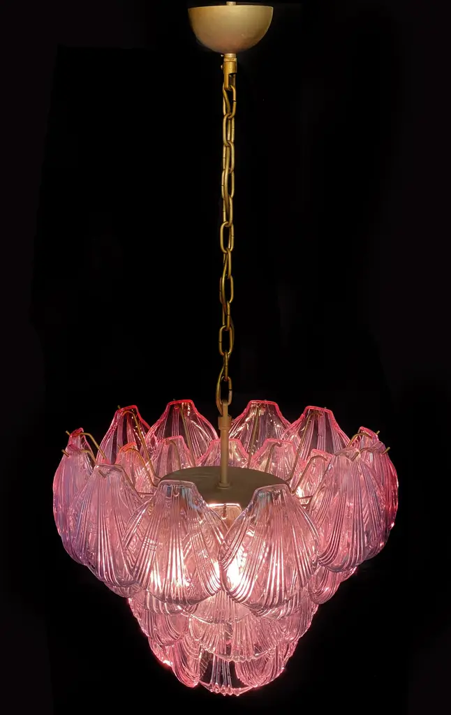 Fantastic chandelier with pink a glasses, gold painted metal frame. It has 36 shell glass. The glasses are very high quality, the photos do not do the beauty, luster of these glasses.Period: Late 20th centuryLight bulbs: 7 light bulbs E 27 dimension (not included in the sale)Condition: Perfect vintage condition and fully working; the glasses are perfect and the chrome has wear consisting in age and use.
