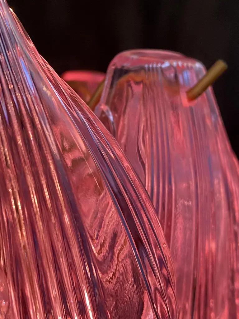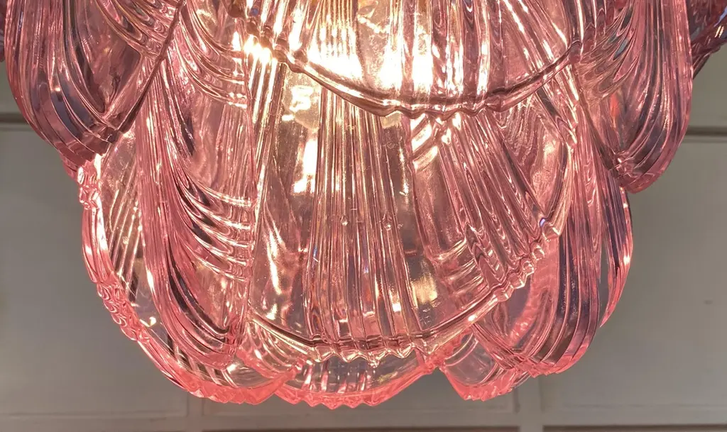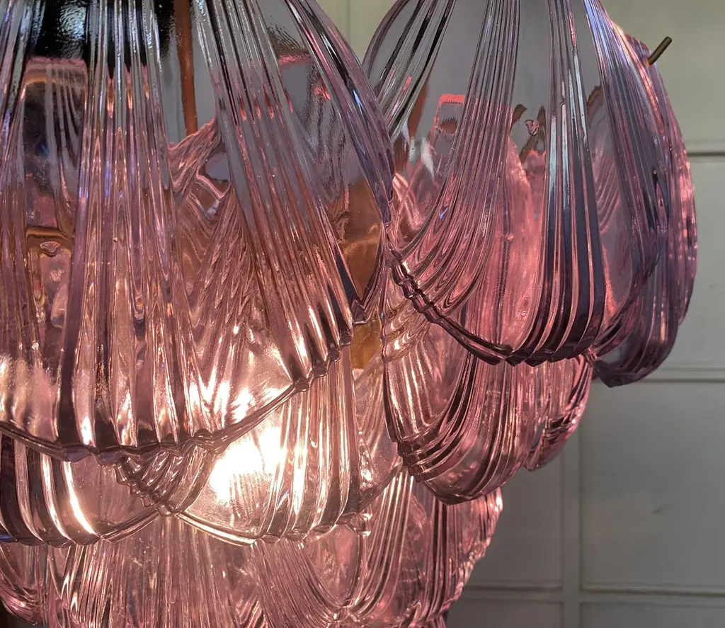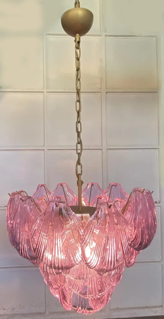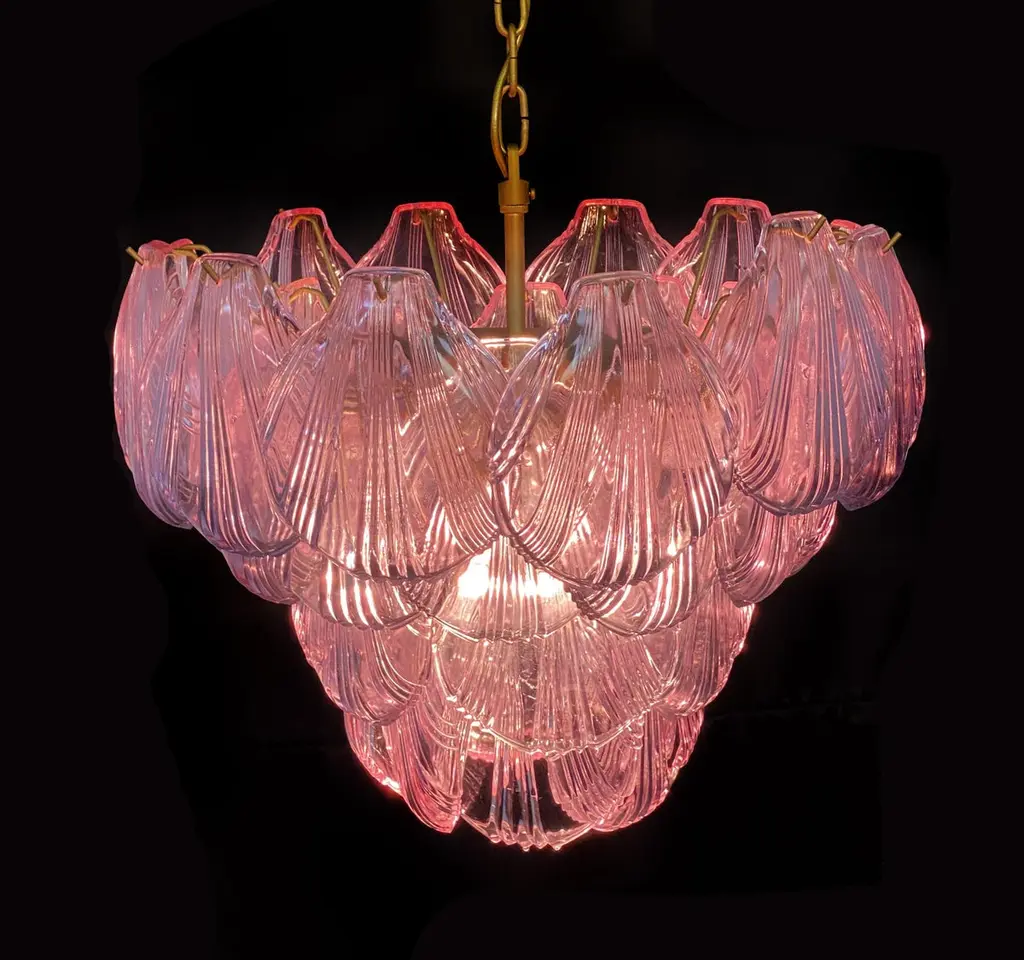Fantastic chandelier with pink a glasses, gold painted metal frame. It has 36 shell glass. The glasses are very high quality, the photos do not do the beauty, luster of these glasses.Period: Late 20th centuryLight bulbs: 7 light bulbs E 27 dimension (not included in the sale)Condition: Perfect vintage condition and fully working; the glasses are perfect and the chrome has wear consisting in age and use.