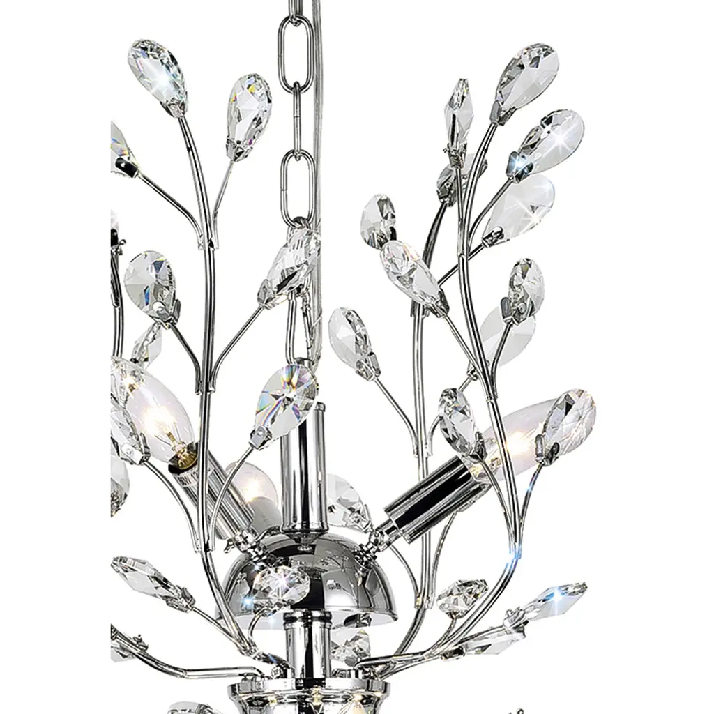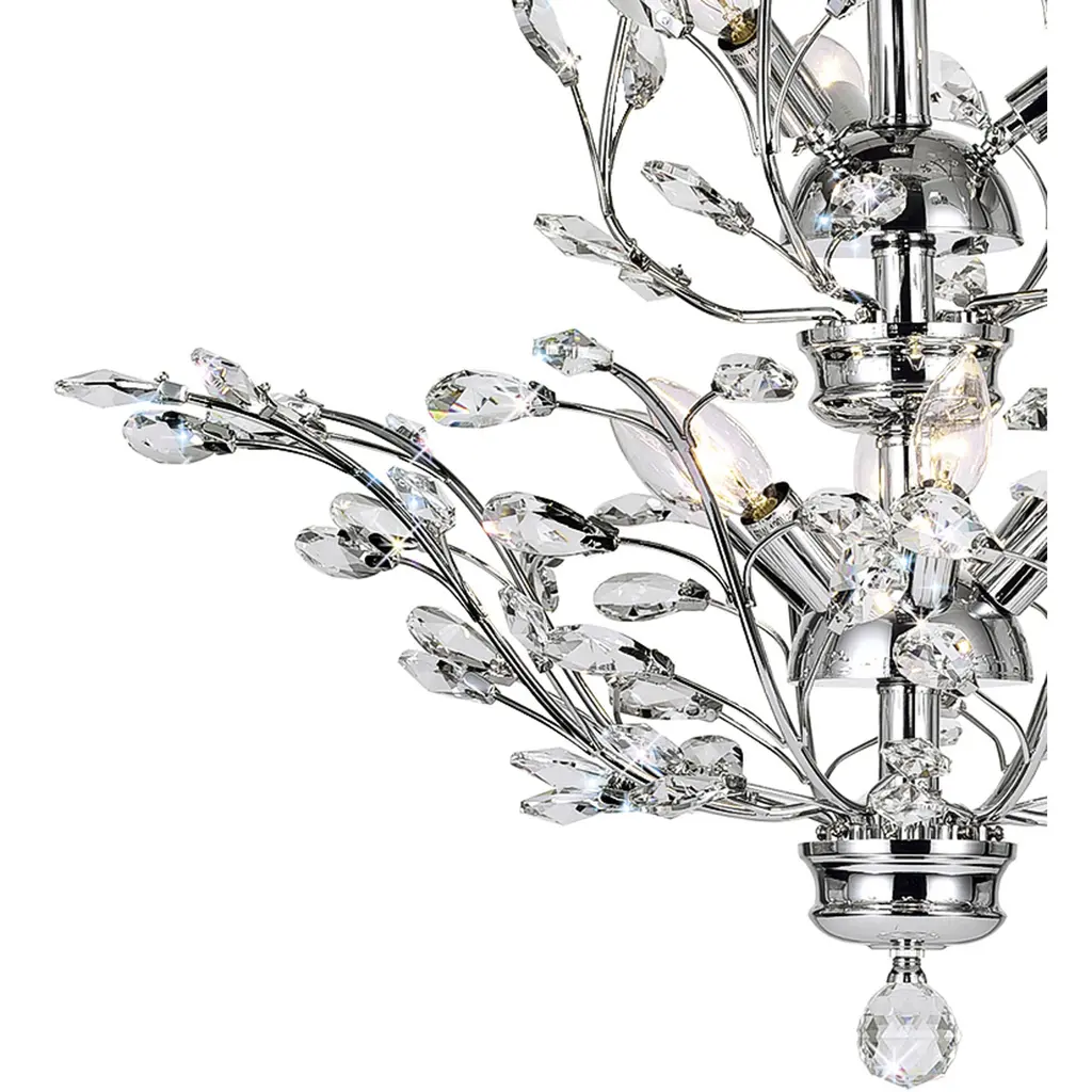 Enhance your space with the Ivy 9-Light Chandelier, featuring elegant chrome-finished branches adorned with shimmering crystal leaves for a touch of sophistication. With a 24-inch height and 28-inch width, this stunning chandelier is perfect for dining rooms, living rooms, or entryways. Its whimsical vine-inspired design adds upscale charm while providing bright, beautiful illumination. Crafted for both style and function, it effortlessly elevates any decor. Upgrade your home lighting with this eye-catching centerpiece that blends luxury and artistry.